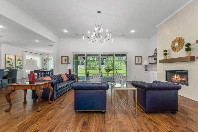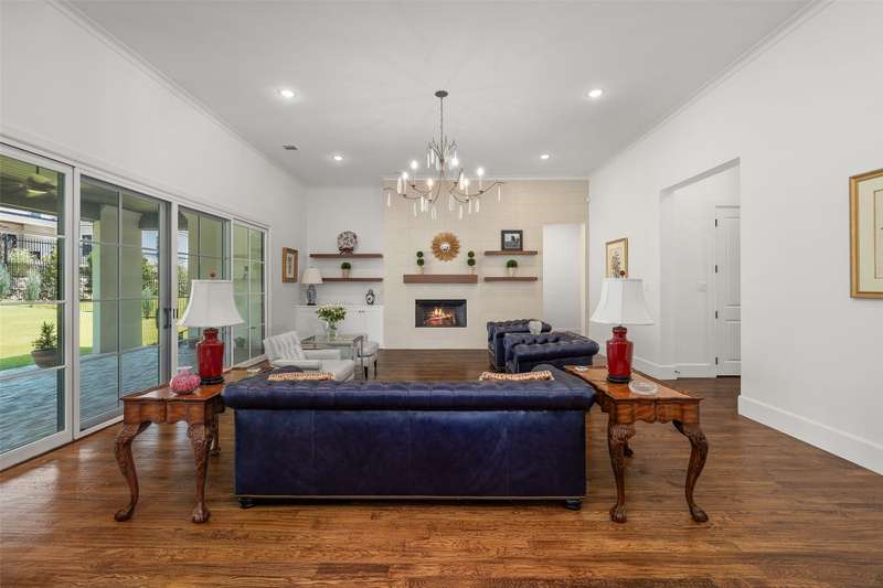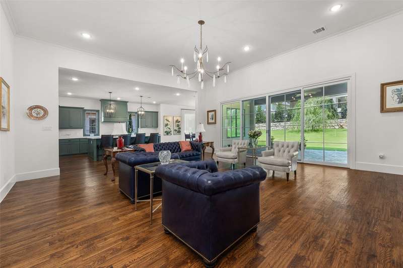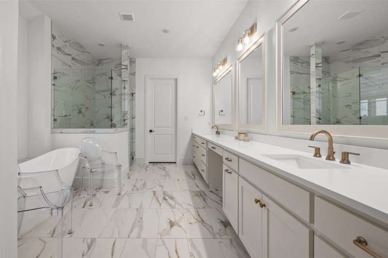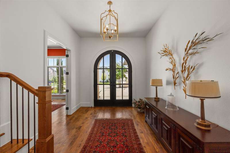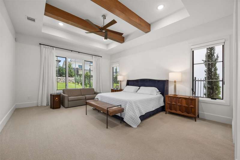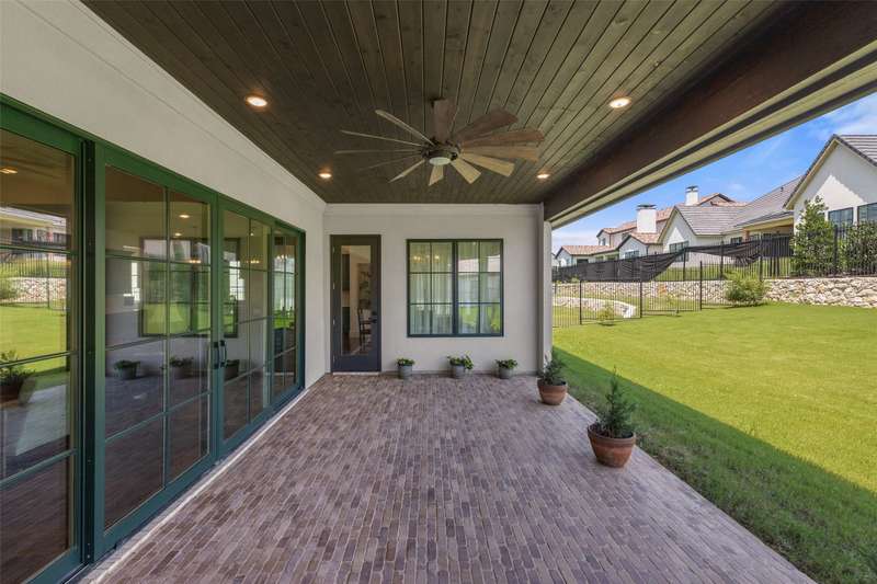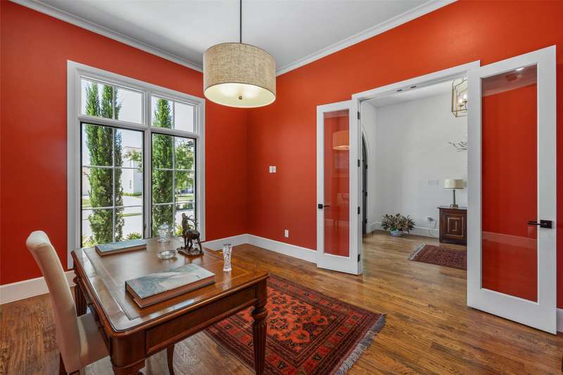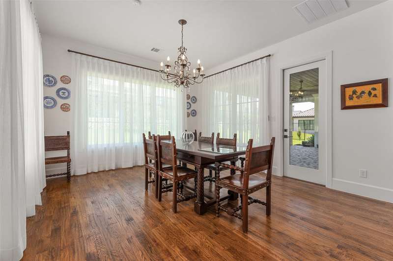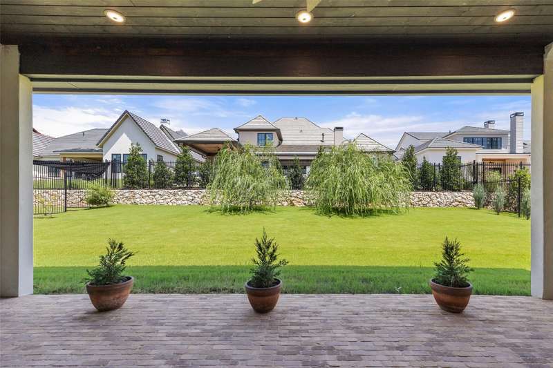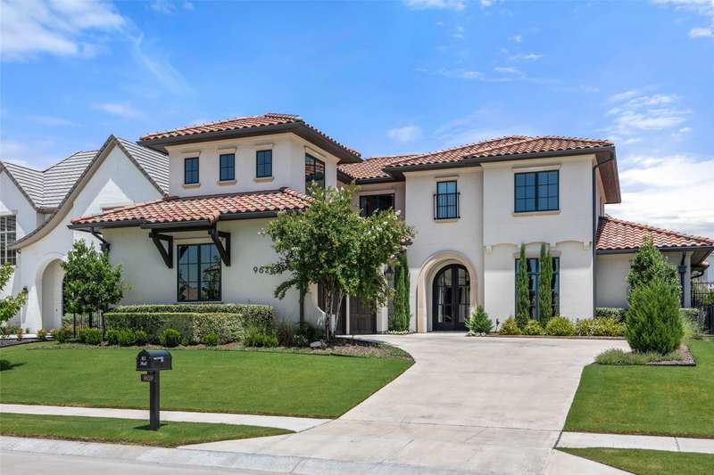 Nestled in the exclusive, 24-hour guarded Montrachet community, this exquisite home perfectly combines timeless elegance with modern luxury and functionality. The prestigious neighborhood features over 50 acres of scenic green space with hiking and biking trails, community pool, amenity center, putting green, pickleball courts and an outdoor pavilion in the pecan orchard. This meticulously designed home exudes a lifestyle of luxury & comfort, offering an array of high-end features and finishes. The thoughtfully designed floor plan includes five spacious bedrooms all with ensuite luxury bathrooms and large walk-in closet with two located on the first floor. A beautifully appointed entryway leads to French doors opening to the versatile front study that could also be perfect for a formal dining or a sitting room. The expansive open-concept kitchen flows seamlessly into the grand living room, distinguished by a dramatic 16-foot sliding glass door that opens to a covered outdoor living area. The backyard is beautifully landscaped with room for a pool. The kitchen is a chef's dream with an oversized island, gourmet appliances and connects to the adjacent dining area. The owner's suite on the main level includes a relaxing sitting area that offers a serene view of the backyard. The spa inspired primary bath features a freestanding tub, separate shower, expansive cabinetry, and a custom designed walk-in-closet. Upstairs there is a large entertainment space, featuring seating and game table spaces along with three additional bedrooms. Abundance of storage throughout.