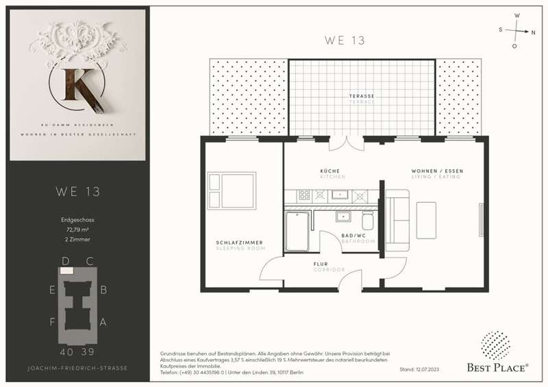 Ku'damm Residences: This is an imposing old Wilhelminian-style building with two interlocking garden courtyards, bright facades, renovated staircases and a passenger elevator. This residential palace just 100 m from the magnificent Kurfürstendamm boulevard promises urban living with class. The apartments in the old building with high ceilings, original stucco, floorboards or French herringbone parquet flooring provide the perfect setting for stylish interior design and classic antiques. There are three apartment types: 1. refurbished and ready to move into, 2. ready to move into (in a tidy condition - refurbishment according to individual wishes), 3. rented apartments. The property has been successively brought up to date in recent years: loft conversion, new facades, installation of elevator and refurbishment of the stairwells (advanced), complete redesign of the garden and courtyard areas (in planning) - June 2022. The apartment offered here is WE13, garden house, staircase C, first floor with approx. 72.79 square meters of living space. Further details can be found under the heading Furnishings. The floor plan also gives you a good impression of this special apartment in an old building for owner-occupiers or as an investment in an A-location. We look forward to your inquiry and the first joint viewing!
