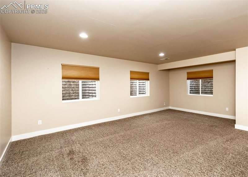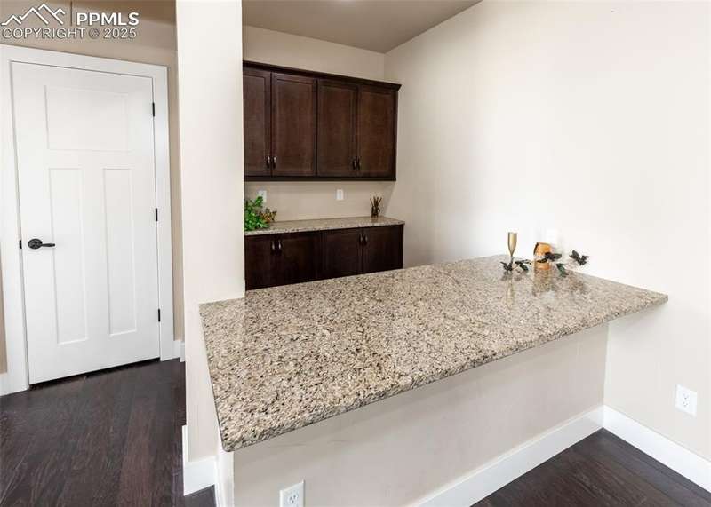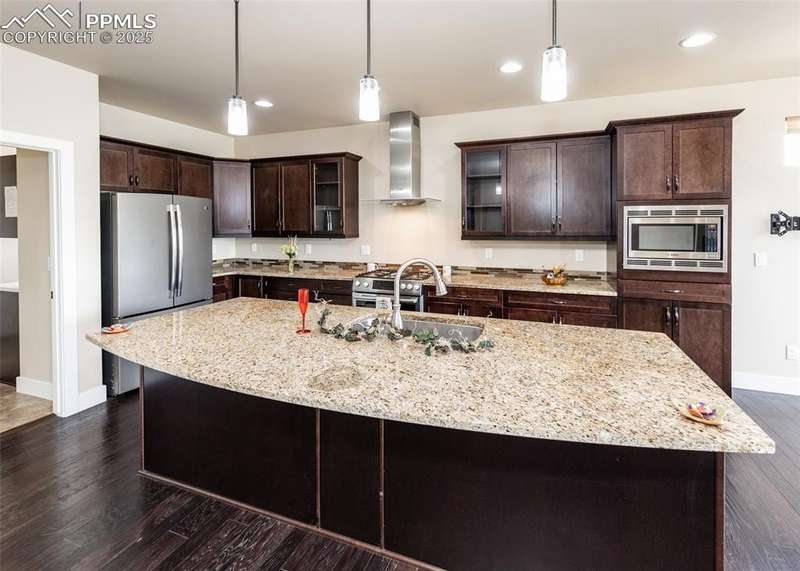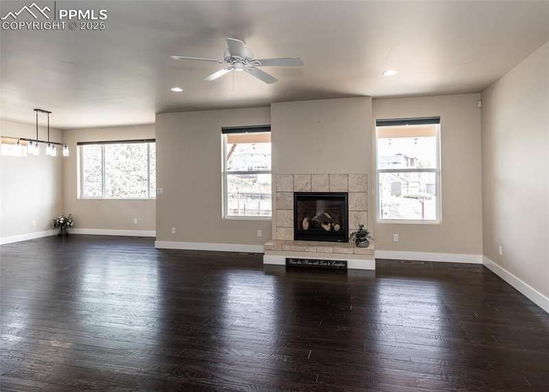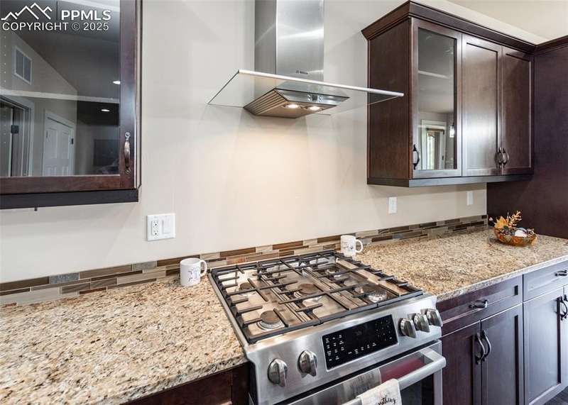 This exceptional like new 4258 sq ft 4 bedroom, 3 bath rancher sits on a .23 acre fully xeriscaped corner lot backing to open space ~ 3 car insulated & finished garage ~ 2x6 construction with xinsulation ~ A/C ~ Gas log fireplace ~ travertine counters in all baths & gourmet slab granite kitchen with Bosch stainless steel upgraded appliances, including gas range ~ Open "Great Room" one level living open concept floor plan ~ Engineered hardwood flooring thru-out main living area ~ 9' ceilings on main level ~ Security system ~ Custom lighting, solar tubes, iron railings ~ Barn door in 5 piece primary bathroom ~ Custom tile work & hand troweled walls ~ high efficiency furnace ~ 50 gallon hot water heater ~ CONSTRUCTED WITH ALL AMERICAN MADE PRODUCTS ~ just professionally cleaned to include carpeting ~ nothing to do but move in ~ perfect 1 level living with everything you need on one level