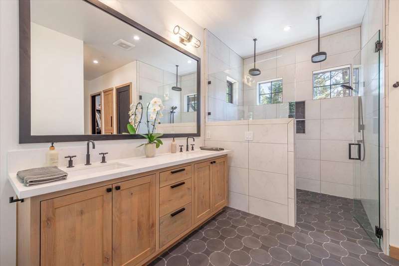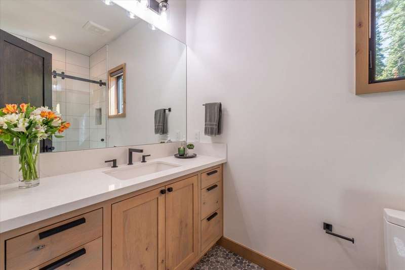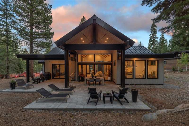 Nestled within the coveted Schaffer's Mill luxury community, 9087 Horned Lark Court blends custom craftsmanship with timeless architectural appeal. This RARE, single-level retreat blends mountain modern design with thoughtful livability, creating an inviting sanctuary amidst a private forest setting. The stunning great room showcases soaring ceilings, exposed beams and floor-to-ceiling windows that frame tranquil wooded views. Anchored by a contemporary gas fireplace, this spacious gathering area exudes warmth and mountain sophistication. The chef's kitchen complements the space beautifully, featuring a farmhouse-inspired design with a large center island, high-end appliances, open shelving, abundant cabinetry, and a walk-in pantry. The adjacent dining area is bathed in natural light - ideal for intimate meals with nature as your backdrop. During the summer months, dine al fresco beneath the expansive covered patio, then gather as alpenglow fades into starlight. An executive office, located off the great room, offers both function and style, highlighted by built-in cabinetry and serene front-yard views - perfect for remote workdays in the mountains. Movie or game nights come alive in the comfortable family room, complete with an adjacent and custom designed wet bar, mudroom and laundry area for everyday ease. Privately situated in its own wing, the primary suite is a peaceful retreat with patio access, a cozy gas fireplace, and a spa-inspired ensuite featuring a soaking tub, spacious shower, dual vanities, custom walk-in closet plus a makeup vanity. On the opposite side, two ensuite guest bedrooms offer comfort and privacy for family and friends. A true rarity, the 1,350+ sq. ft. garage delivers incredible functionality with epoxy flooring, built-in storage, and room for cars, sleds, an RV, boat, skis, bikes, and more - perfect for your Tahoe adventures! With distinctive curb appeal, abundant outdoor living and exceptional design quality, this home captures the essence of luxury mountain living in Truckee's coveted Martis Valley. Experience the vibrant, welcoming spirit of Schaffer's Mill - a place where refined style meets relaxed mountain life. Welcome home!