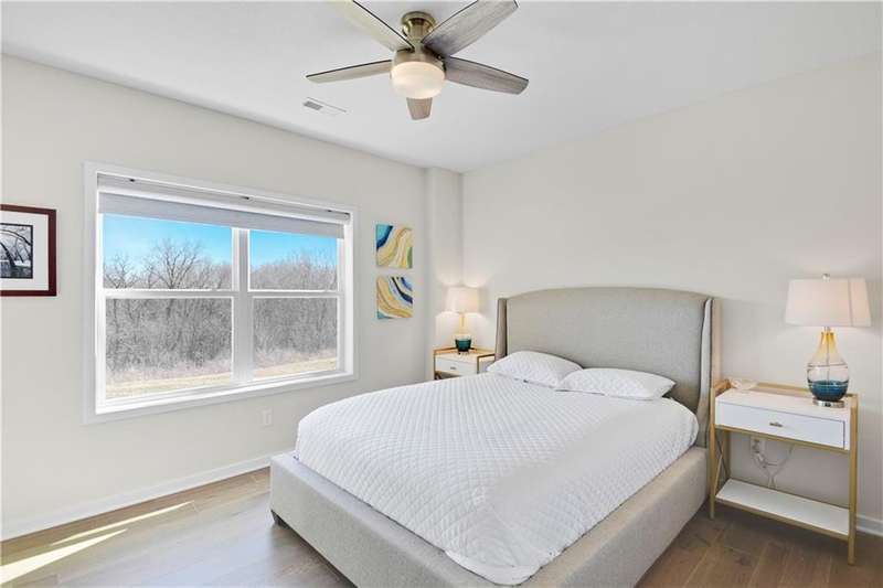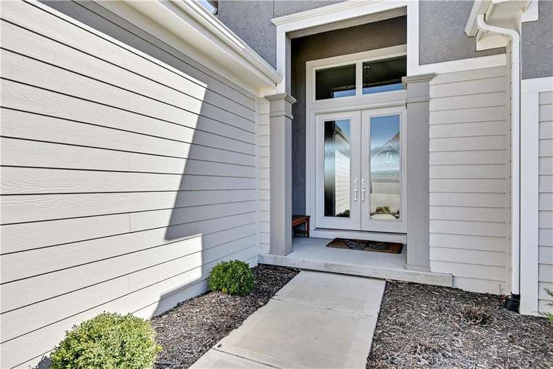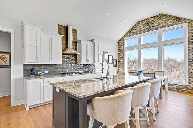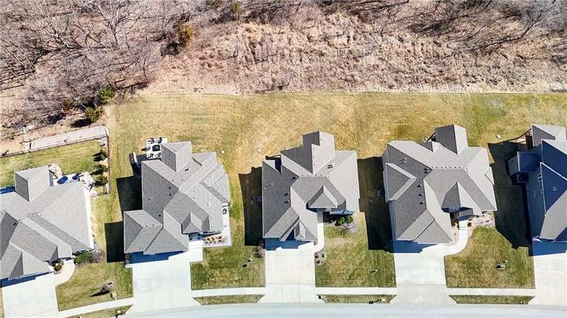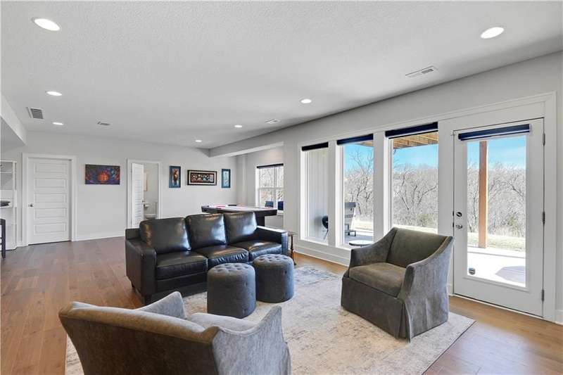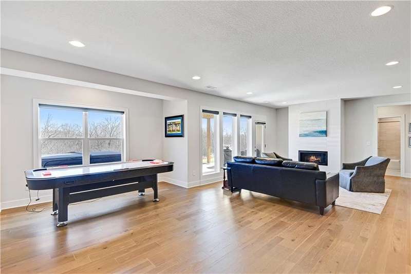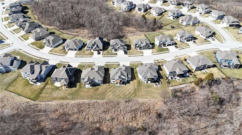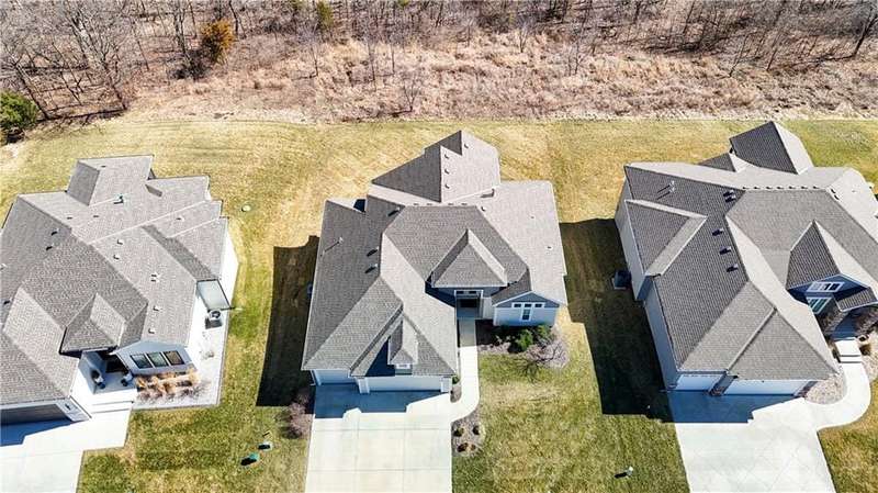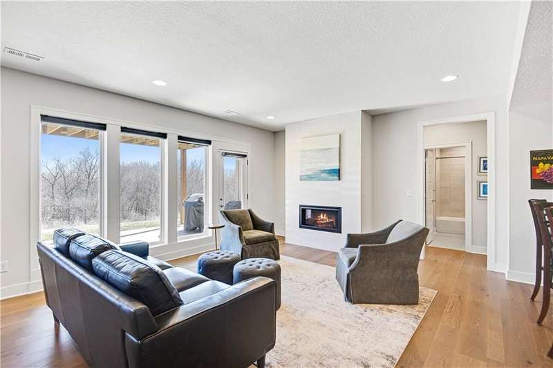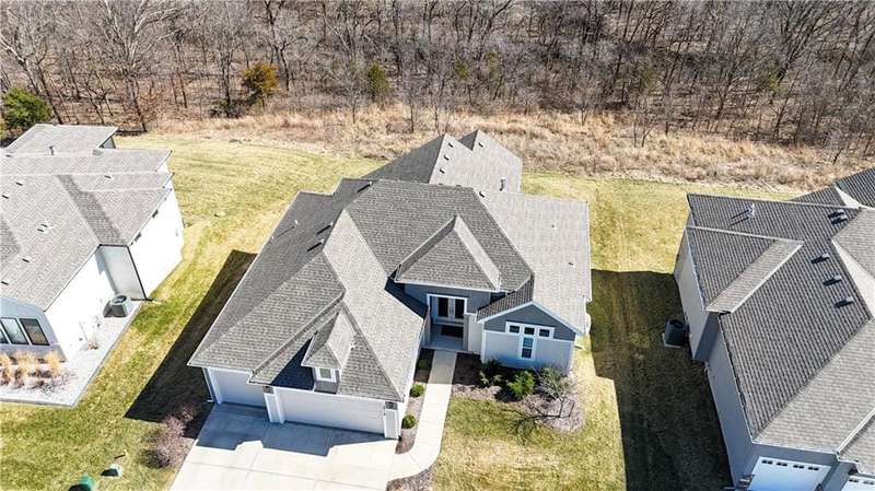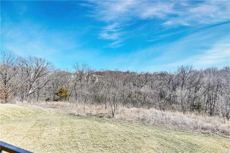 Stunning Reverse 1.5-Story in coveted Thousand Oaks. Step into luxury with this like-new, 4 bedroom, 3.1 bathroom home by New Mark Homes, packed with high-end upgrades with hardwoods throughout. Nestled on a prime lot overlooking wooded green space, this home offers breathtaking views from its floor-to-ceiling windows with automatic blinds, flooding the open-concept living space with natural light. The gourmet kitchen is a chef's dream, featuring a gas cooktop, oversized island with soft water system and filter at the sink and walk-in pantry, perfect for entertaining. The great room boasts a striking floor-to-ceiling stone fireplace, creating a warm and inviting atmosphere. The primary suite is a private retreat, while a second main-level bedroom doubles as an ideal home office.The walk-out lower level is built for relaxation and entertaining, complete with a full bar, fireplace, expansive family room, and two additional bedrooms. There's also plenty of storage space. Step outside to enjoy the peaceful patio and lush surroundings. Located in the highly desirable Thousand Oaks community, residents enjoy multiple pools, scenic walking trails, and numerous other amenities. Don't miss your chance to own this exceptional home in Parkville's premier neighborhood!