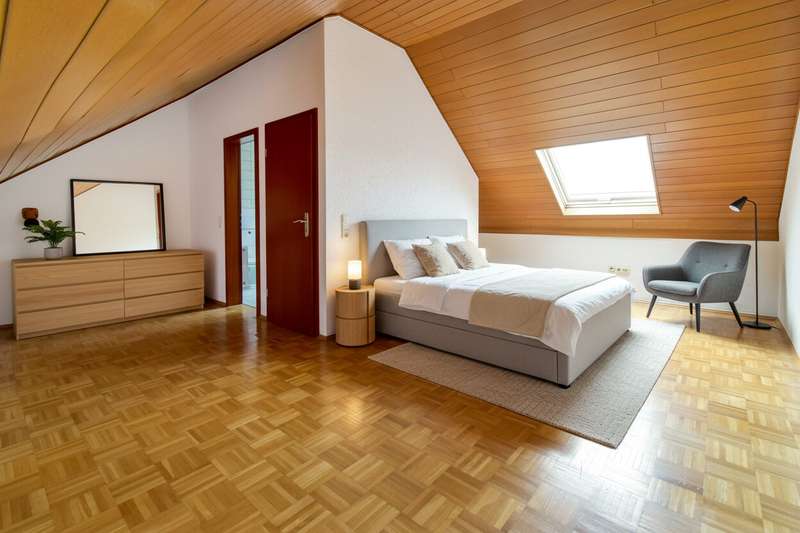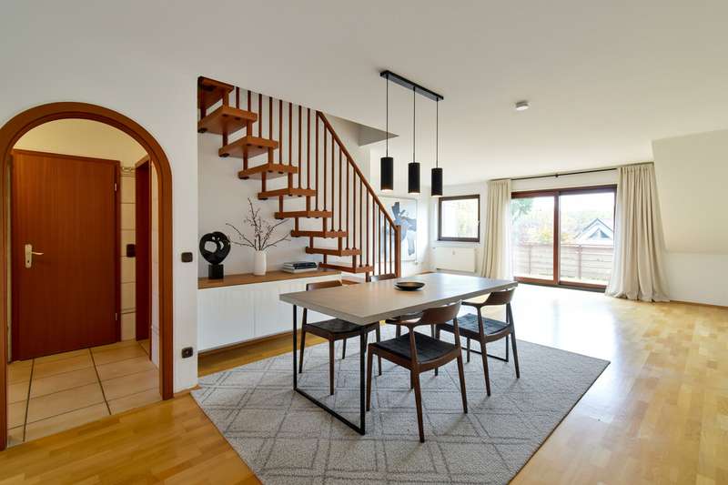 This charming maisonette with approx. 85 m² of living space impresses with its well thought-out room layout, two full bathrooms, a sunny balcony and its central location - ideal for couples or small families who appreciate urban comfort and a pleasant living environment. The apartment is located on the 2nd floor of a well-kept residential complex with a total of six residential units, built in 1980. The small community of owners ensures harmonious and quiet coexistence. The entrance area already conveys a spacious feeling of living. From here, you enter the open-plan living and dining area, which forms the heart of the apartment. The high-quality real wood parquet flooring gives the room a warm, inviting atmosphere and can be arranged in a variety of ways. The living area leads to the balcony, which extends the room to the outside and offers a lovely place to relax with a view of the tranquil living environment. The bright fitted kitchen, which is included in the purchase price, offers plenty of space for cooking together. Adjacent to the kitchen on this level is another room, which is ideal as a study or children's room. The shower room for everyday comfort rounds off the space on this level. The electric shutters on the windows on this floor are a particular bonus, providing pleasant lighting conditions and additional comfort. The upper level presents itself as a spacious studio with a variety of uses - whether as a bedroom, home office, guest room or creative retreat. The second bathroom, equipped with a bathtub, is also located here, providing additional comfort and privacy. The open-plan design creates a bright, friendly area that perfectly rounds off the room concept. The apartment is heated by an oil heating system that was modernized in 2004 and provides a reliable heat supply. The monthly house fee is €358 and includes maintenance of the communal property as well as reserves for repairs. A private garage also belongs to the apartment and offers not only a convenient parking space, but also additional storage space. The location in popular Buchholz impresses with its proximity to the center and excellent infrastructure: shopping facilities, doctors, schools, kindergartens and public transport are all in the immediate vicinity. Green spaces and leisure facilities are also within easy reach. Conclusion: This 2nd floor maisonette combines well thought-out living, well-kept condition and a central location - an ideal home for anyone who values comfort and functionality. The combination of room layout, balcony, garage and location characterizes this special property. Feel free to arrange a viewing appointment - we look forward to hearing from you.