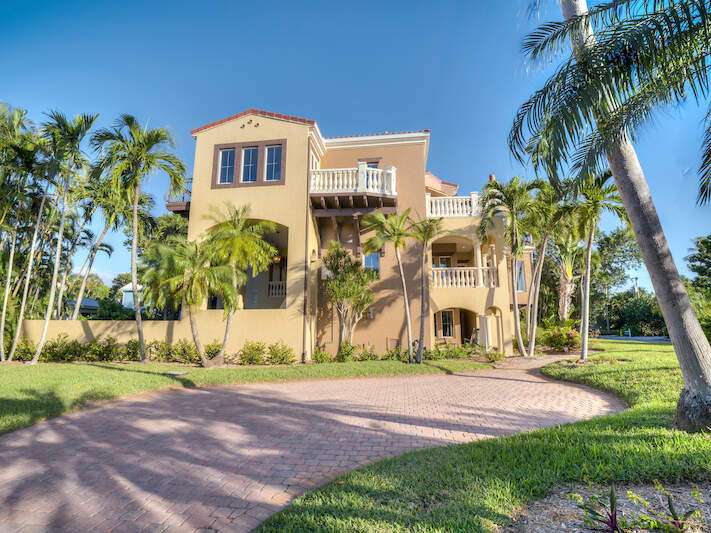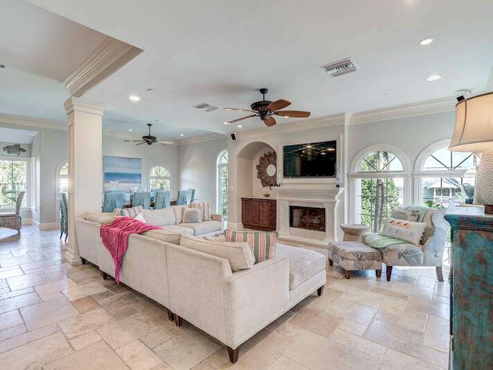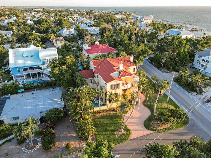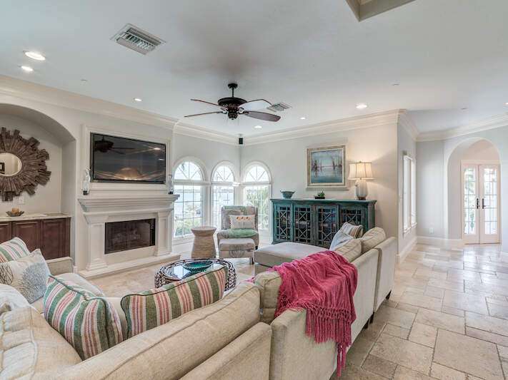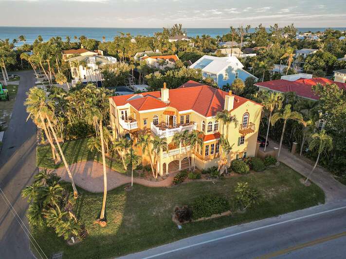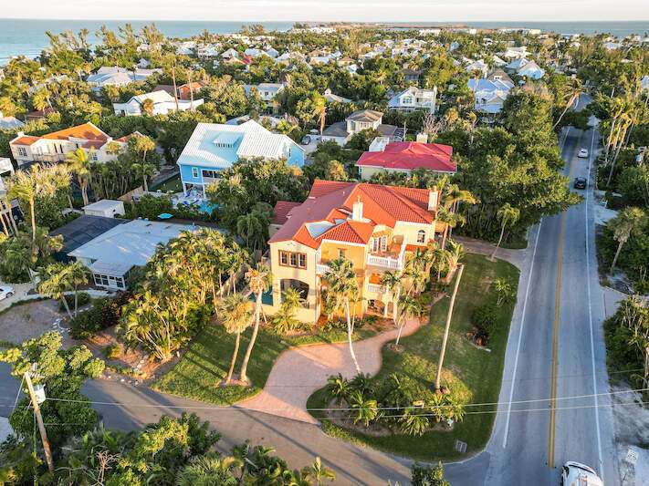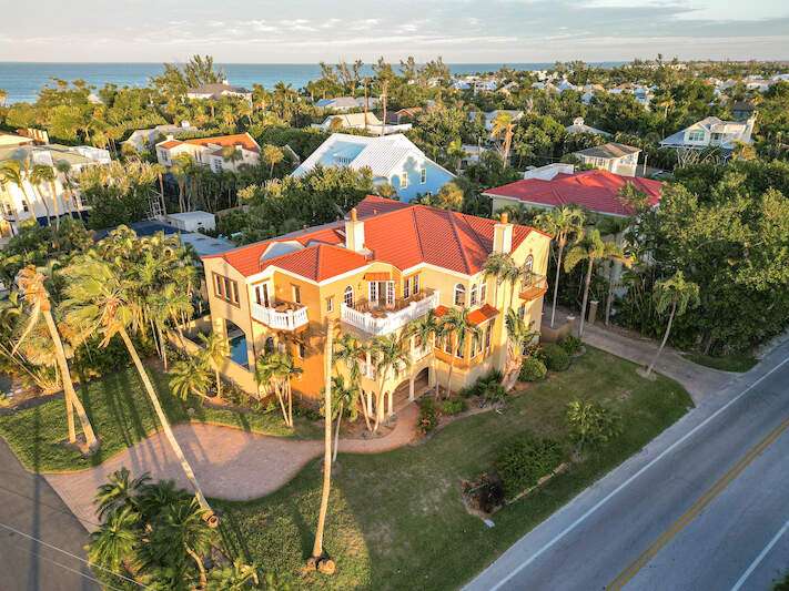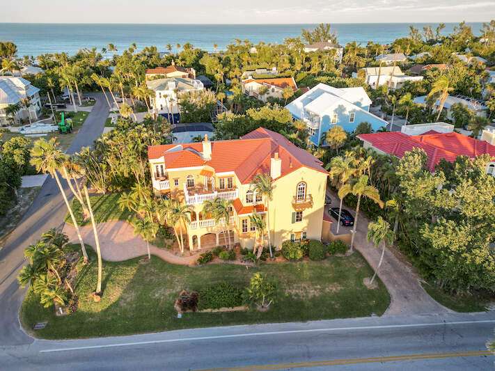 Experience the charm of Sandcastle, a stunning coastal estate with a unique reverse floor plan. This impressive 6-bedroom + den, 6.5-bath residence spans over 4,800 square feet, offering breathtaking bay views from its multi-level decks. Designed in Coastal Tuscan style, the home features luxurious touches throughout, including travertine floors in the living areas, wood floors in the bedrooms, and soaring 10+ ft ceilings with elegant crown molding. The spacious layout boasts multiple living rooms, en-suite bedrooms, an elevator, a morning kitchen, and a private in-law suite. The chef's kitchen is a culinary dream, featuring a gas stove, stainless steel appliances, granite countertops with a breakfast bar, a walk-in pantry, custom wood cabinetry, an oversized sink, and a dedicated bar area. Enjoy the #IslandLifestyle with your private pool and spa, multiple covered and open patios, or a short walk to the beach. Sandcastle is conveniently located near the Village, renowned restaurants, and plenty of shopping, offering everything you need to embrace the #CaptivaLifestyle.
