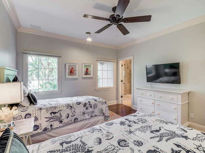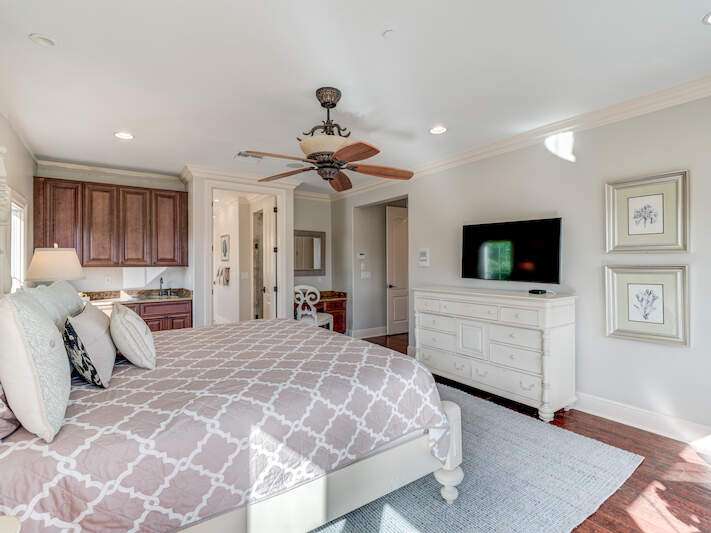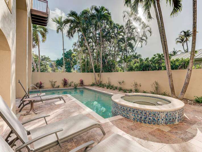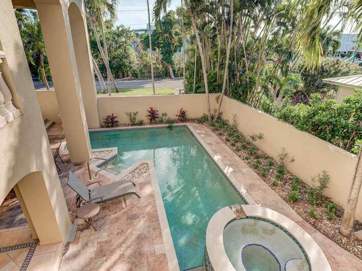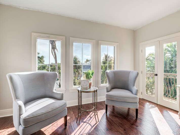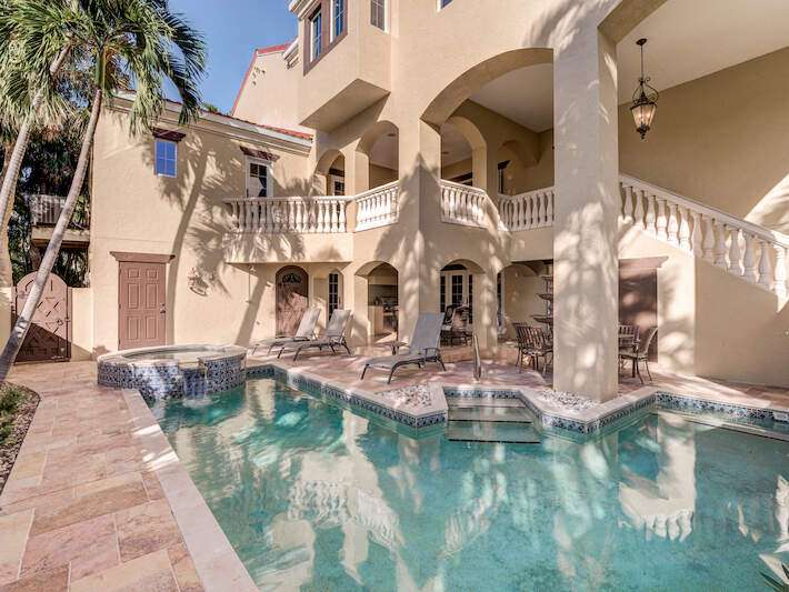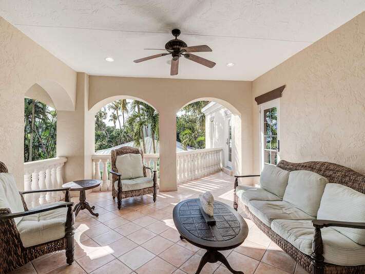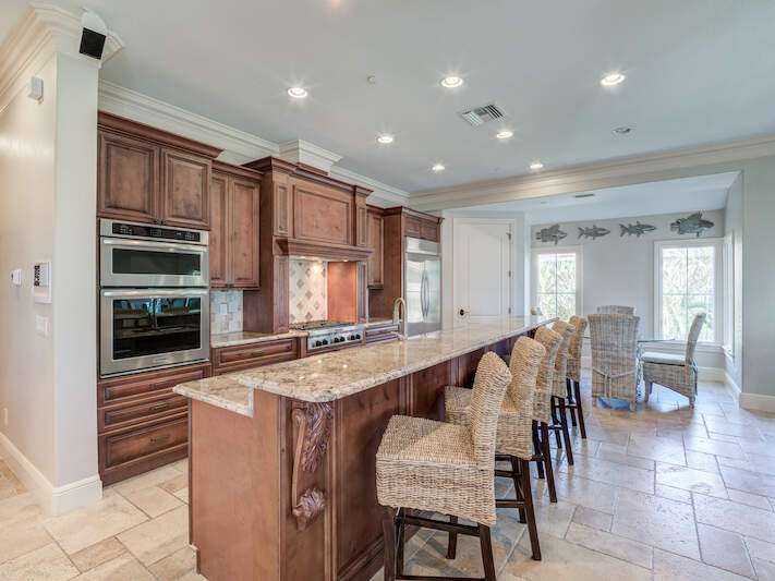 Experience the charm of Sandcastle, a stunning coastal estate with a unique reverse floor plan. This impressive 6-bedroom + den, 6.5-bath residence spans over 4,800 square feet, offering breathtaking bay views from its multi-level decks. Designed in Coastal Tuscan style, the home features luxurious touches throughout, including travertine floors in the living areas, wood floors in the bedrooms, and soaring 10+ ft ceilings with elegant crown molding. The spacious layout boasts multiple living rooms, en-suite bedrooms, an elevator, a morning kitchen, and a private in-law suite. The chef's kitchen is a culinary dream, featuring a gas stove, stainless steel appliances, granite countertops with a breakfast bar, a walk-in pantry, custom wood cabinetry, an oversized sink, and a dedicated bar area. Enjoy the #IslandLifestyle with your private pool and spa, multiple covered and open patios, or a short walk to the beach. Sandcastle is conveniently located near the Village, renowned restaurants, and plenty of shopping, offering everything you need to embrace the #CaptivaLifestyle.