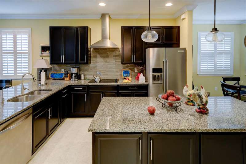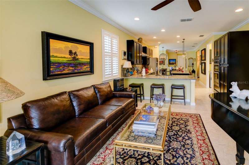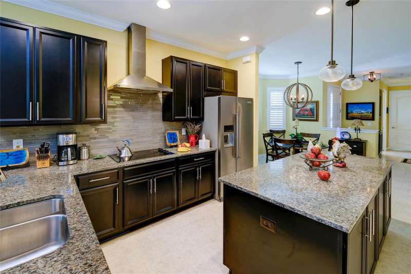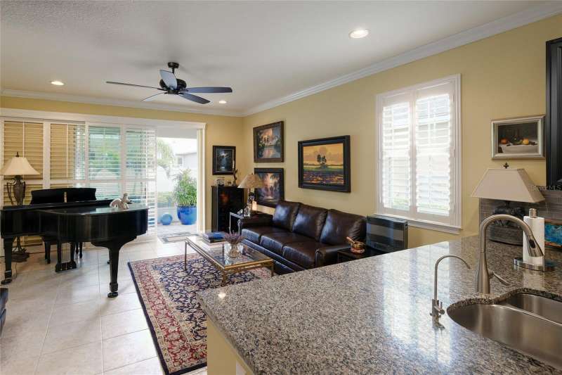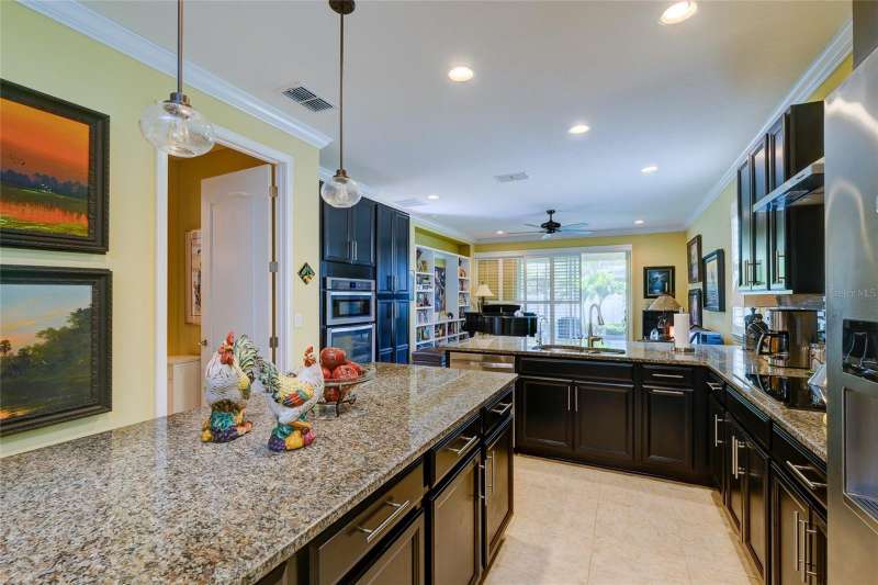 Welcome to this highly sought-after Captiva Model, ideally positioned directly across from the community pool and dog park in one of Sarasota’s most centrally located and gated maintenance-free communities. This single-level home offers a well-designed open floorplan that blends the kitchen, dining, and living areas seamlessly with an extended screened lanai—perfect for entertaining or relaxing in Florida’s beautiful weather. The enhanced kitchen features solid wood cabinetry with 42” uppers, granite countertops, a glass tile backsplash, stainless steel appliances, a solid-surface cooktop, and a built-in wall oven and microwave—ideal for any home chef. The spacious primary suite includes a tray ceiling and 8-foot sliding glass doors leading to the lanai. The oversized primary bath boasts a double vanity with undermount sinks, a linen station for ample storage, and a large custom walk-in closet. The secondary bedroom also features built-in custom shelving, while the den or home office offers flexibility for remote work or hobbies. Additional upgrades and features include: • New roof (2023) • New HVAC system (2024) • New water heater (2025) • 17" ceramic tile throughout • 8-foot interior doors, crown molding, and custom plantation shutters—including on sliding glass doors • Whole-home water softener system with reverse osmosis for purified kitchen water and ice The Enclave at Forest Lakes offers two gated entrances and resort-style amenities, including a geothermal heated pool, covered outdoor lounge with BBQ, and a fenced dog park—all designed to enrich your lifestyle. Situated in a prime Sarasota location, this home places you minutes from The Legacy Trail, downtown Sarasota, top-rated dining, shopping, and world-renowned beaches. Cultural institutions, entertainment, and leading healthcare are all just around the corner.