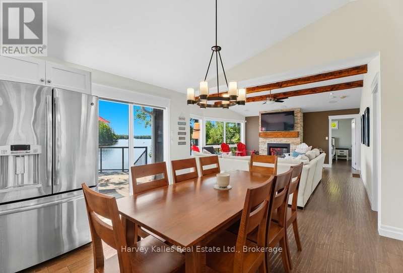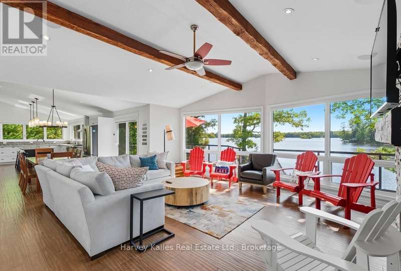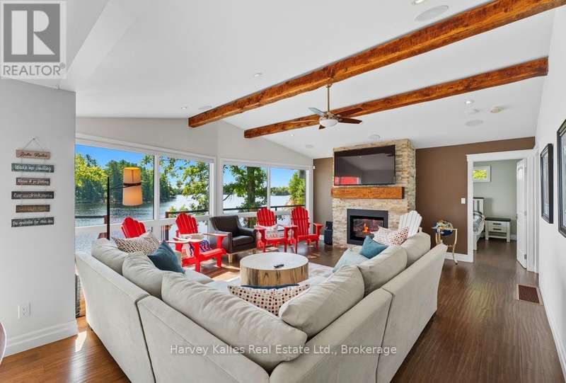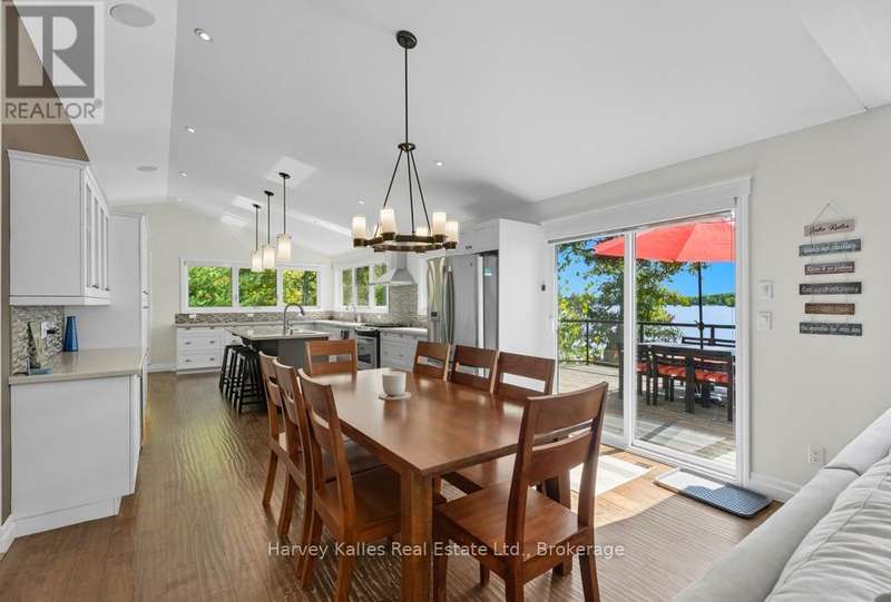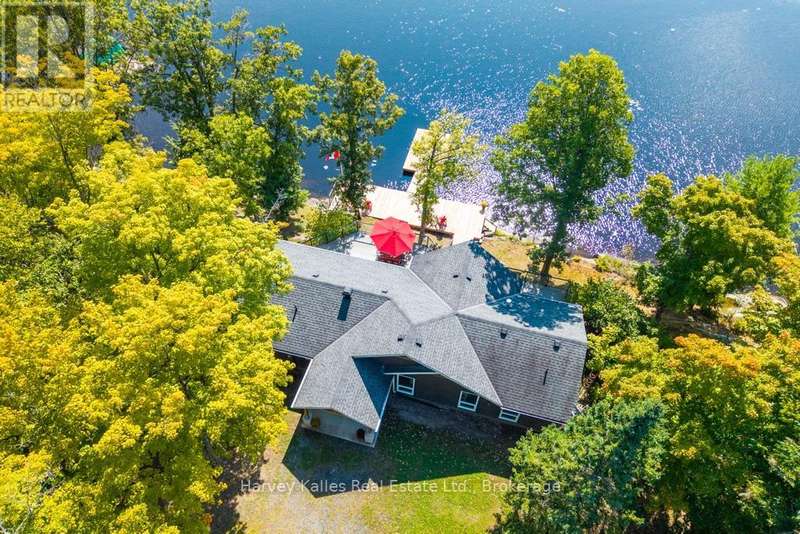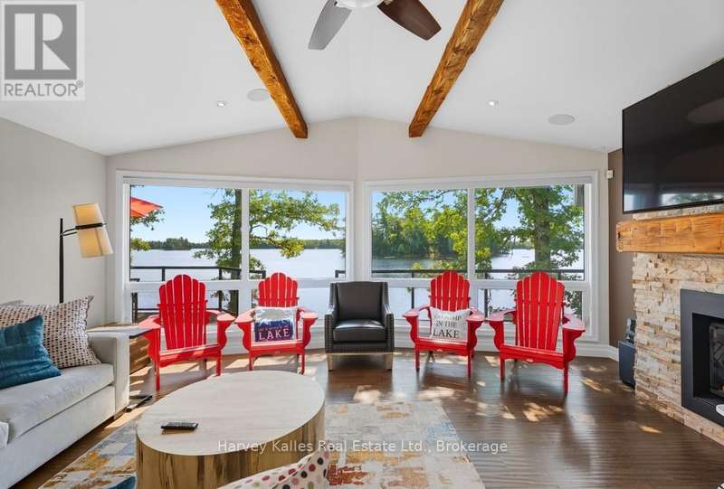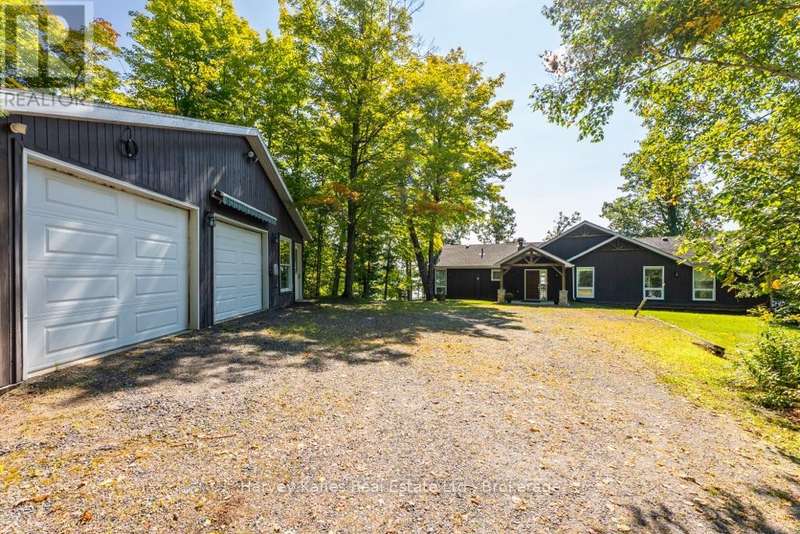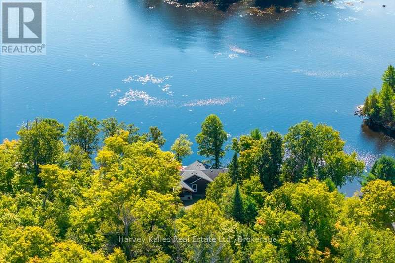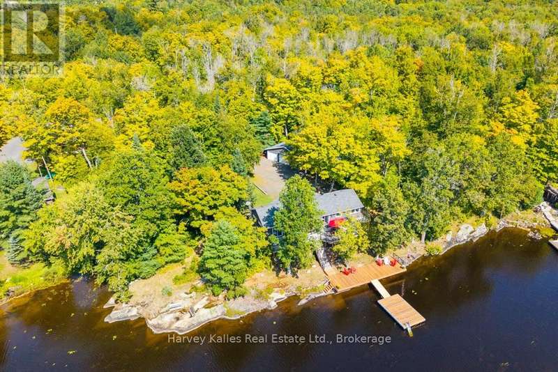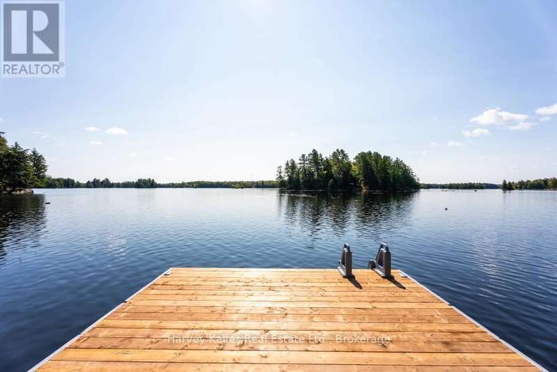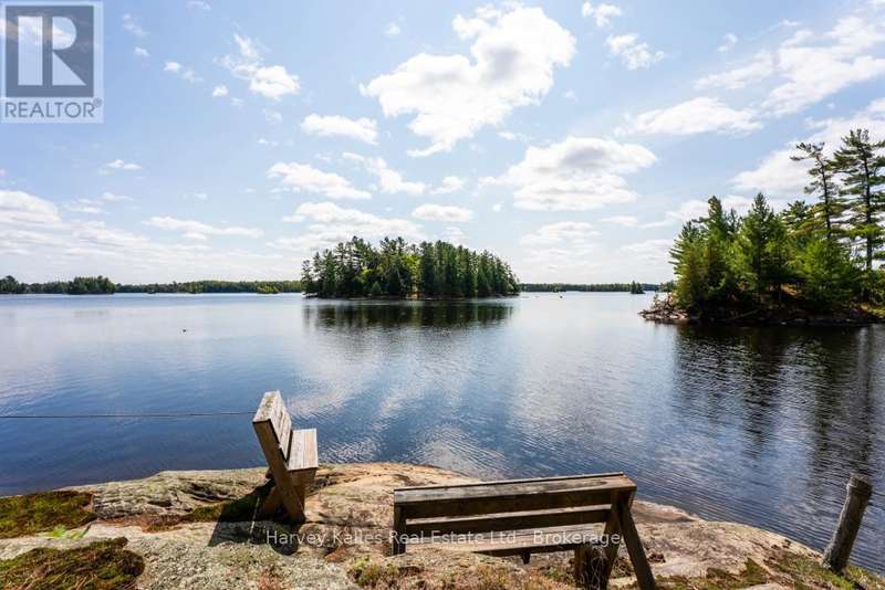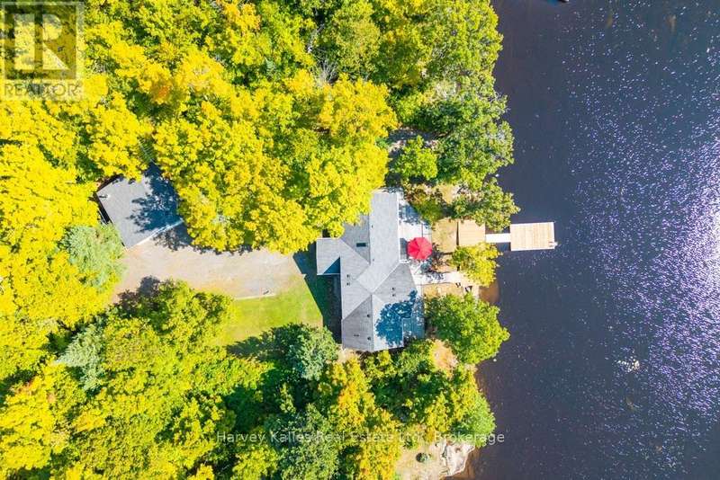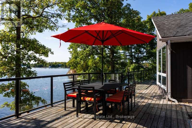 Stunning & inviting 4 season southerly oriented Lake Manitouwabing water's edge hideaway boasting island-dotted views and a beautiful sun-drenched classic rock shelf shoreline. Gentle topography, ease of year round municipally maintained road access with drive to the back door convenience. The all redone, elegant all season, 3 bedroom, 2 bath, sprawling bungalow boasts water views from almost every room, with a lakeside array of south to south-easterly facing windows & sliding glass doors spilling onto a large wraparound lakeside deck which connects down onto the brand new dock with expansive lakefront terrace area and separate granite fire pit patio. The cottage beckons & welcomes one with a lake view as soon as the door opens. Light & bright, luxurious designer infused interior features a gorgeous chef's kitchen with centre island & S/S appliances, water views, breakfast nook, bar area with bar fridge, opening to a generous lake-view dining area, and grande centrepiece great room with handsome floor-to-ceiling stacked stone propane-burning fireplace, and prow-front wall of windows overlooking once again stunning views. Waterside principal bedroom complete with its own walkout, walk-in closet, and luxe ensuite. 2 more main floor bedrooms, bath, laundry, plus the 276 sq. ft. sleeping cabin with bath attached to the insulated 2-car 23' x 23' detached garage. 213' of southerly shoreline, with rock point, rock shelf entry, deep and shallow water, sunrise and island-dotted views. 1.4 acres of level, private lands. Magnificent mechanicals, drilled well, central air, hot water on demand. The list goes on and on. Minutes from the exclusive "Manitou Ridge" Club for golf and dining, and a breeze to access from Toronto. With the ever rare and appealing aspect of having membership in the 'Longhorn Estates' Conservation Area 120+ acre backlands with hiking trails. 4 season cottaging splendour abounds on the ever desired Lake Manitouwabing. Being sold turnkey, fully furnished (id:6370)