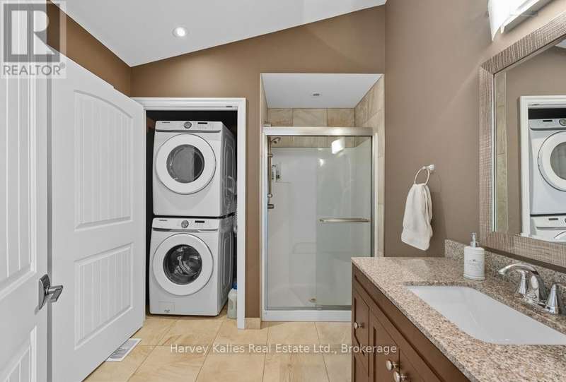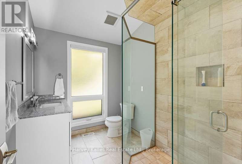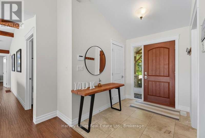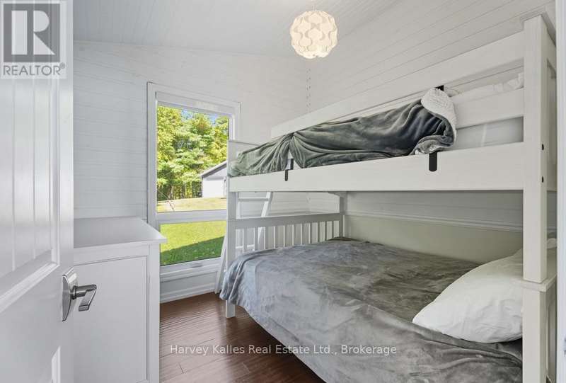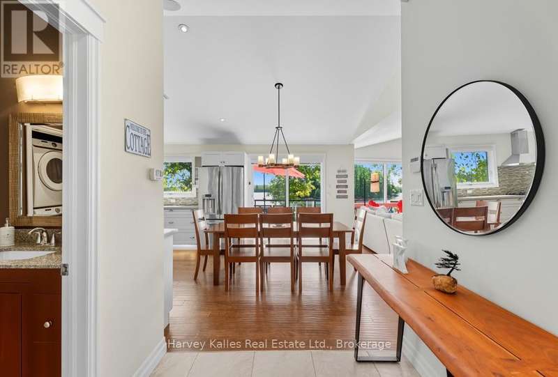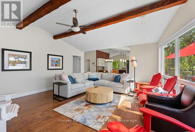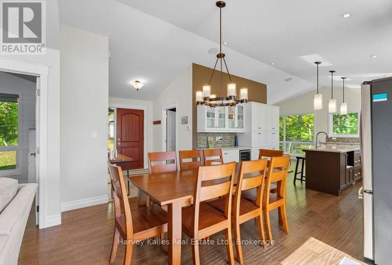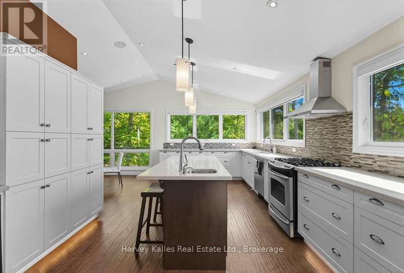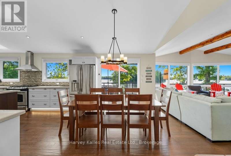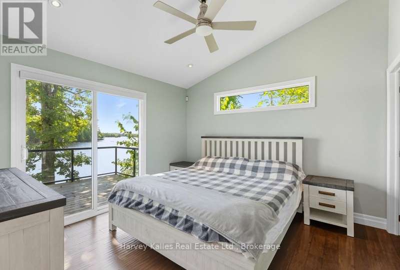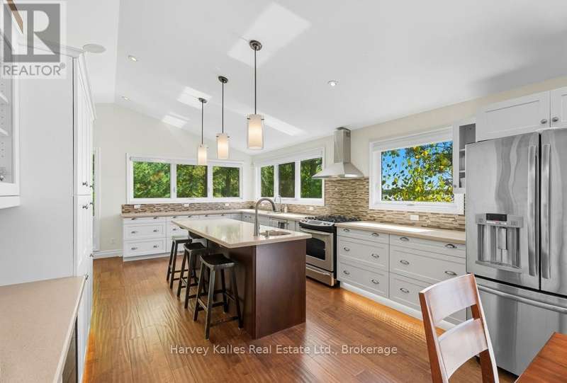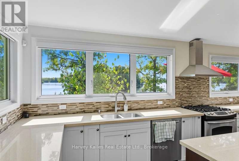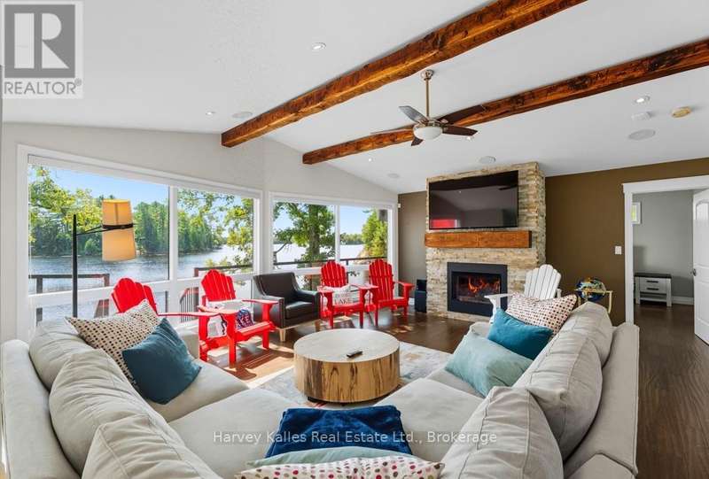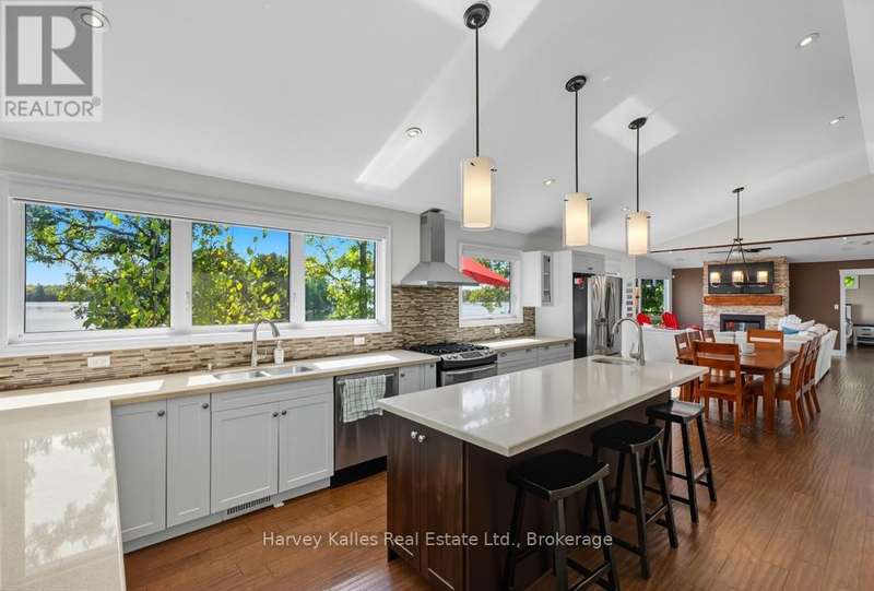 Stunning & inviting 4 season southerly oriented Lake Manitouwabing water's edge hideaway boasting island-dotted views and a beautiful sun-drenched classic rock shelf shoreline. Gentle topography, ease of year round municipally maintained road access with drive to the back door convenience. The all redone, elegant all season, 3 bedroom, 2 bath, sprawling bungalow boasts water views from almost every room, with a lakeside array of south to south-easterly facing windows & sliding glass doors spilling onto a large wraparound lakeside deck which connects down onto the brand new dock with expansive lakefront terrace area and separate granite fire pit patio. The cottage beckons & welcomes one with a lake view as soon as the door opens. Light & bright, luxurious designer infused interior features a gorgeous chef's kitchen with centre island & S/S appliances, water views, breakfast nook, bar area with bar fridge, opening to a generous lake-view dining area, and grande centrepiece great room with handsome floor-to-ceiling stacked stone propane-burning fireplace, and prow-front wall of windows overlooking once again stunning views. Waterside principal bedroom complete with its own walkout, walk-in closet, and luxe ensuite. 2 more main floor bedrooms, bath, laundry, plus the 276 sq. ft. sleeping cabin with bath attached to the insulated 2-car 23' x 23' detached garage. 213' of southerly shoreline, with rock point, rock shelf entry, deep and shallow water, sunrise and island-dotted views. 1.4 acres of level, private lands. Magnificent mechanicals, drilled well, central air, hot water on demand. The list goes on and on. Minutes from the exclusive "Manitou Ridge" Club for golf and dining, and a breeze to access from Toronto. With the ever rare and appealing aspect of having membership in the 'Longhorn Estates' Conservation Area 120+ acre backlands with hiking trails. 4 season cottaging splendour abounds on the ever desired Lake Manitouwabing. Being sold turnkey, fully furnished (id:6370)