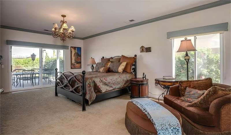 Escape to this stunning turnkey Palm Springs retreat, perfect for your vacation stay (minimum 29 days)! Nestled in a gated community with breathtaking mountain views, this home offers ultimate comfort and relaxation for up to 8 guests. The main house features 3 elegant bedrooms, including a luxurious primary suite with a king bed, en-suite bath with double sinks, a soaking tub, a walk-in shower, and a spacious closet. Two charming queen guest rooms share a beautifully appointed bath.A private 1-bedroom, 1-bath casita with a separate entrance provides added flexibility, complete with a queen bed, sitting area, and full bath. Entertain in the expansive great room with formal dining for 8, or whip up culinary delights in the gourmet kitchen with a breakfast nook. For remote work, a dedicated office is ready for your convenience.Outdoors, soak up the desert sun by the private pool and spa (safety-fenced), relax in the cabana, or grill on the BBQ. Fitness enthusiasts will love the workout equipment, and cozy evenings await by the living room fireplace. With parking for 4 cars (including an RV spot for vehicles up to 32'), this property is as practical as it is luxurious.Seasonally priced at $247/night (Nov-Apr) and $192/night (May-Oct). Additional fees apply: $495 cleaning, $188 admin, security deposit and $50/day for pool heating. Owner covers utilities. Your dream Palm Springs getaway awaits!
