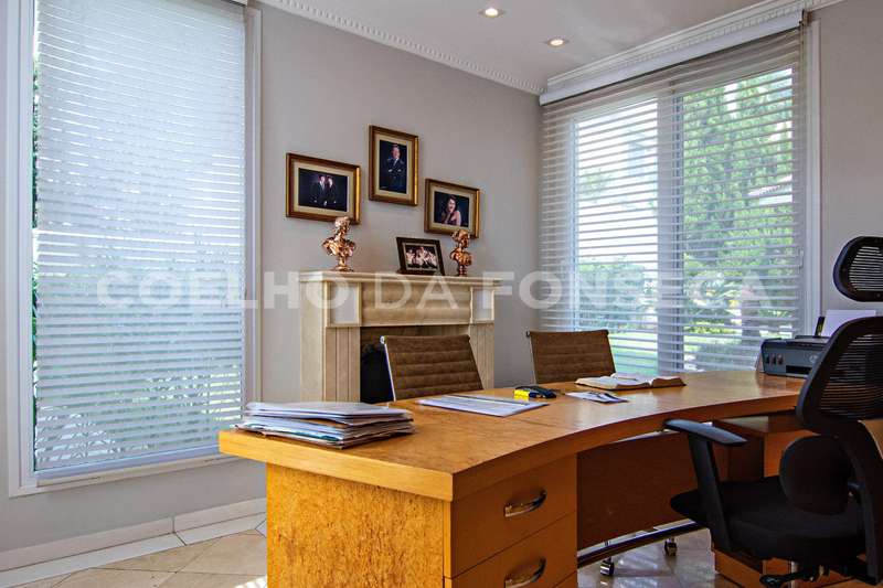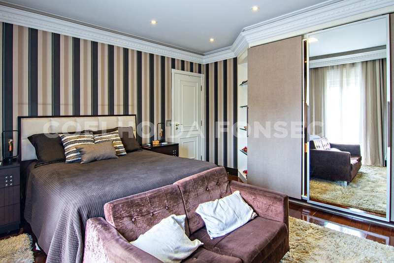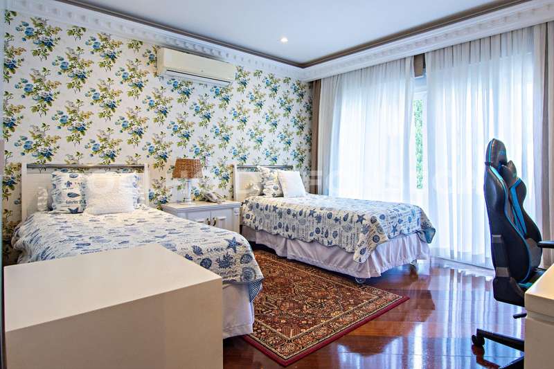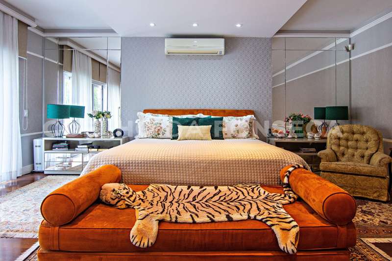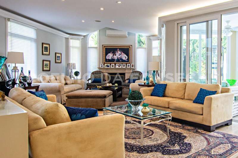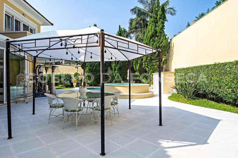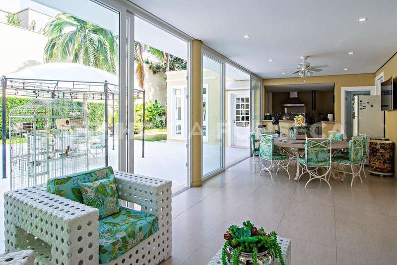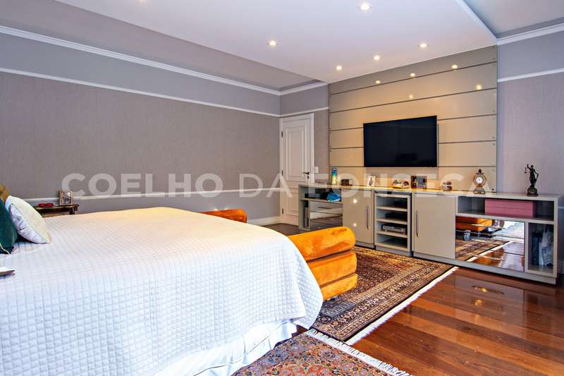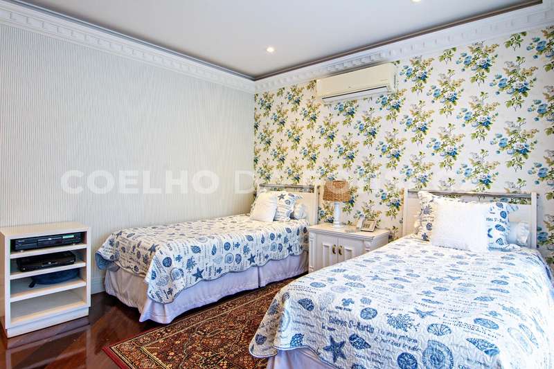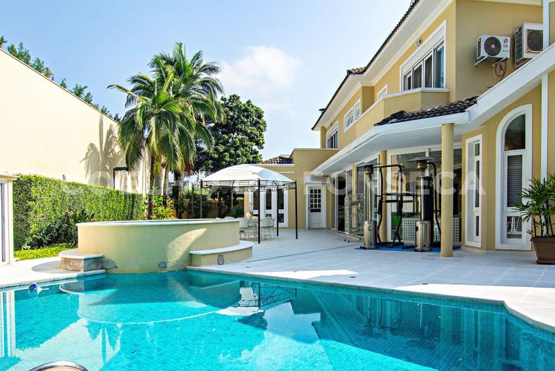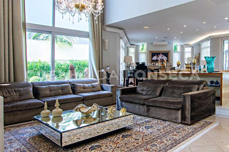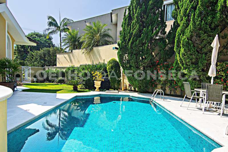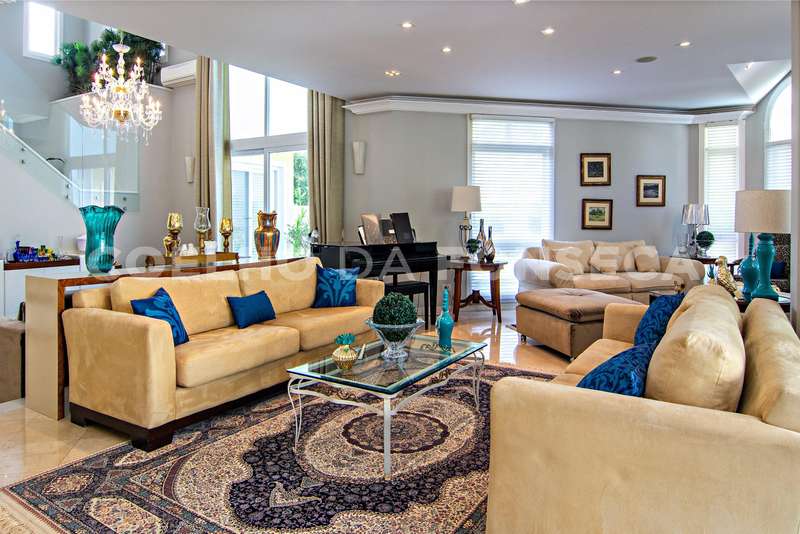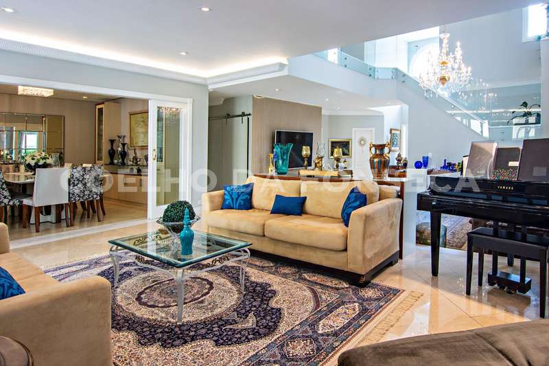 Projeto de Mário Perez: casa impecável, decorada com excelente bom gosto, 5 suítes amplas, living com vários ambientes, fino acabamento. Piso inferior em mármore Crema. Inclui escritório, academia, sauna, piscina com hidro e 2 dependências para funcionários. Documentação OK.