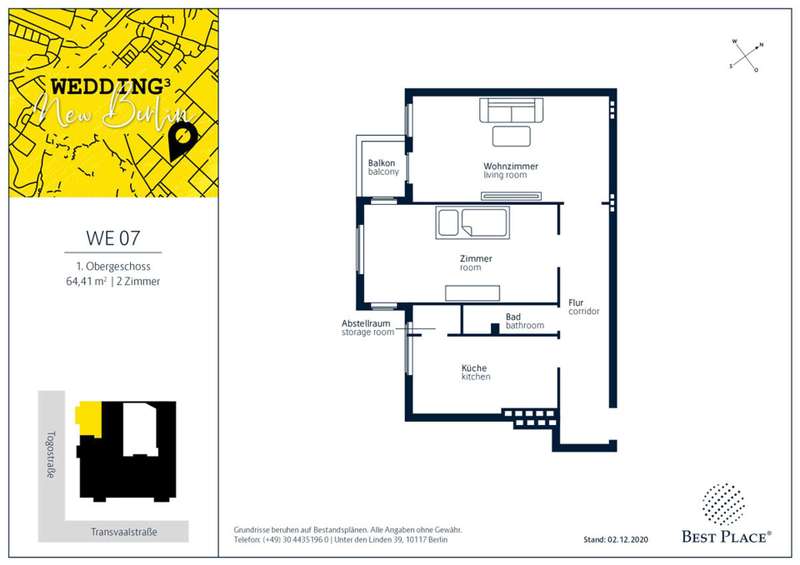 - Apartment - The rented 2-room apartment is located on the 1st floor and extends over approx. 64 m². The apartment has a bedroom, a living room, a bathroom and a kitchen and can be reached via the staircase. From the living room you have direct access to the balcony, where you can relax and enjoy the sun. Only suitable for investors! - Property - WEDDING³ is a beautiful old corner building in the Wedding district of West Berlin dating from 1911, consisting of 1- to 5-room apartments and 3 commercial units. The commission-free units are suitable for singles, couples and families and are located either in the front building or in the side wing. They have spacious living areas of approx. 38.44 to 129.00 m², floor plans typical of old buildings and room heights - perfect for investors! Your place to be in the heart of the up-and-coming trendy district of Wedding!