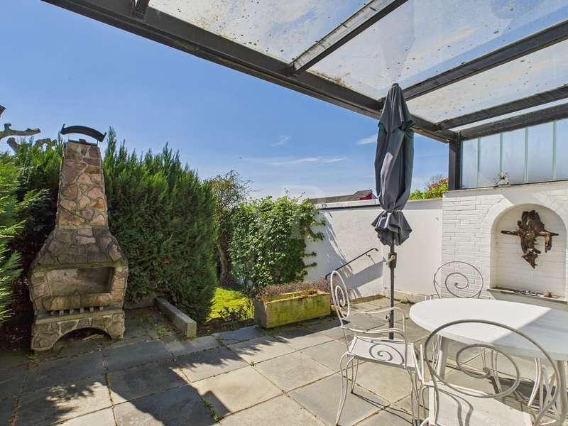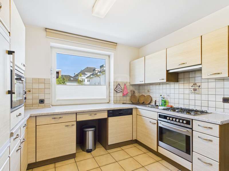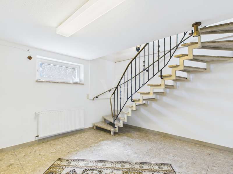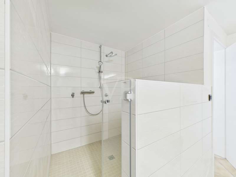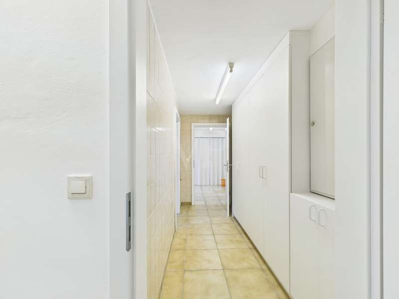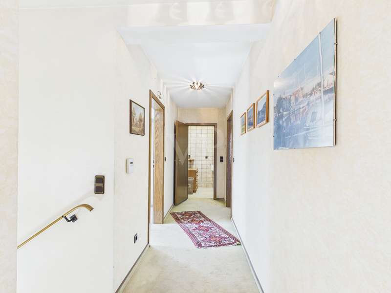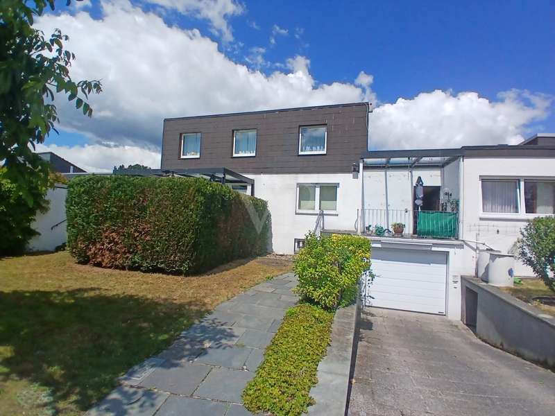 For sale is a "chain house" completed in 1985 on a plot of approx. 500 m² with upscale furnishings, staggered storeys and a basement with underground parking. The individually designed building is approx. 16 meters wide on the first floor and approx. 10 meters wide on the upper floor. The total living space is approx. 180 m², so this property in no way corresponds to the "classic" chain/row house! The first floor is entered via the large vestibule with access to the guest WC and the office/guest room. The spacious hallway (with stairs to the upper floor and the basement) then leads to the approx. 53 m² living room, the dining room and the kitchen with adjoining utility room. In front of the living room is an approx. 20 m² terrace with a glass roof. On the upper floor there is the master bedroom with en-suite bathroom and dressing room, 2 further rooms, a hallway with storage room and a bathroom with shower and access to a roof terrace. In the basement with approx. 80 m² of usable space, there is the stairwell with access to the underground garage, 3 cellar rooms (one of which has a sauna and shower) and the boiler room with the gas heating system, which was replaced in 2020. There is a small green area at the rear of the property, where there is also a small tool shed. All in all, a very spacious property with lots of design options, let the pictures inspire you and arrange a viewing appointment!