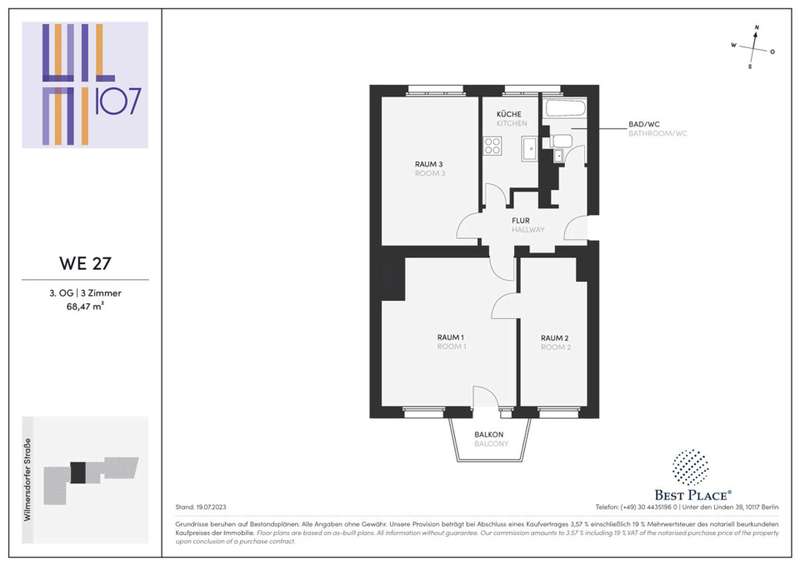 The modern building ensemble Wilmi 107 is located in the sought-after City West between Ku'damm and Kantstrasse. The 2- to 3-room apartments and commercial units are solidly rented and most have balconies or loggias and bathrooms with access to natural ventilation and light. Efficient floor plans, practical apartment sizes and elevator access make them lucrative investments. The offered apartment WE27 is located on the 3rd floor. With three rooms and approx. 68.47 m², it has a particularly sought-after apartment size. A balcony guarantees relaxing hours in the fresh air and a bathroom with natural light and bathtub provides comfort in everyday life. The apartment is ideal for singles and couples of all ages and will also rent very well in the future.