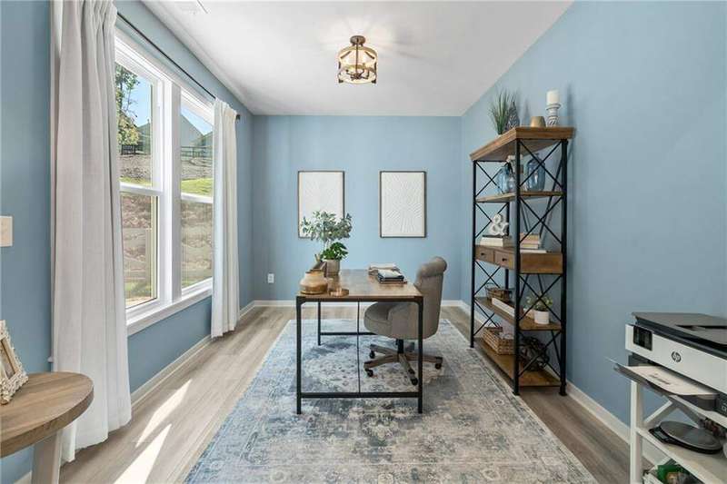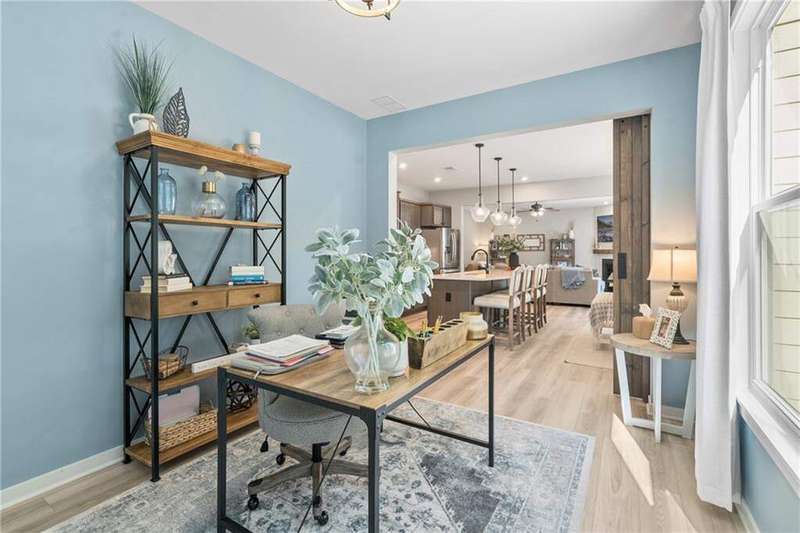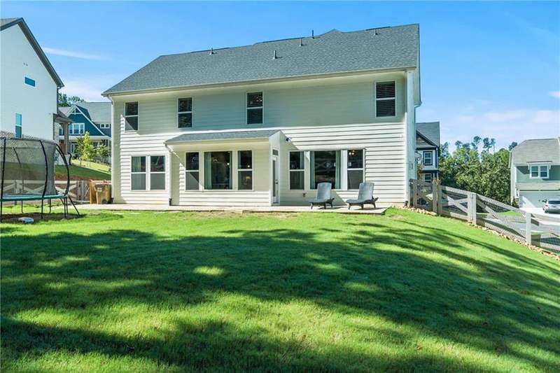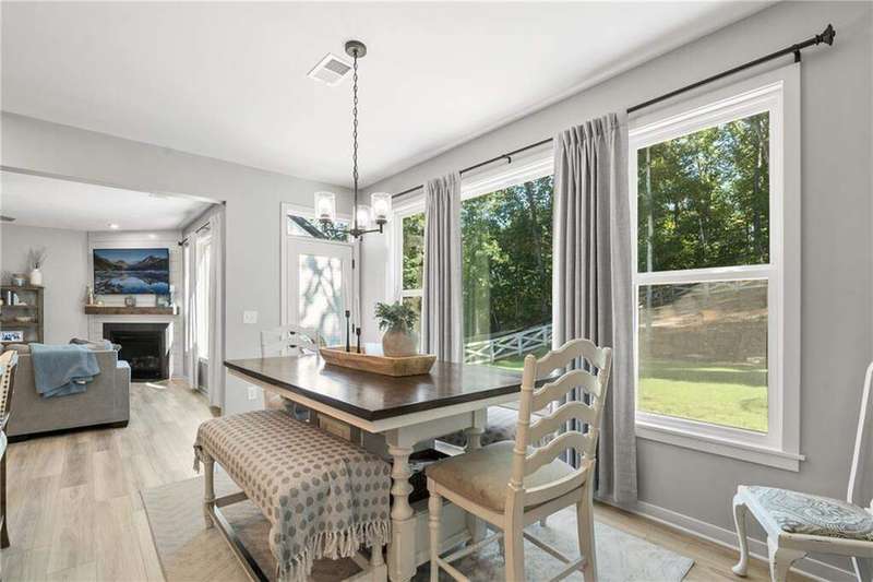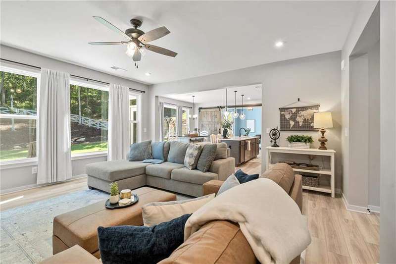 Better than new! This beautifully designed home offers 4-bedroom, 2.5-baths and features bright and airy rooms filled with natural light from numerous windows, creating a warm and inviting atmosphere throughout. The kitchen boasts an oversized island, quartz countertops, a spacious walk in pantry for all of your culinary needs, and a large dining area-perfect for everyday living and entertaining. A dedicated home office or flex space with barn doors provides privacy when needed while the versatile loft provides the ideal spot for movie nights, gaming, or a quiet place to read. The primary bedroom is generously sized with a spa like bathroom, dual sinks, large shower and huge walk in closet. All secondary bedrooms are nicely sized and include spacious closets, ensuring comfort and functionality for everyone. Additional highlights include a mudroom, extra storage in the garage, and a fully fenced backyard with an extra-large flagstone patio-ideal for entertaining or relaxing. The level, private lot backs up to Eagles Beak Park and the Etowah River, offering serene views and easy access to nature. Enjoy the neighborhood amenities, including swim, tennis, pickleball, clubhouse, and playground-all in the sought-after community of River Rock!