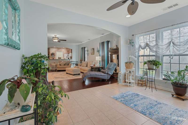 Welcome Home to this 55+ gated community, Del Webb. This attractive floor plan has all you need with 2 bedrooms, 2 baths with a beautiful sunroom off the living room. Screened in porch with a stamped outdoor patio space to do all your grilling. Kitchen with farmhouse sink, granite counter, Island with lots of cabinets. All appliances remain including refrigerator, and washer and dryer. Open living room with hardwood floors and fireplace. Office with Double doors. Master has trey ceiling, separate shower and jetted tub, double vanities and huge walk in closet. Laundry room has sink and cabinets. Attic storage Irrigation system. Very nice Home!!!