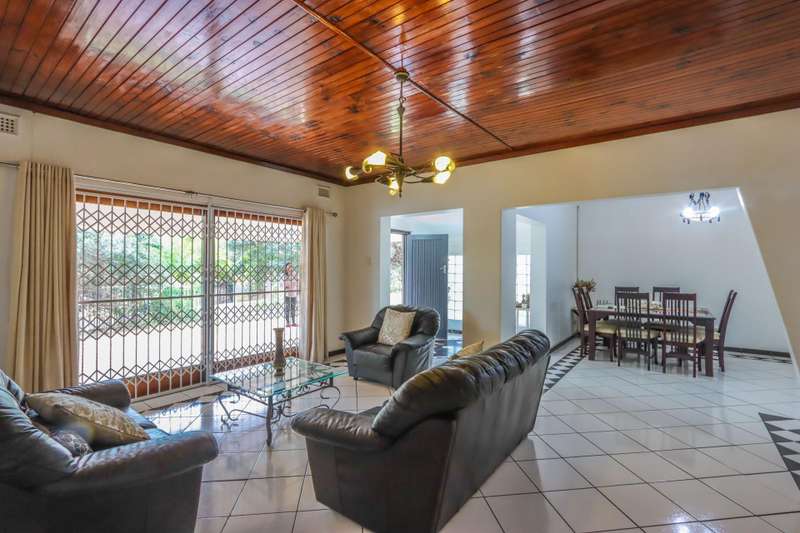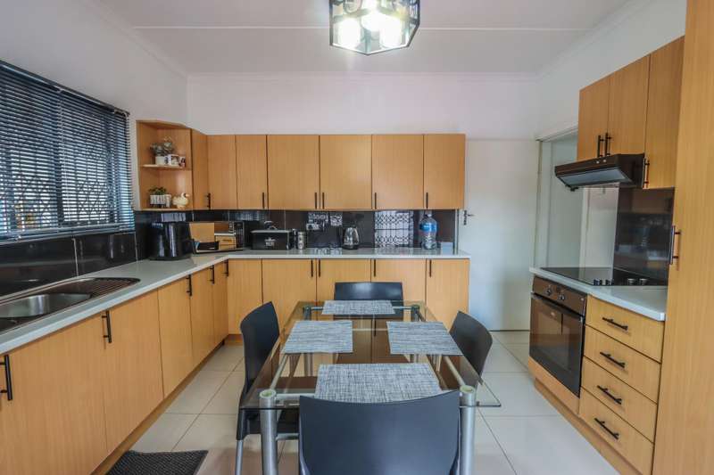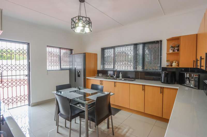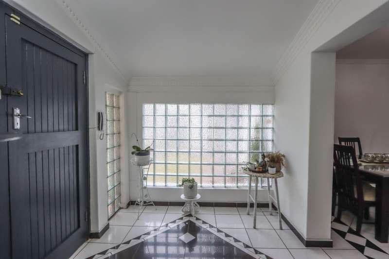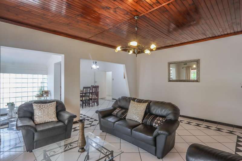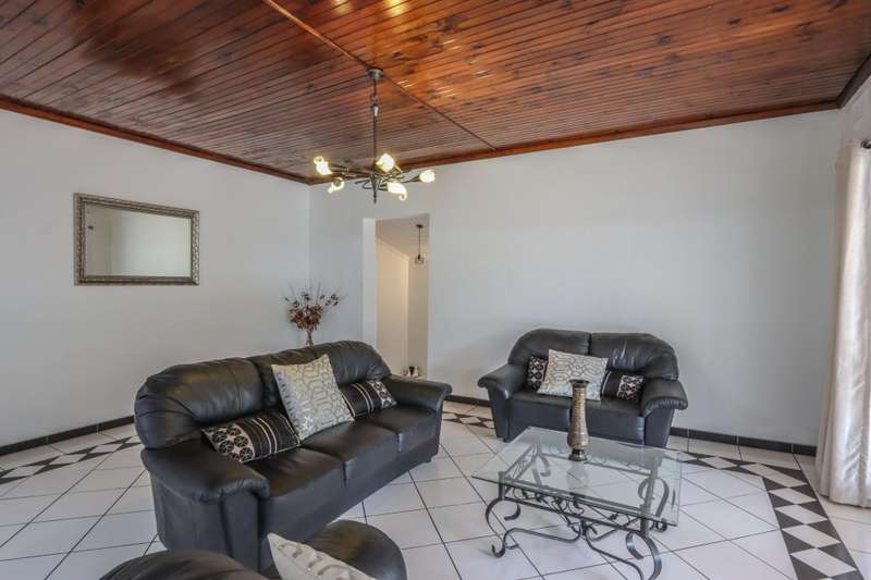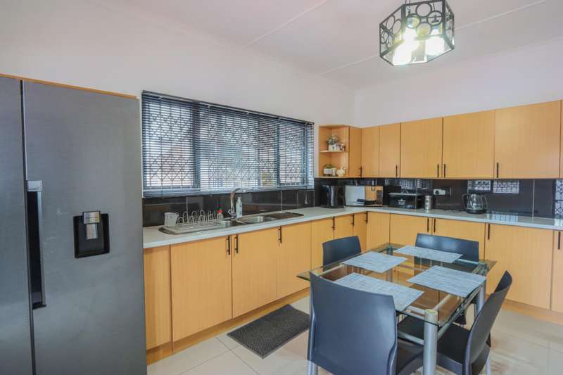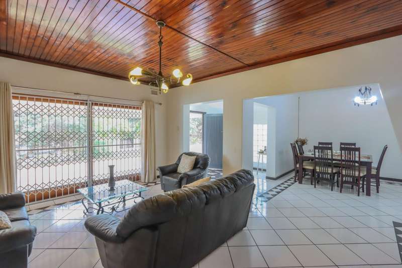 The moment you see this home from the electric gates, you will know, most definitely, that you should be the owner. From its pale grey roof, to the beautiful glistening white walls and modern pale grey tiling around the unusually designed pool, everything matches, all white and grey. You enter into a lovely glass hallway, through a matching grey front door and on the right hand side is a spacious, square lounge, providing a comfortable space for relaxing or entertaining your family and visitors. A large picture window offers a view of the enormous covered patio and pool. On the left side you will notice the separate dining room, perfect for all your happy meals..There is a gourmet, square kitchen, that is a chef's delight, beautifully fitted out, offering lots of storage and functionally for all your culinary requirements, with granite work tops and lovely wooden cupboards and big enough for a family breakfast table in the centre. Five double sized bedrooms, offering modern built in cupboards are available, four down a wide passageway and the fifth one at the other end of the house. There are two modern bathrooms, one being an en-suite in the main bedroom, that has its very own spa bath. .Also at the other end of the house, is another large lounge, measuring the whole width of the house, close to this is a perfect area for a prayer room or a guest bathroom. Going out of the back.door, there is a staff room with a shower and toilet that could also be another guest suite, if desired. The garden and paving around this house is exemplary, so neat and beautifully done. I've not finished yet, there is also a big double garage to house your precious vehicles in, with matching grey doors. It is quite a large piece of ground with a wide frontage and the owner has installed work of the art beams and alarms all around for your perfect safety. If something special is what you are looking for, then this is it. Give me a call and I will arrange an appointment to view.