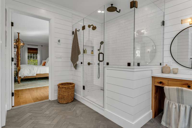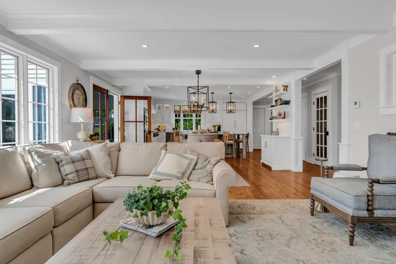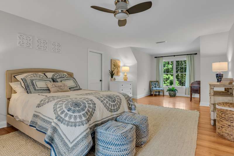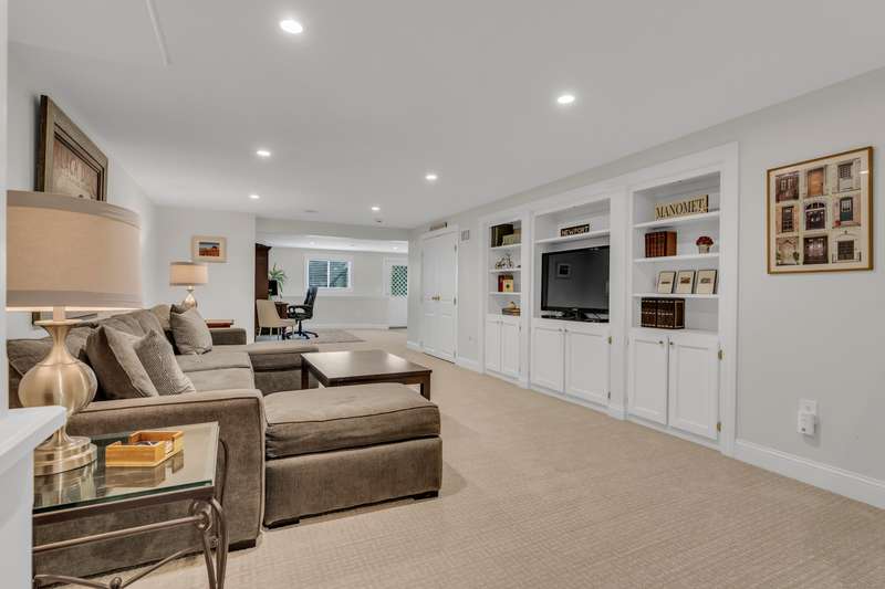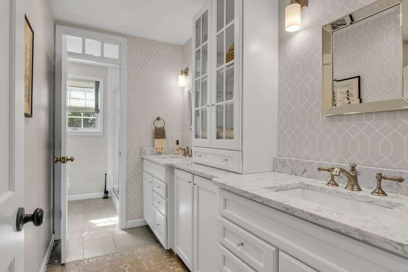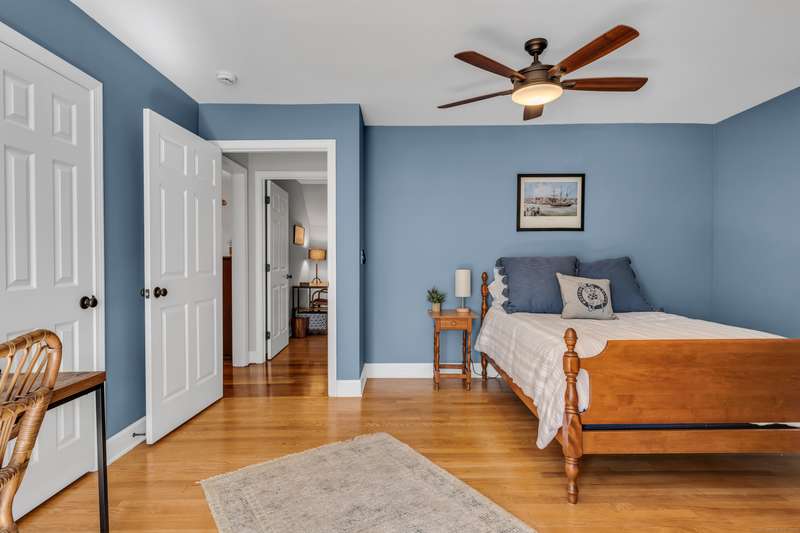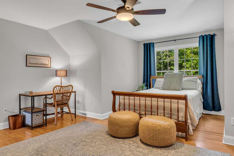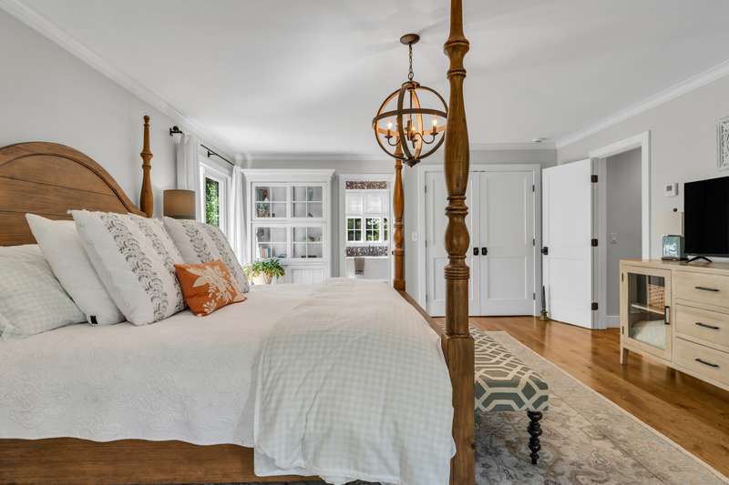 Multiple Offers Received!! Offer Deadline Sunday at 3:00! This charming, impeccably renovated Mordecai-built Cape in the Guilford Lakes district offers 4 beds and 3.1 baths, including the rare luxury of two primary suites-one on the main level and one upstairs-each with beautifully updated bathrooms. Two more generously sized bedrooms and a third renovated bath complete the second floor. The home underwent a major renovation in 2018, featuring a stunning Covenant kitchen with an oversized quartz island, double wall ovens, propane cooktop with four burners plus griddle, and custom lighting designed for both beauty and function. A cozy three-season porch with double antique wood doors extends the living space and overlooks the picturesque yard dotted with natural outcroppings and beautiful plantings. The finished walkout basement (new carpet in 2023) offers even more living space, complete with custom built-in bookcases-ideal for a media room, home office, or library. Outdoor living sh