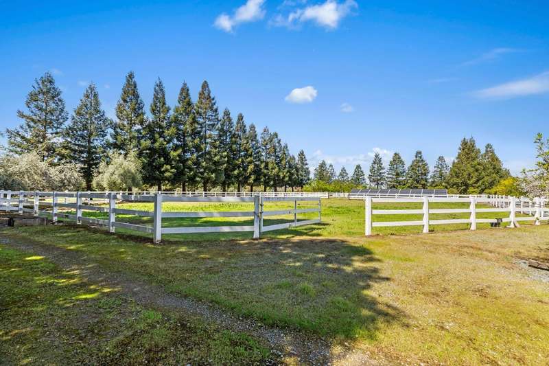 Welcome to 5000 Peach Blossom Ln - A Private, Luxury Retreat on 3.22 serene acres, single-story estate offers the perfect blend of elegance, comfort, and equestrian excellence. Built in 2003, this expansive 4,678 sq. ft. home features 5-6 bedrooms and 3.5 bathrooms with 3 distinct wings. At the heart of the home is a chef's dream kitchen, with top-of-the-line Viking appliances, a Sub-Zero refrigerator, oversized center island with sink, a separate prep sink by the cooktop, warming drawer, double ovens, and a spacious walk-in pantry. The finished 3-car garage offers ample storage, while 72 fully owned solar panels provide energy efficiency for both the home and the pool. Step outside and discover your own resort-style oasis. The oversized pool features 3 waterfalls, surrounded by lush landscaping, a peaceful koi pond, and an abundance of fruit trees. For equestrian enthusiasts, this property is truly exceptional. It features two arenas, including a 100x160 covered arena equipped with sprinklers, lighting, water, and coarse sand. The custom-designed horse barn includes covered stalls with power and water, dedicated wash bay, tack & feed room, and a full bathroom. Additional amenities include an RV pad and OID irrigation. This is more than just a home it's a rare opportunity!