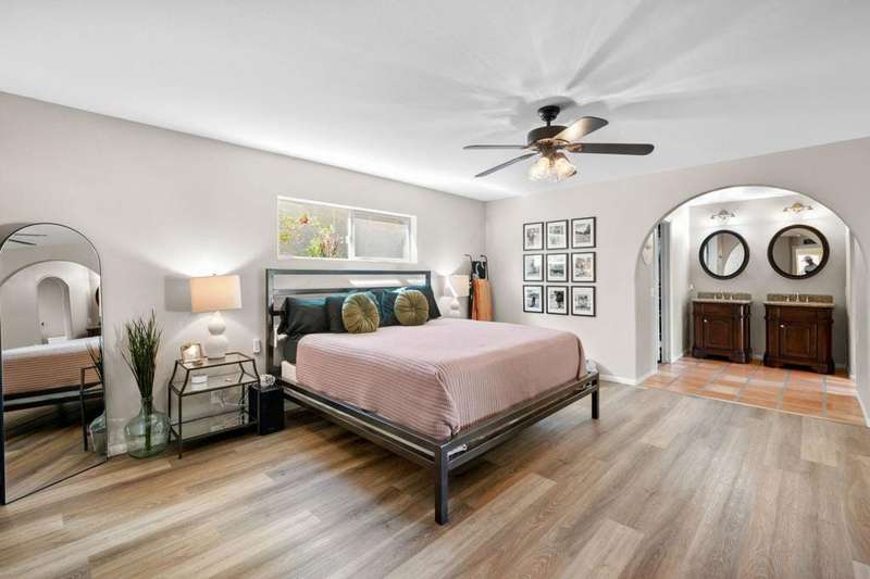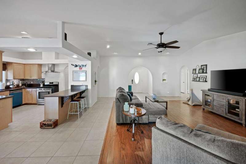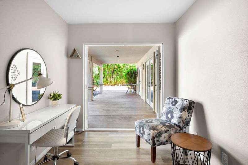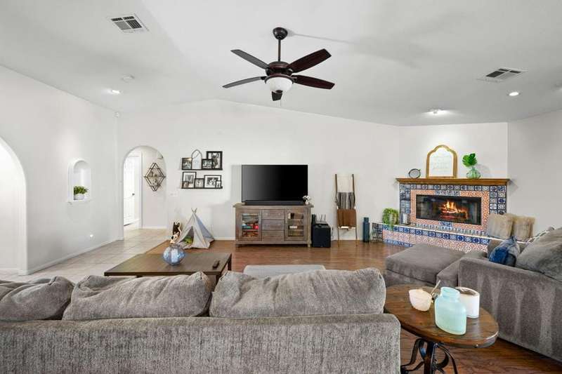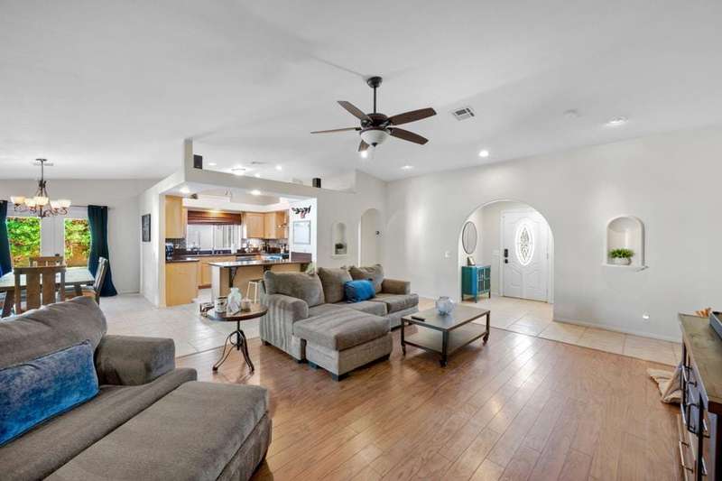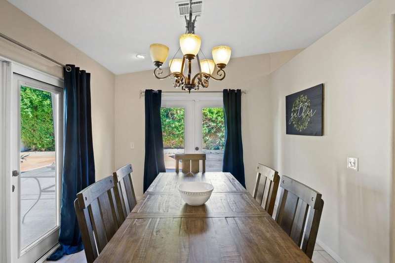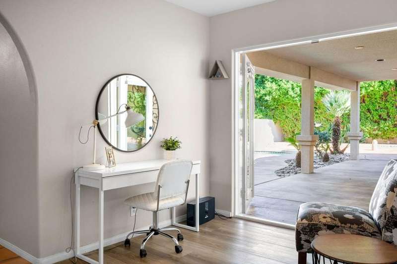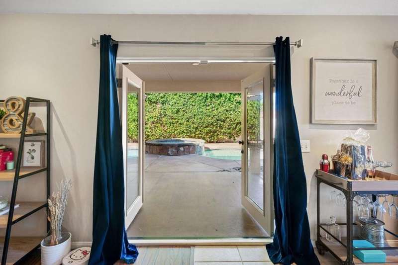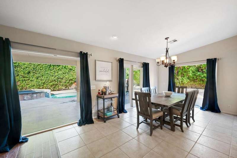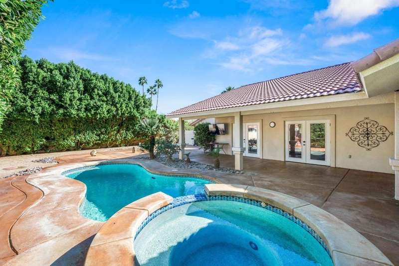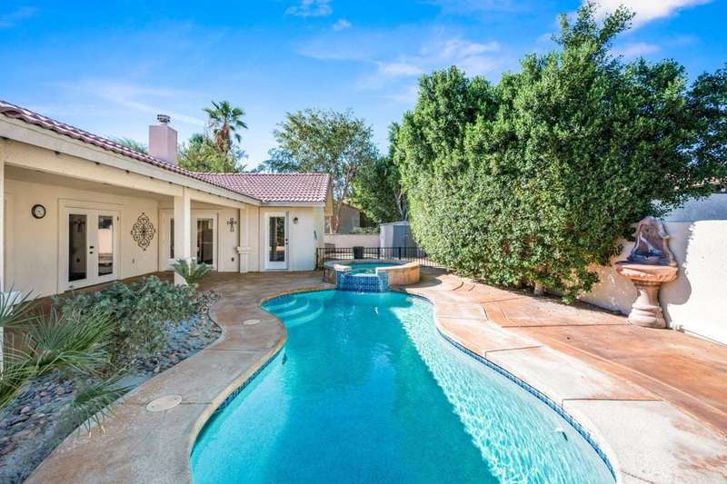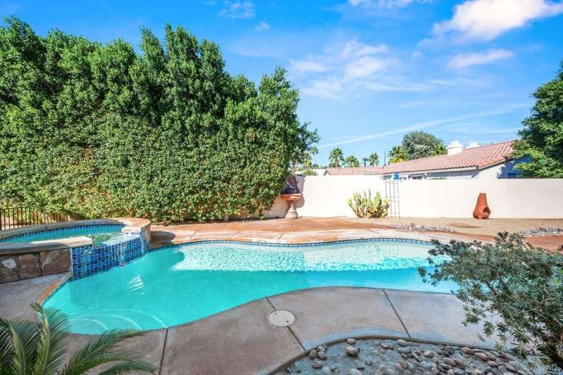 Luxury Living in Bermuda Dunes Country Club - Stunning Custom 4-bedroom, 3-bathroom home featuring an open floorplan with exceptional flow for everyday living and entertaining. The oversized great room boasts a tiled accent fireplace and opens to a spacious kitchen and formal dining area. Three sets of double French doors connect the great room and dining room to the backyard, and pool view creating a seamless indoor/outdoor experience.The split-bedroom layout offers privacy, with one bedroom on one side of the home and three--including the luxurious primary suite--on the other. The primary suite includes a versatile seating area ideal for a home office, and a spa-like bathroom with dual sinks and a walk-in shower.Enjoy resort-style living in the backyard oasis with a saltwater pool and spa. A three-car garage provides ample space for vehicles, storage, and a golf cart. This home is perfect for those seeking comfort, style, and functionality
