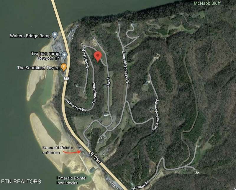 ON GOOGLE MAPS use neighbor's address of ''2088 Ivy Way'' & turn left on Lakeshore Way just before that home and drive a short way down & around that street. FROM NEWPORT take Hwy 25N toward White Pine approximately 5.8 miles. Emerald Pointe entrance is on the Right. FROM KNOXVILLE take I-40E to exit 424 (TN-113/Dandridge). Turn left onto TN-113N. Turn Right onto Nina Rd. Turn right onto TN-32S. Go through White Pine. Emerald Point is 2nd entrance on left just past the TVA boat ramp. Take entrance road toward the top, curving left as you ascend until you get to the intersection of Lakeshore Way & Ivy Way. Turn left on Lakeshore Way. Sign in yard. (Though in the mountains, the road of this subdivision is a gentle paved drive.)