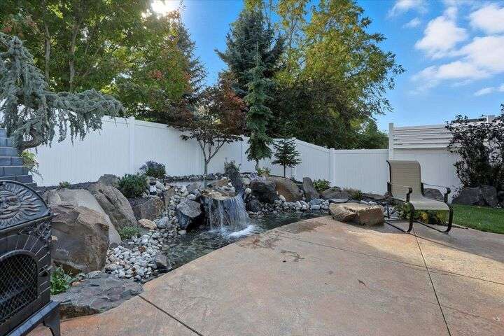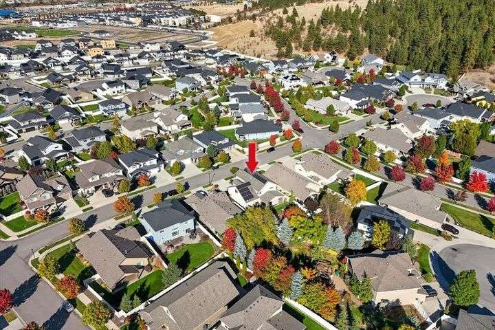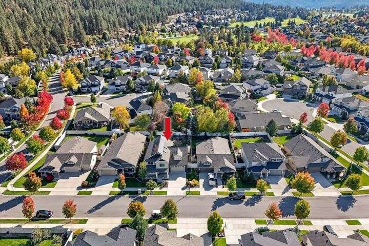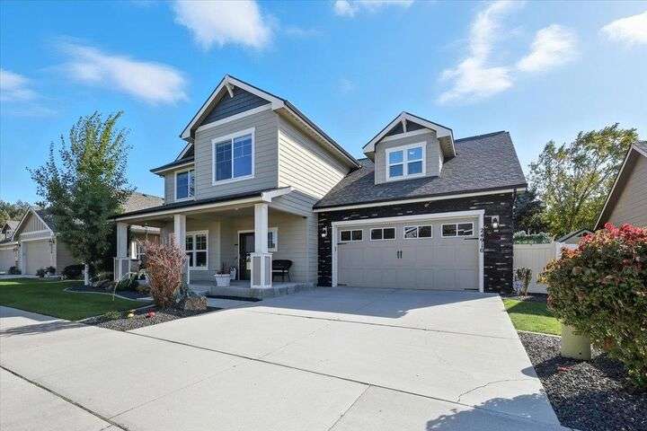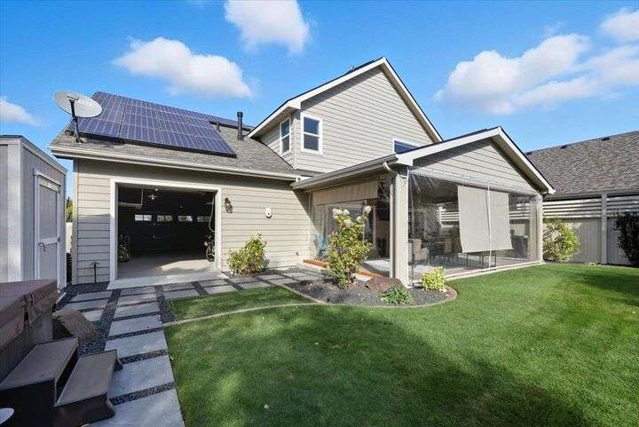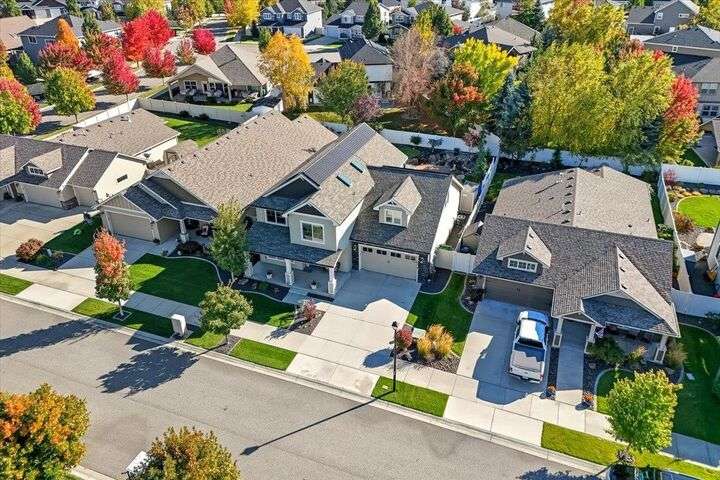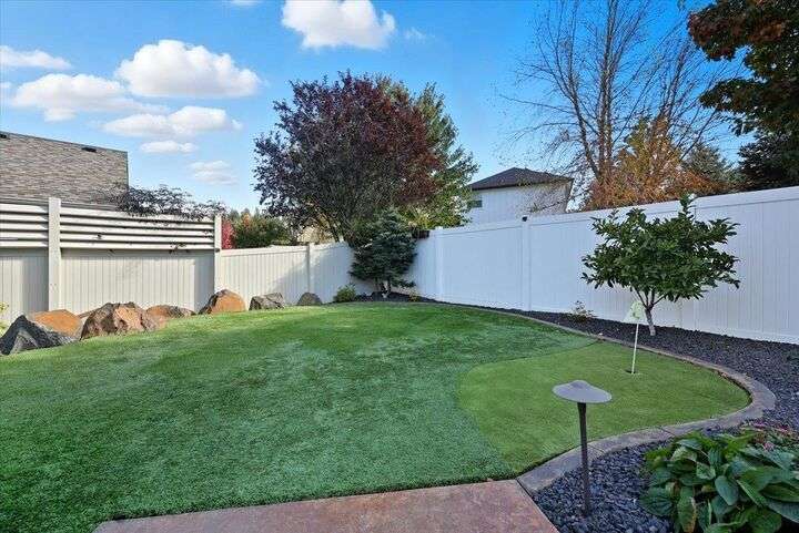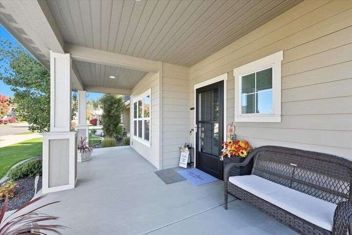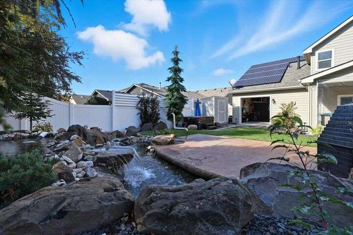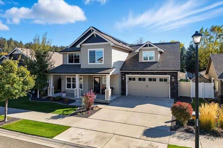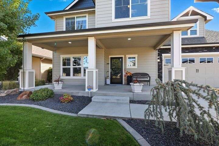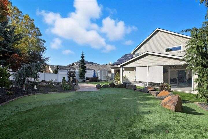 2016 Spokane Parade of Homes showpiece! The sought-after Addison by Greenstone offers 2,650 sq ft, 4 bedrooms, 3 baths, office, and an oversized 3-car tandem garage that opens through to the backyard. Designer finishes include Black Pearl granite, Huntwood cabinetry, stainless appliances, gas range, convection oven, and marble-tiled fireplace with built-ins. Light-filled stairwell with skylights, spacious primary suite with mountain views, dual vanity bath, and walk-in closet. Dual water heaters, bonus room with new Murphy bed, extra attic insulation, and whole-house water filtration. Outside enjoy a landscaped retreat with $116K in upgrades—tranquil waterfall, turf putting green with tee box, and stamped concrete patio. Covered patio enclosure with lighting, fans, and clear vinyl panels creates a year-round outdoor living space. Energy-efficient features include owned 44-panel solar array (avg. $135/mo utilities), new 2022 roof, and central A/C.