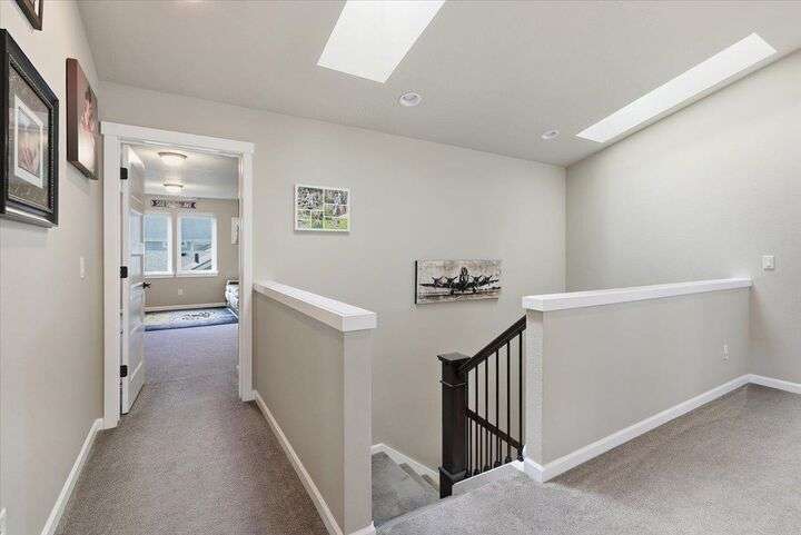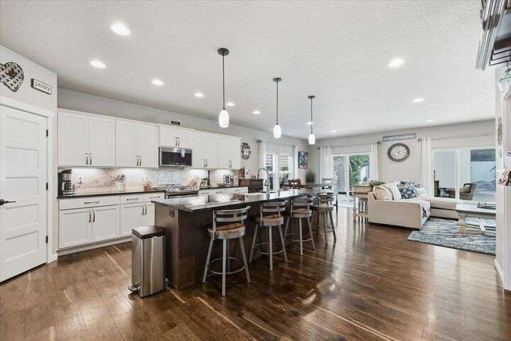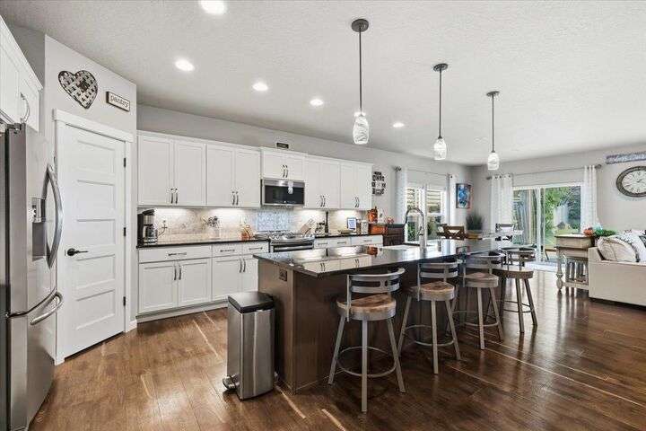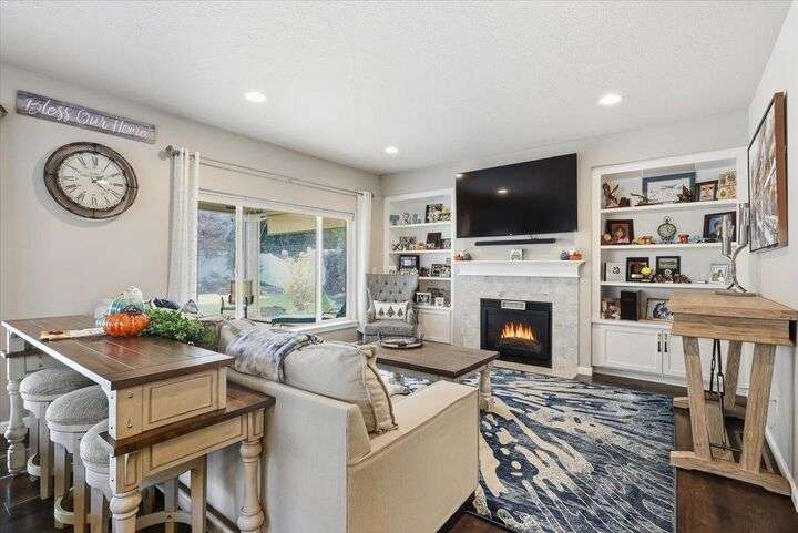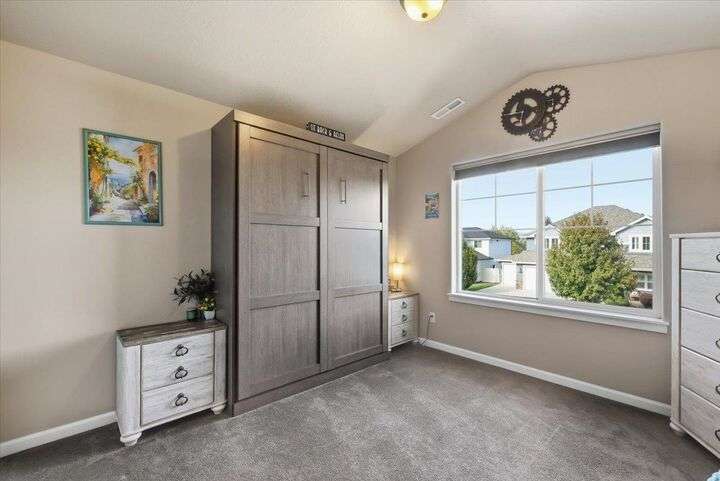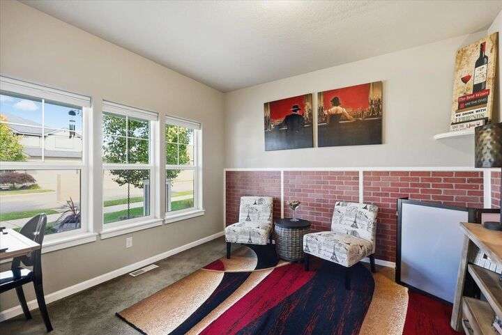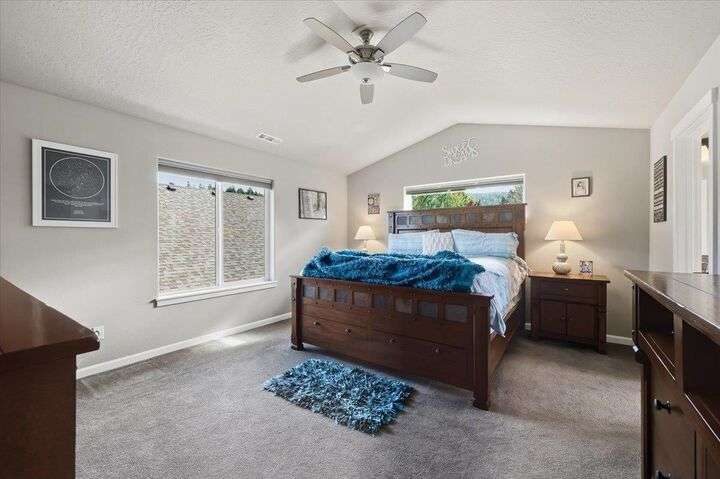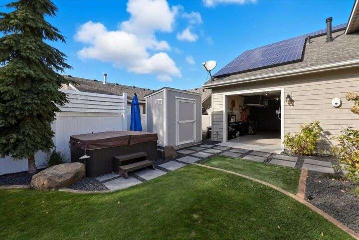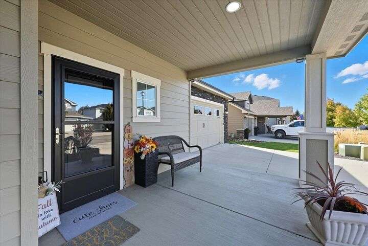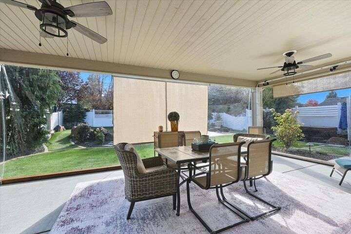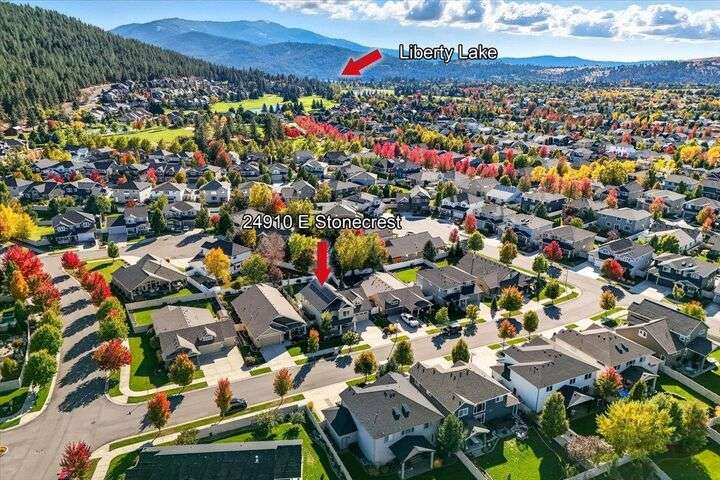 2016 Spokane Parade of Homes showpiece! The sought-after Addison by Greenstone offers 2,650 sq ft, 4 bedrooms, 3 baths, office, and an oversized 3-car tandem garage that opens through to the backyard. Designer finishes include Black Pearl granite, Huntwood cabinetry, stainless appliances, gas range, convection oven, and marble-tiled fireplace with built-ins. Light-filled stairwell with skylights, spacious primary suite with mountain views, dual vanity bath, and walk-in closet. Dual water heaters, bonus room with new Murphy bed, extra attic insulation, and whole-house water filtration. Outside enjoy a landscaped retreat with $116K in upgrades—tranquil waterfall, turf putting green with tee box, and stamped concrete patio. Covered patio enclosure with lighting, fans, and clear vinyl panels creates a year-round outdoor living space. Energy-efficient features include owned 44-panel solar array (avg. $135/mo utilities), new 2022 roof, and central A/C.