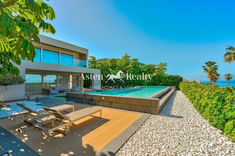 There is an independent kitchen very spacious and fully equipped with high end appliances, it also has an American fridge and wine cellar. At the same time the kitchen has large doors, which connect it with the living room. There is also an office room, which could also be used as a bedroom and there is also a toilet. From the living room through large windows leads to the terrace and garden area, where there is a magnificent infinity pool and a nice area for sunbathing and enjoying the magnificent views. The villa is surrounded by a garden with beautiful plants and palm trees.
