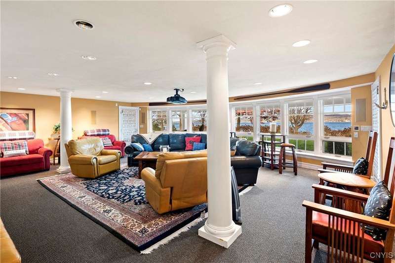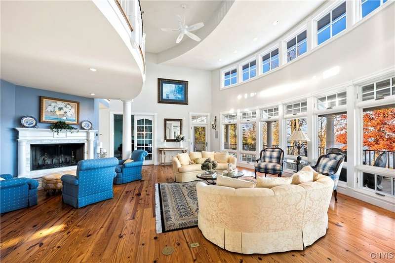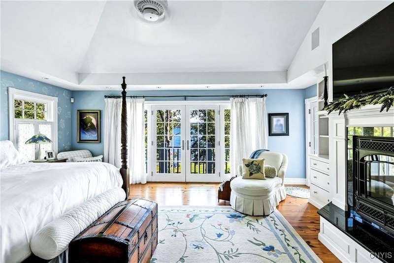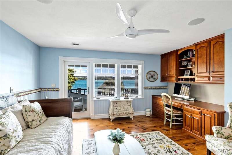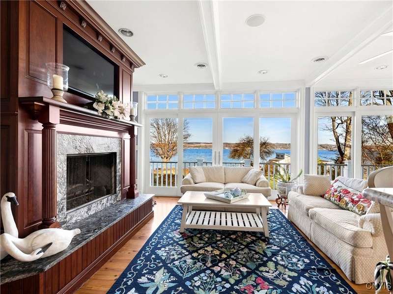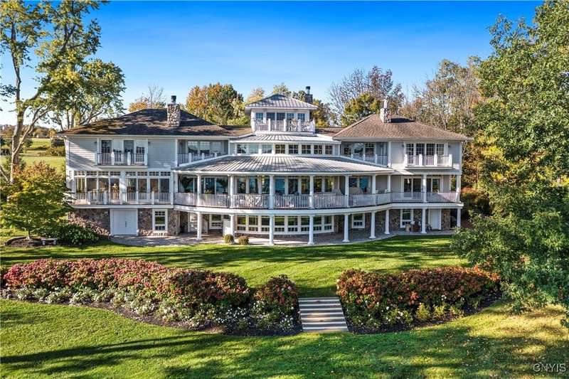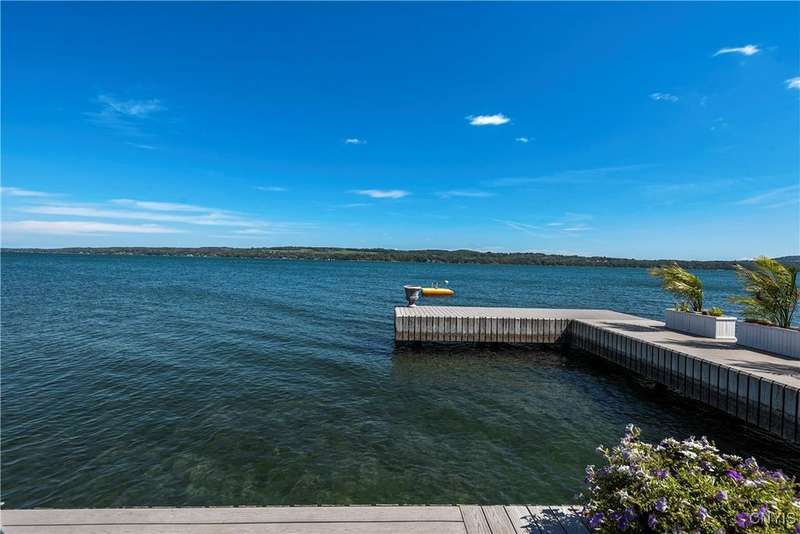 Welcome to this magnificent 7,700 sq ft customed designed mansion estate situated on 160 feet of private, level lake front on pristine Skaneateles Lake. The large permanent dock and covered boat slip complete with power and water is perfect for boat and jet ski docking. This property includes a dockside cottage complete with living area, half bath and 10' x 16' open deck where you can relax and enjoy the panoramic lake views. The expansive well manicured grounds lead you to the mainhome where you can enjoy a mahogany wrap around covered veranda perfect for entertaining or just watching the lake activities. Upon entering the home you are greeted with 18 ft ceilings with floor to ceiling custom Marvin windows and 110 year old refurbished heart pine wide plank floors. The living area has ample space for entertaining and sitting around a cozy fireplace. The music room is located off the living room which can be used not only as a music room but also a den or study. The dining room is separated by 10' high glass French doors and leads to the gourmet kitchen with high end professional appliances and plenty of counter and island place to please any chef or food enthusiast. Also on this floor is an ADA adaptable primary bedroom suite with walk in shower and adaptable counter space. This room also enjoys a gas fireplace and doors that open onto the covered patio. The second floor balcony overlooks the living area and a panoramic view of the beautiful yard and lake. Here you will find the primary bedroom with a full bathroom complete with dual granite vanities and a full dressing room with a free standing claw foot spa like tub. The primary suite has a granite fireplace and open deck that overlooks the lake. There are two more guest suites and an office located on the other side of the primary. A spiral staircase takes you to the third floor rooftop lookout tower clad in mahogany paneling perfect for reading, meditation or sitting out on the open deck and enjoying the sunrise. This home was built to inspire and endure and celebrate the beauty of Skaneateles Lake!