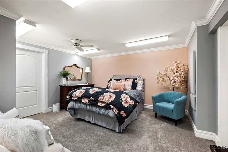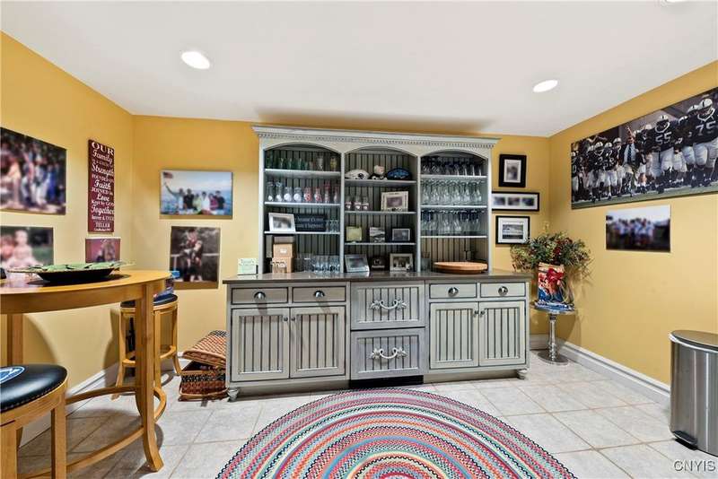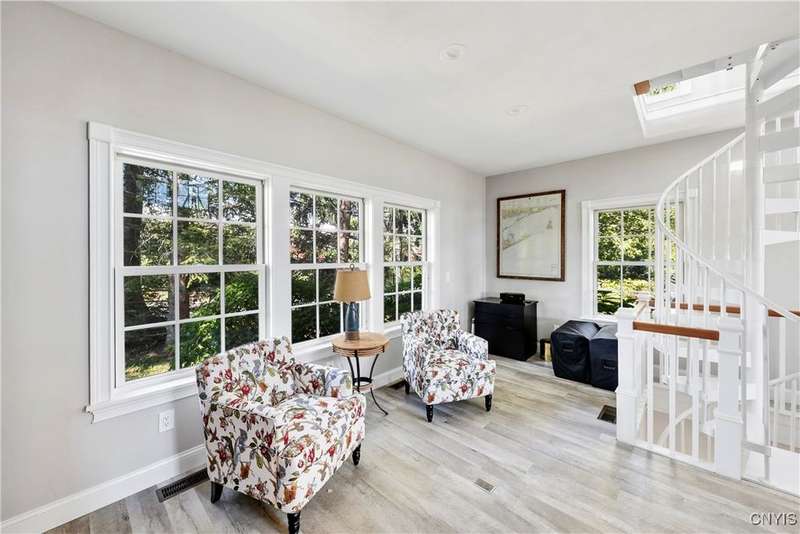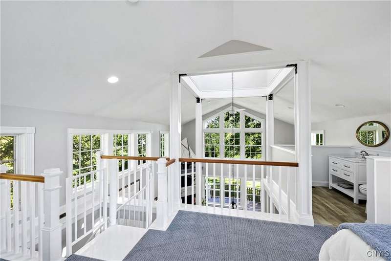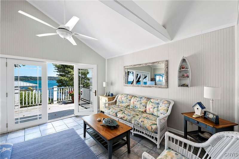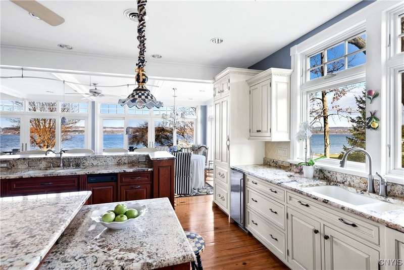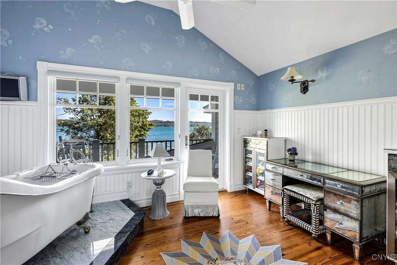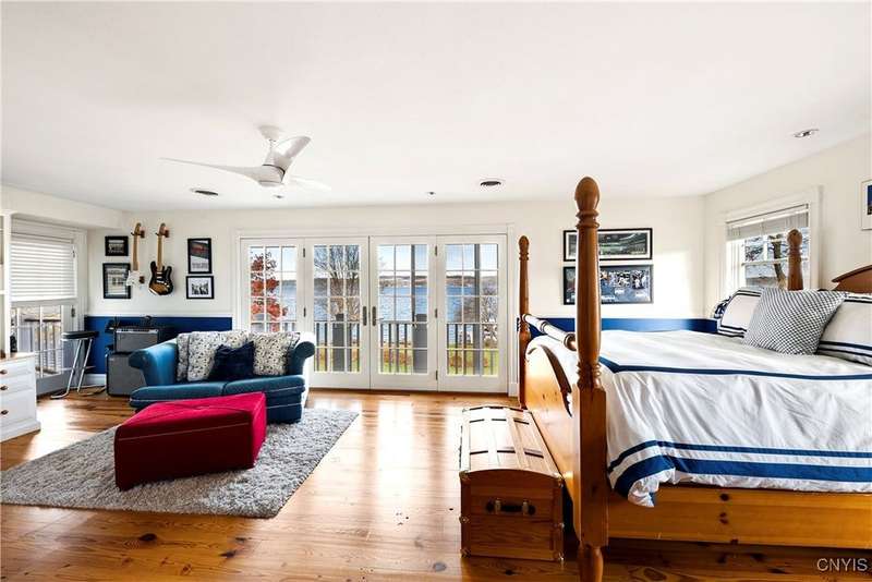 Welcome to this magnificent 7,700 sq ft customed designed mansion estate situated on 160 feet of private, level lake front on pristine Skaneateles Lake. The large permanent dock and covered boat slip complete with power and water is perfect for boat and jet ski docking. This property includes a dockside cottage complete with living area, half bath and 10' x 16' open deck where you can relax and enjoy the panoramic lake views. The expansive well manicured grounds lead you to the mainhome where you can enjoy a mahogany wrap around covered veranda perfect for entertaining or just watching the lake activities. Upon entering the home you are greeted with 18 ft ceilings with floor to ceiling custom Marvin windows and 110 year old refurbished heart pine wide plank floors. The living area has ample space for entertaining and sitting around a cozy fireplace. The music room is located off the living room which can be used not only as a music room but also a den or study. The dining room is separated by 10' high glass French doors and leads to the gourmet kitchen with high end professional appliances and plenty of counter and island place to please any chef or food enthusiast. Also on this floor is an ADA adaptable primary bedroom suite with walk in shower and adaptable counter space. This room also enjoys a gas fireplace and doors that open onto the covered patio. The second floor balcony overlooks the living area and a panoramic view of the beautiful yard and lake. Here you will find the primary bedroom with a full bathroom complete with dual granite vanities and a full dressing room with a free standing claw foot spa like tub. The primary suite has a granite fireplace and open deck that overlooks the lake. There are two more guest suites and an office located on the other side of the primary. A spiral staircase takes you to the third floor rooftop lookout tower clad in mahogany paneling perfect for reading, meditation or sitting out on the open deck and enjoying the sunrise. This home was built to inspire and endure and celebrate the beauty of Skaneateles Lake!