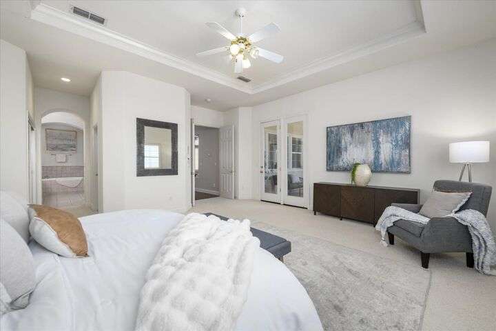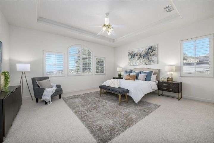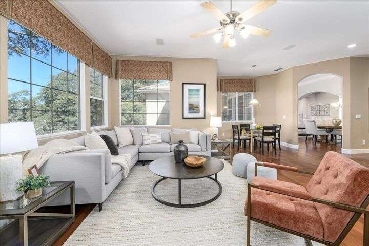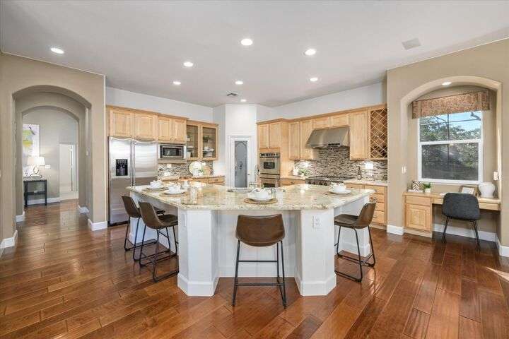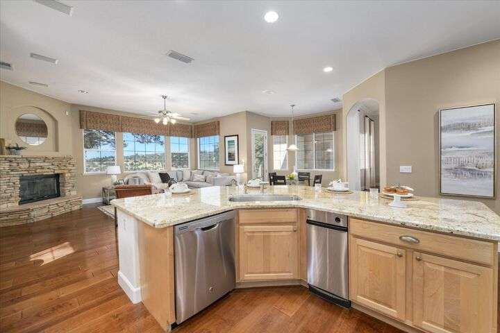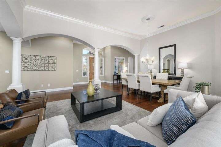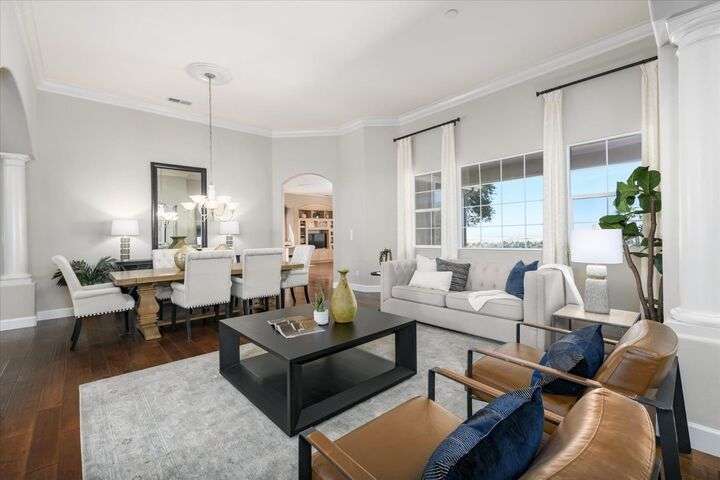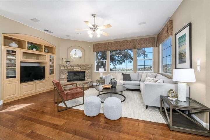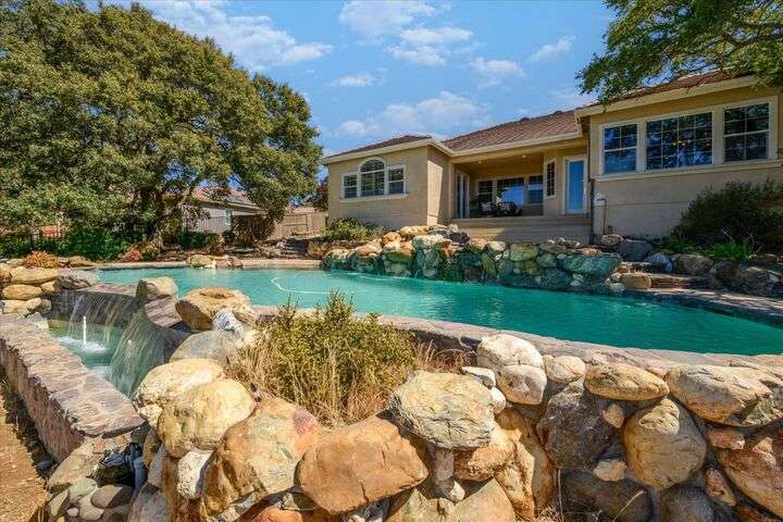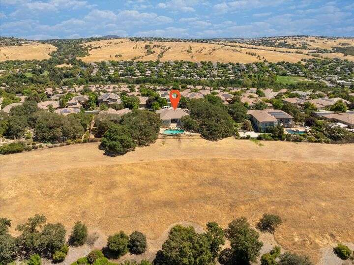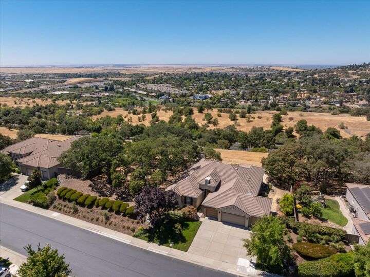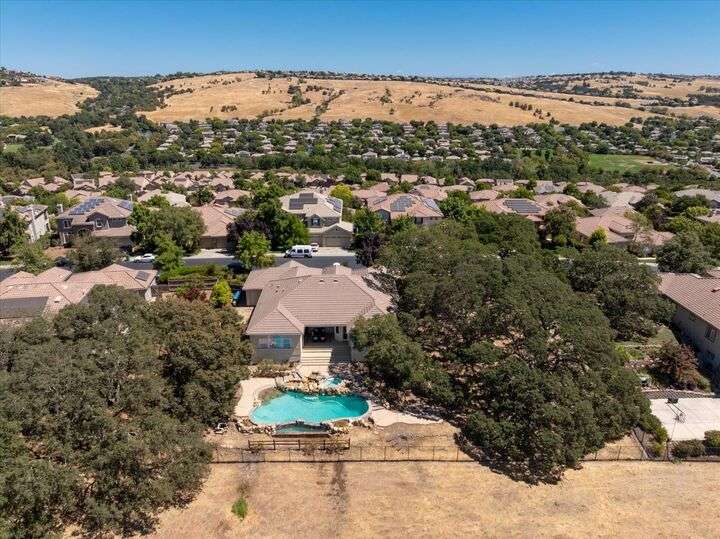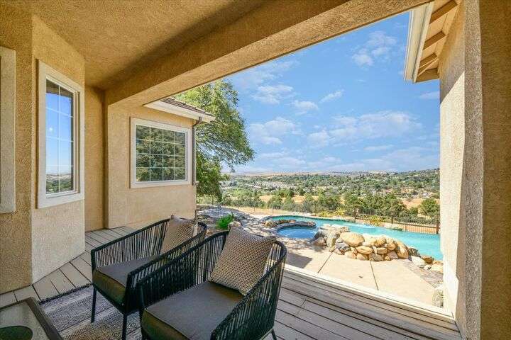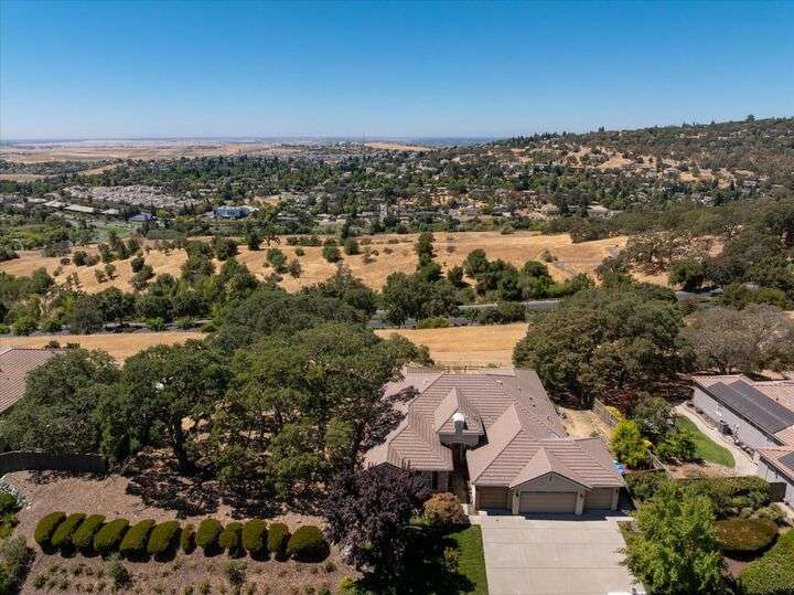 Welcome to your private retreat in the prestigious gated community of Serrano, where luxury living meets breathtaking scenery. This elegant single-story residence sits on a tranquil .57-acre lot shaded by mature oaks, offering unmatched privacy and serenity. Designed for both relaxation and entertaining, the home's open layout showcases a chef's kitchen with granite counters, stainless appliances, and a grand center island that opens to a spacious great room, while a formal living and dining room provide the perfect setting for entertaining with style. Expansive windows frame panoramic views of El Dorado Hills and the Sacramento Valley, filling the home with natural light. The primary suite is a true sanctuary, with direct deck access, a spa-inspired bath, and sweeping valley vistas. Outside, discover your resort-style escape with a sparkling infinity-edge pool, beach entry, and spa, where sunsets become your daily backdrop. A dedicated office or workout space, three bedrooms, and a rare 4-car garage complete the home's thoughtful design. Located in the highly desirable Oak Ridge High School district and surrounded by Serrano's trails, parks, and golf, this is more than a home it's a lifestyle.
