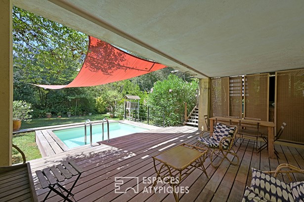 Outside, the private terrace overlooks a verdant garden with a swimming pool. The soothing murmur of the Lez River completes this idyllic picture. Ideally located, this rare property combines absolute tranquility and immediate proximity to the city.