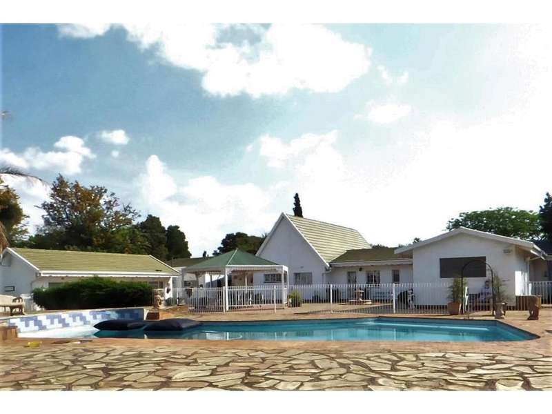 Are you looking for land for development, somewhere to keep your horses, possibly build additional homes for family members or simply want to enjoy the space and tranquility country life has to offer, but be close to everything? This is just what you have been looking for! Beautiful corner property close to Bullfrog Pan. Endless rolling lawns and large trees. The family home offers four large bedrooms and a study or fifth bedroom. Two modern bathrooms plus a separate guest loo. A farmhouse sized kitchen, separate dining room and a cosy lounge which opens out to the garden and a courtyard. The house is fully tiled. There is an enormous swimming pool, Jacuzzi room and pretty poolside gazebos. Overlooking the pool area is a separate building housing a games room and pub. Outside laundry room, maids accommodation and a double auto garage. A large IBR carport for another six vehicles. The property has three phase power and a strong borehole. Income generating cottage Spacious lounge and enclosed sun room. Well fitted kitchen and one tiled bedroom plus a full en suite bathroom. Separate entrance and a walled garden. To delight a young couple or gran and gramps. Call for more information and an appointment to view.