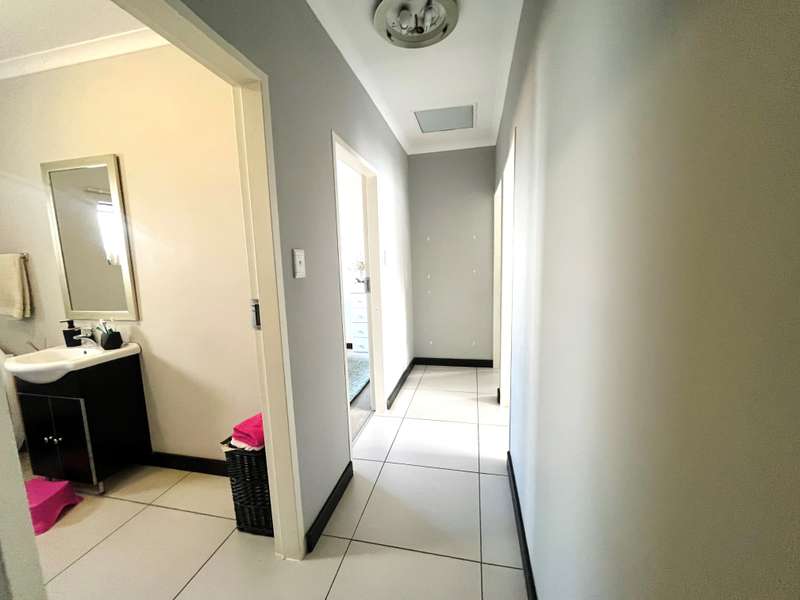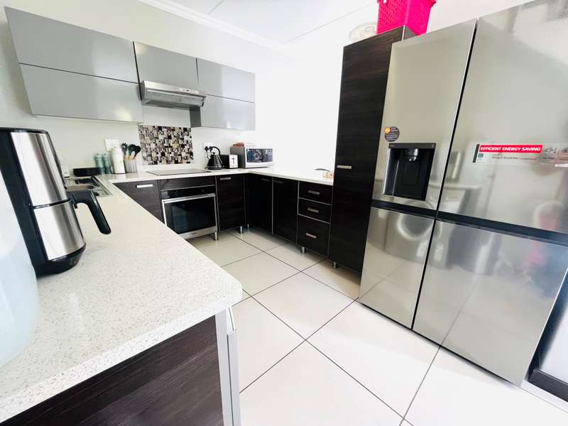 This magnificent family starter apartment is at the perfect location close to all the basic amenities like Shopping centres, Malls , Hospitals, best Schools and public transport. The home boasts an open plan spacious lounge and an open plan kitchen fitted with modern built-in cupboards. The kitchen tops are made of a stunning ceasar stone. There's space to accomodate a double door fridge, a washing machine and a dishwasher. A new 4 plates touch electric stove and an extractor have just been installed. Upstairs are 3 bedrooms all fitted with built-in cupboards. There's a separate bathroom with a shower and a bath tub, and the main bedroom has an ensuite bathroom. There's 2 double garages for safe parking, and ample visitors parking space. Electricity is prepaid. Come a view this stunning home.
