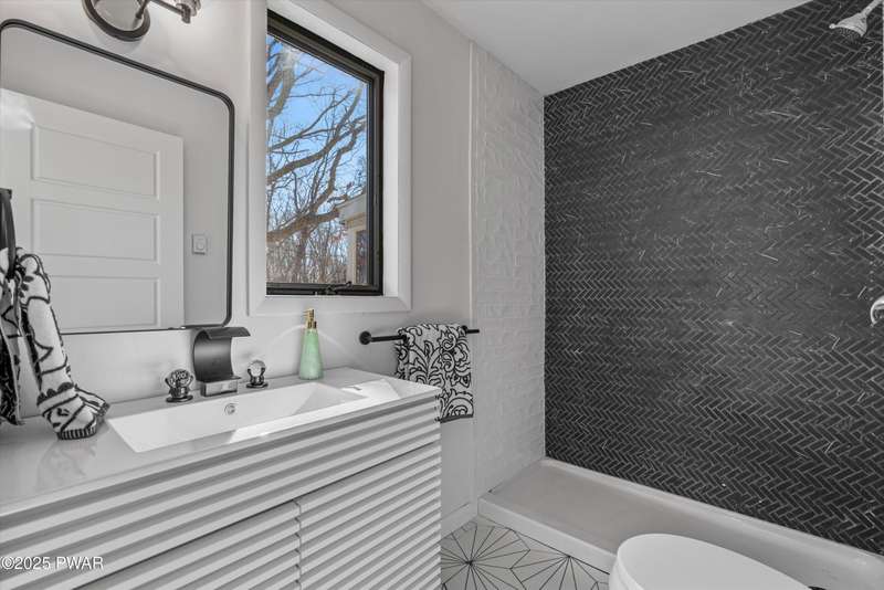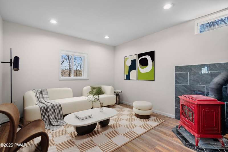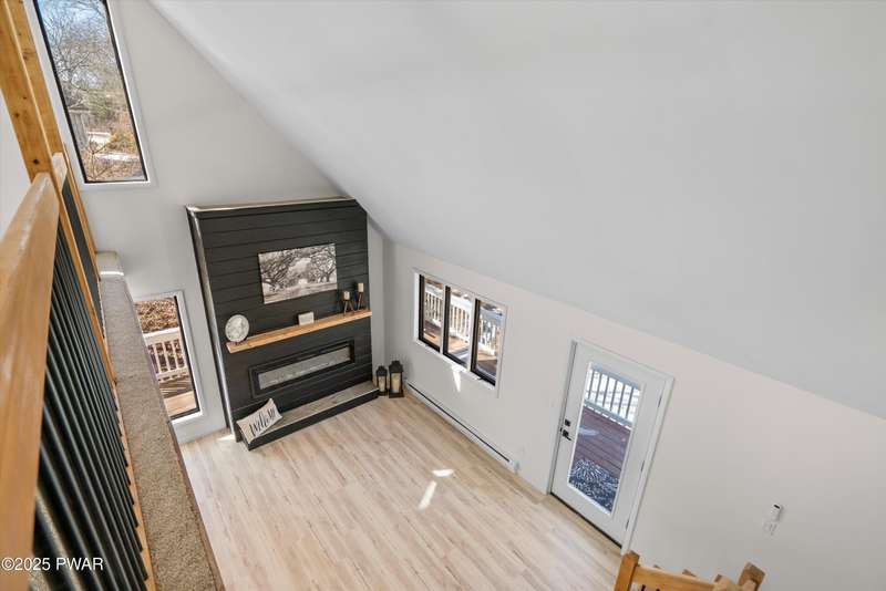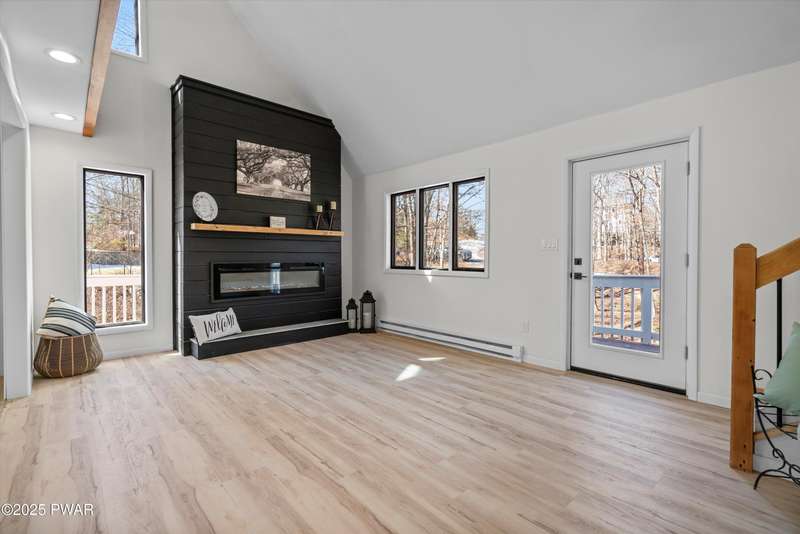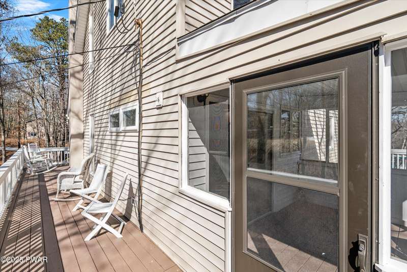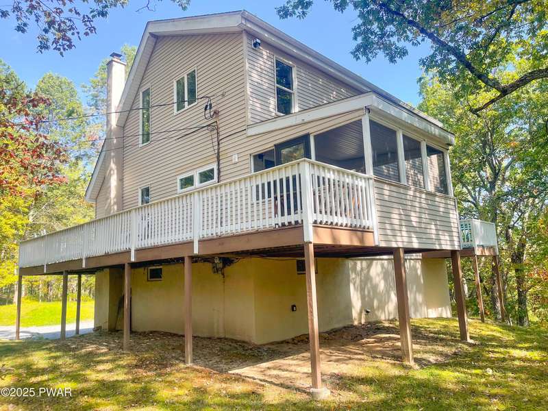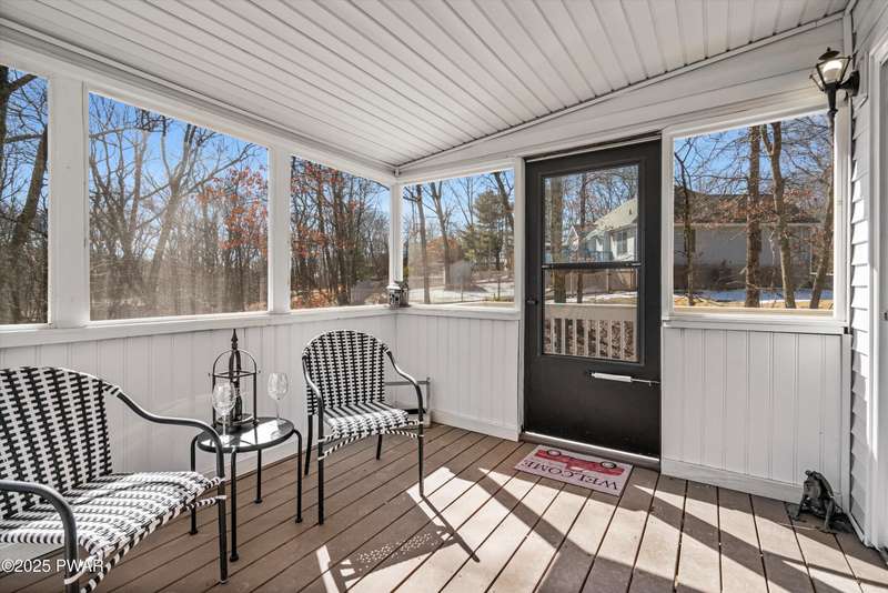 Welcome to the good life in Hemlock Farms! This completely remodeled home is a true gem, designed for both comfort and privacy. Paired with an open-concept main living area, find a beautiful, modern fireplace that creates a cozy centerpiece. Following the custom-crafted kitchen ceiling that leads directly to a peaceful screened porch--perfect for morning coffee or evening relaxation.The main floor features the primary bedroom, complete with a personal balcony, and closet so spacious it could easily double as an office or nursery. A convenient half-bath on this level is perfect for guests. Upstairs, a spacious loft provides an ideal flex space, along with a guest bedroom and full bath. The lower level is an entertainer's dream, featuring a charming coffee bar, a family room with a propane stove, a third bedroom, and a third full bath. With an attached garage, this home truly has it all.