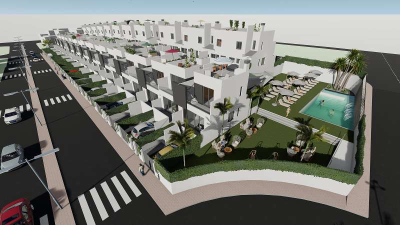 This collection of 44 semi-detached villas in Cox, Alicante, offering 2 and 3-bedroom layouts designed for comfort and style. Each villa includes a solarium, terraces, private patios, and parking, complemented by beautifully landscaped communal areas with a swimming pool.