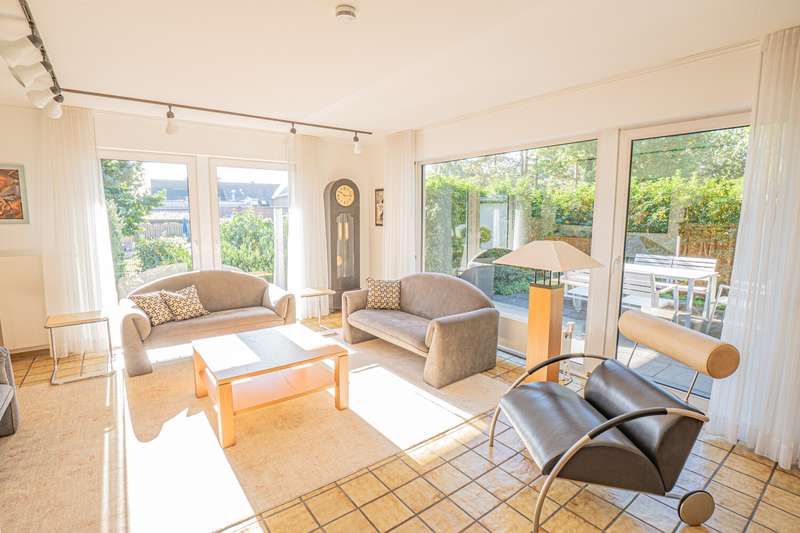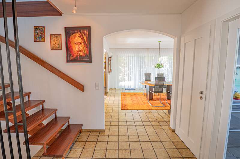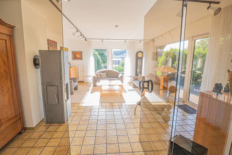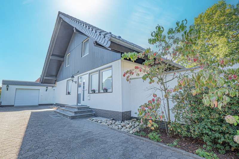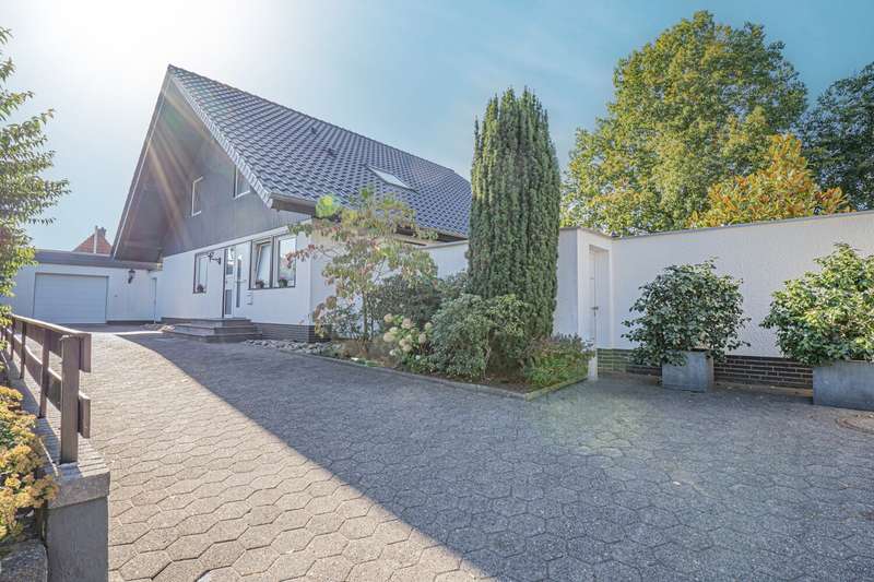 This charming detached house, which was built around 1980 on a lovingly landscaped plot, is located in a quiet and well-kept residential area of Rehden. The property offers a well thought-out room concept over a total of three levels and impresses with numerous highlights for comfortable living and flexible working. The first floor boasts a spacious living and dining area with a stylish fireplace. An elegant glass door discreetly separates the areas and emphasizes the high-quality ambience. Large, partly floor-to-ceiling windows create a bright, friendly atmosphere and offer direct access to two sunny terraces - ideal for relaxing hours outdoors. Adjacent is a separate kitchen with a modern fitted kitchen. The space on this level is complemented by a guest WC, a bathroom with shower and a room that can be used flexibly and is ideal as an office or guest room. The highlight on the top floor is a spacious gallery room with a large window front and direct access to the balcony. This light-flooded room can be used in a variety of ways - as an additional living area, studio or retreat. There is also another bedroom on this floor with an adjoining dressing room and two modernized bathrooms - one with a shower and double washbasin, the other with a comfortable bathtub. The property also has a full basement and therefore offers a wide range of usage options: In addition to the utility and laundry room, there are two further rooms that are currently used as guest rooms. These are equally suitable as hobby rooms or individual retreat areas. A special extra: there is also a separate bungalow on the property, which was used as a dental practice until recently. Both units - the residential building and the practice building - are offered separately, but can also be purchased together. Ideal for anyone who wants to harmoniously combine living and working. Have we piqued your interest? Then we look forward to hearing from you now! Please note: The energy certificate is currently being prepared and was not yet available at the time the advertisement was created. The official division of the property is still pending; the currently stated plot size is therefore based on a provisional estimate and may change in the course of the division. Please also note that the house does not currently have its own heating system. Heat is currently supplied via a central heating system in the adjacent bungalow, which supplies both units together.