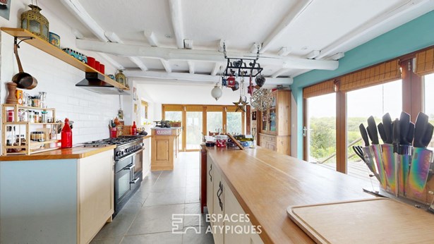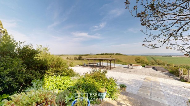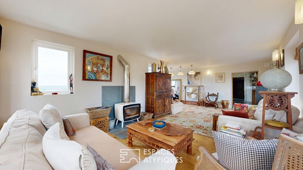 The house has five bedrooms, including a master suite with a large custom-made dressing room, two shower rooms, a bathroom, a cozy living room with a bar, a panoramic lounge opening onto the horizon, a fully equipped kitchen extending into a utility room, and a discreet entrance hall.