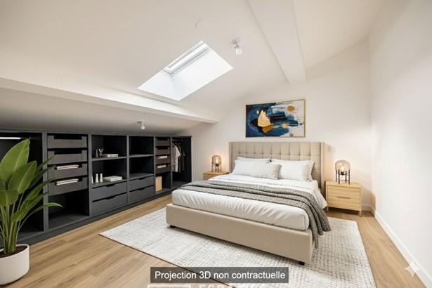The living space comprises a welcoming living room with clean lines, enhanced by beautiful hardwood floors and skylights. The open-plan kitchen, seamlessly integrated into the living room, blends functionality and design with its light-colored cabinets and marble-effect countertop. The overall effect is a soft and elegant atmosphere, ideal for a modern lifestyle. The bedroom, also with sloping ceilings, features a spacious custom-built dressing room that optimizes every corner. A refined shower room and a separate WC complete this perfectly laid-out apartment. Carefully renovated and situated on the top floor, this property stands out for its unique character and high-quality finishes. Its spacious attic rooms and clever layout make it a unique living space.