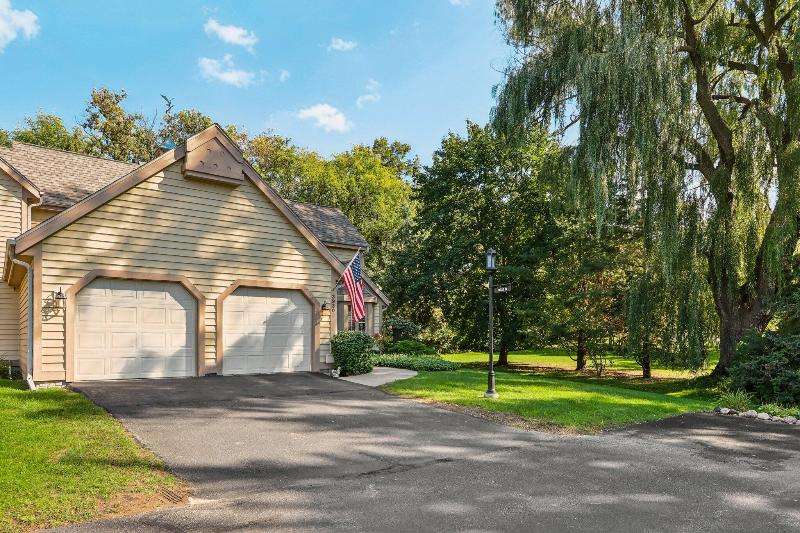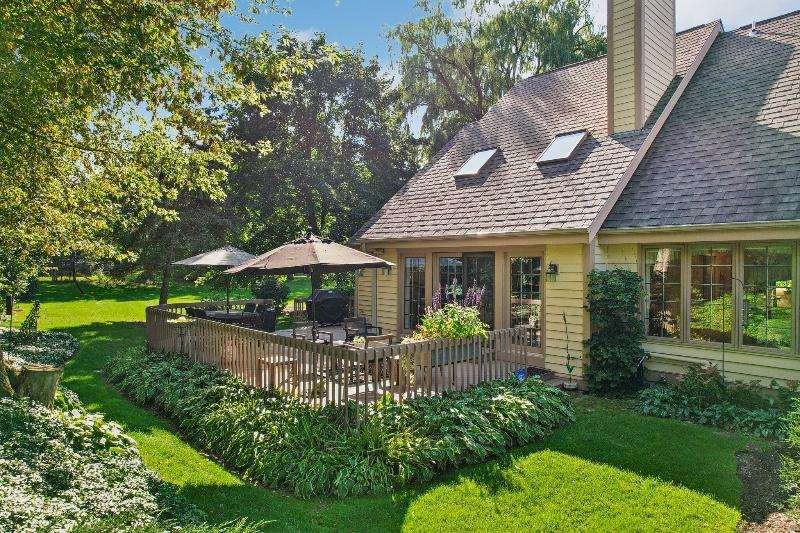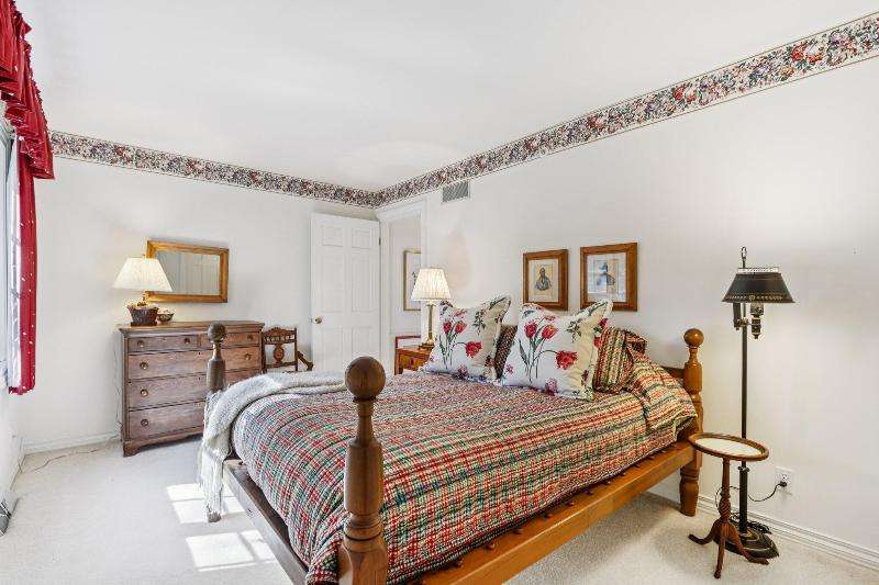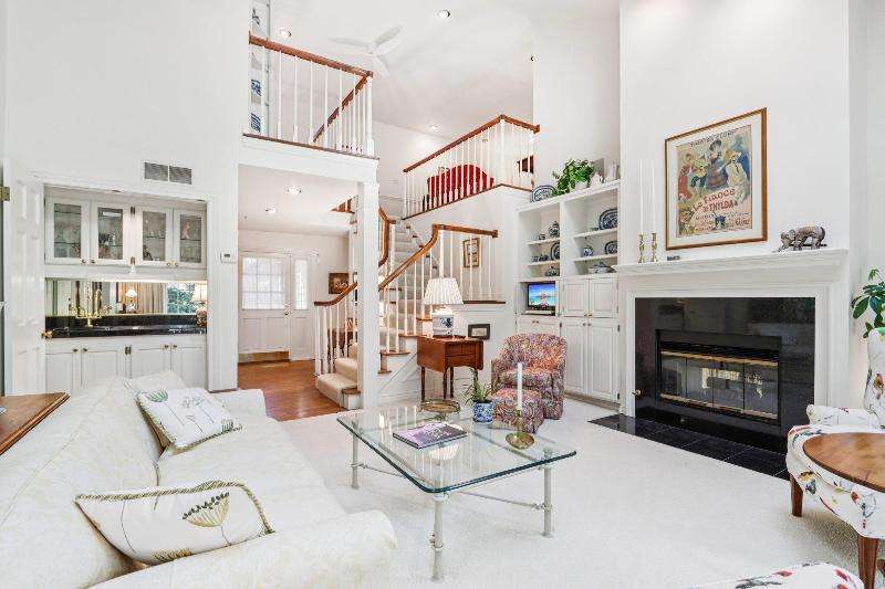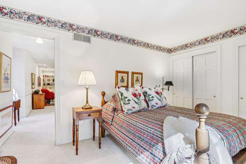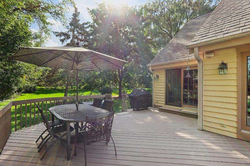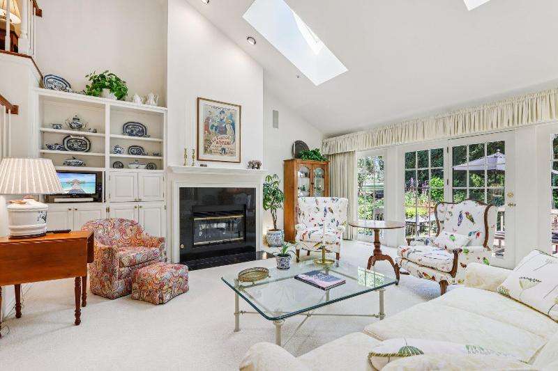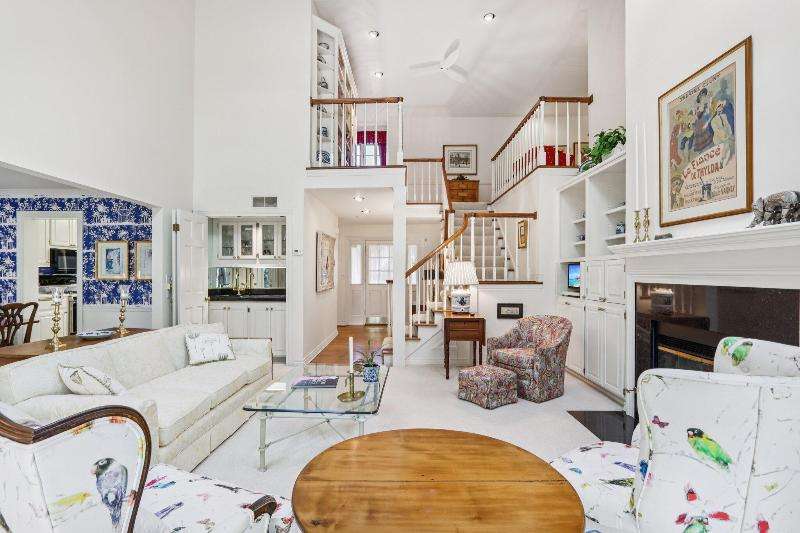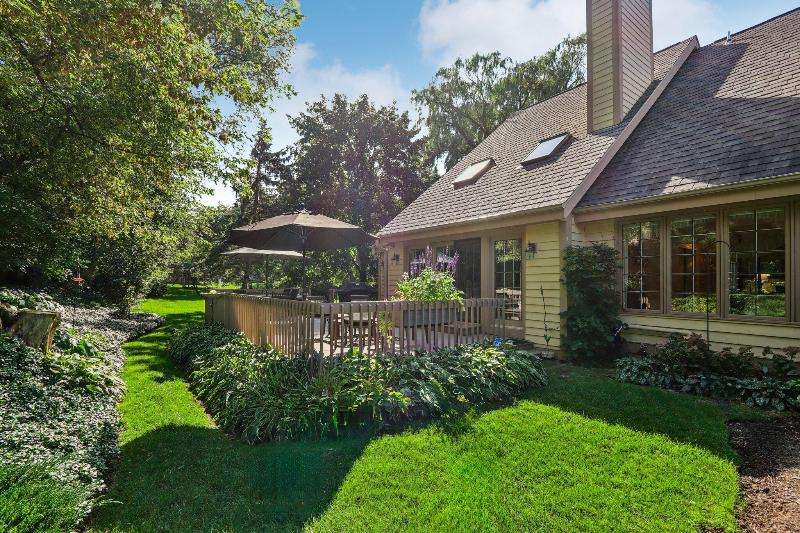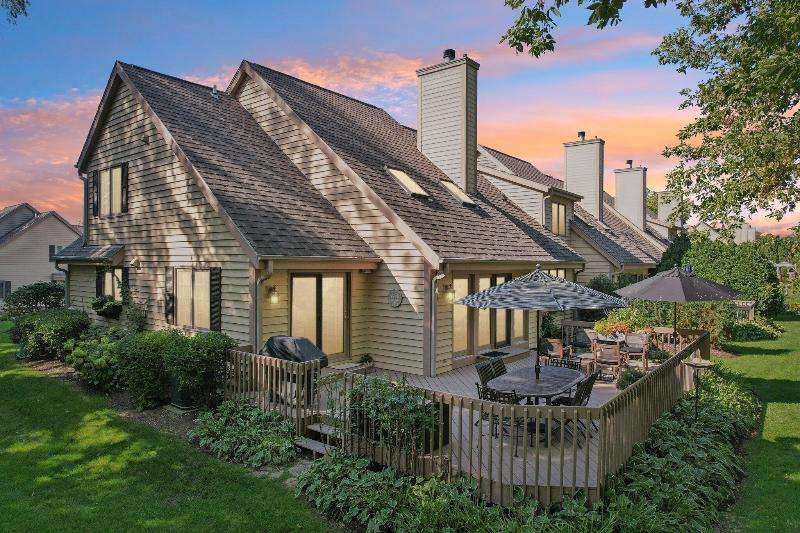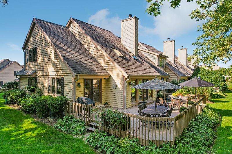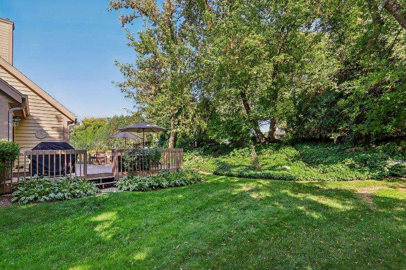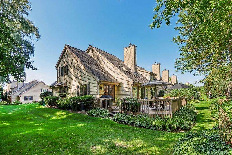 Prime condo location tucked at the back of the association on a quiet cul-de-sac, surrounded by gardens and green lawns. This traditional townhouse offers sunny east and south exposures that fill every room with light. Enjoy treetop and garden views from all windows and relax on the oversized newer deck overlooking private landscaping. A custom floor plan features a level living to dining room with built-ins, wet bar, gas fireplace, perfect for entertaining. The bright white kitchen has Corian counters, wood floors, and a dinette. Upstairs, a lofted library with pull-out couch adjoins the second bedroom and bath. Lower level provides ample storage and expansion potential. Stylish, comfortable, and quietly set in nature's beauty.