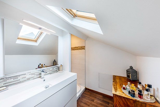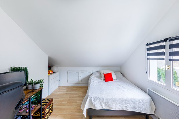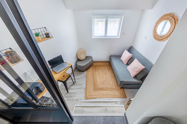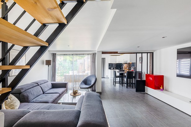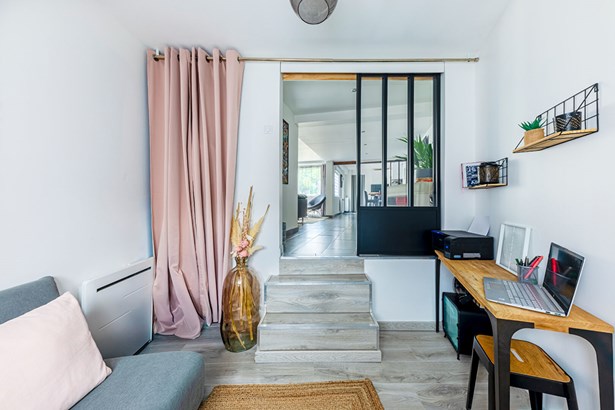 Upon entering, you'll be captivated by the contemporary kitchen opening onto the living room, fully fitted and equipped, with its dining area, designed to combine aesthetics and functionality. Adjacent to it, a practical pantry-laundry room and separate toilets complete this carefully designed ground floor. The bright living room, bathed in light thanks to a large bay window, opens onto a private terrace, ideal for relaxing outdoors. An office, subtly delimited by an elegant workshop-style glass roof, offers a pleasant and independent workspace.