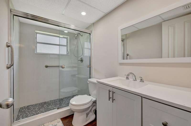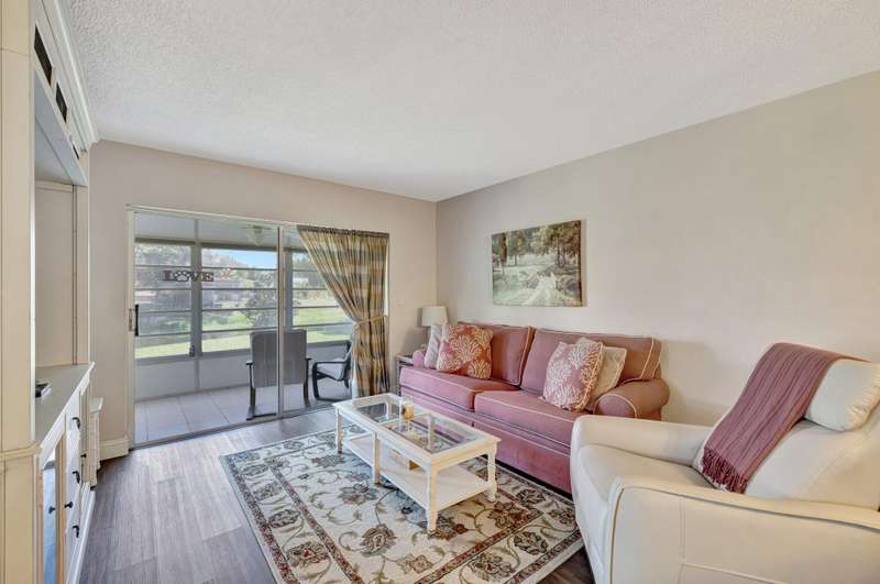 Fully furnished dream condo! Charming 2 bed, 2 bath first-floor corner unit in a well-kept 55+ community. Bright, open layout with updated kitchen featuring granite counters, wood cabinets, and LED lighting. Laminate floors throughout, tile in baths. Both bathrooms fully updated--primary and social bathrooms, with walk-in shower. Tastefully furnished with high-end decor, sleeper sofa, 2023 refrigerator, and brand new mattress in Primary bedroom. Florida room with sun-tinted windows and custom blinds opens to tranquil water-view patio. AC 2022. Enjoy heated pool, clubhouse, and social activities. Near shops and dining!
