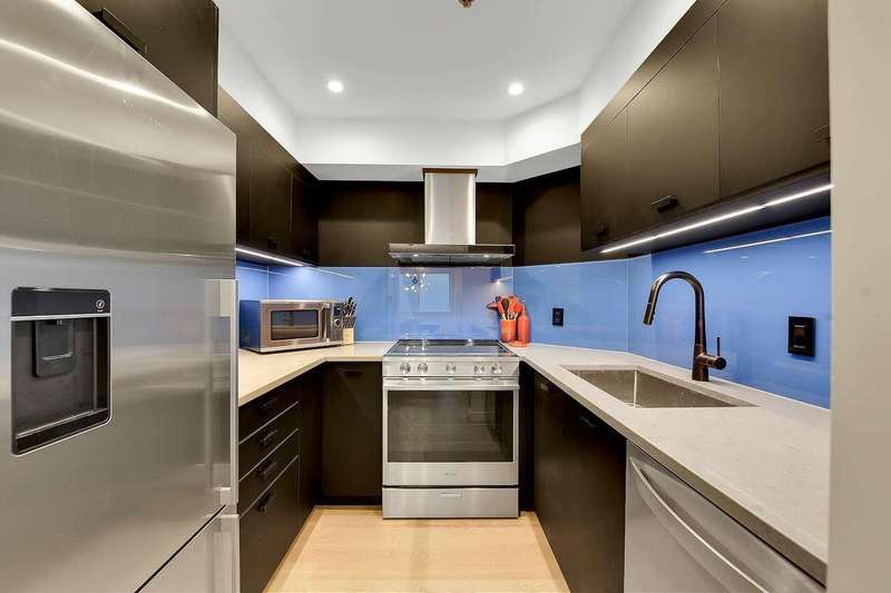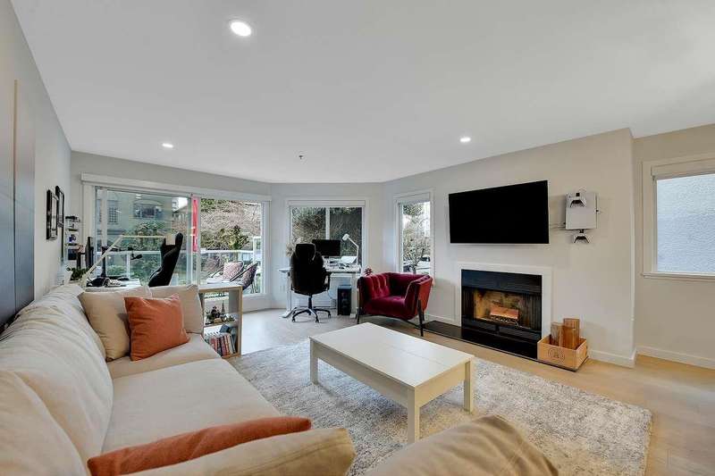 Located on the second floor, this bright and beautifully renovated, sunny south-facing corner 1-bedroom condo features engineered hardwood flooring, high-end appliances, and heated bathroom floors. Smart home upgrades incl: fibre-optic internet, Mysa thermostats. The generous layout feels more spacious thanks to abundant natural light, high ceilings & smart design. Enjoy cozy winter nights by the charming wood-burning fireplace, make the most of summer on your private patio, perfect for BBQs & outdoor entertaining. Incl: 1 storage locker & 1 parking stall. Open House Saturday, Oct 18, 2:00 pm - 4 pm and Sunday, Oct 19, 11:30 am - 1:30 pm
