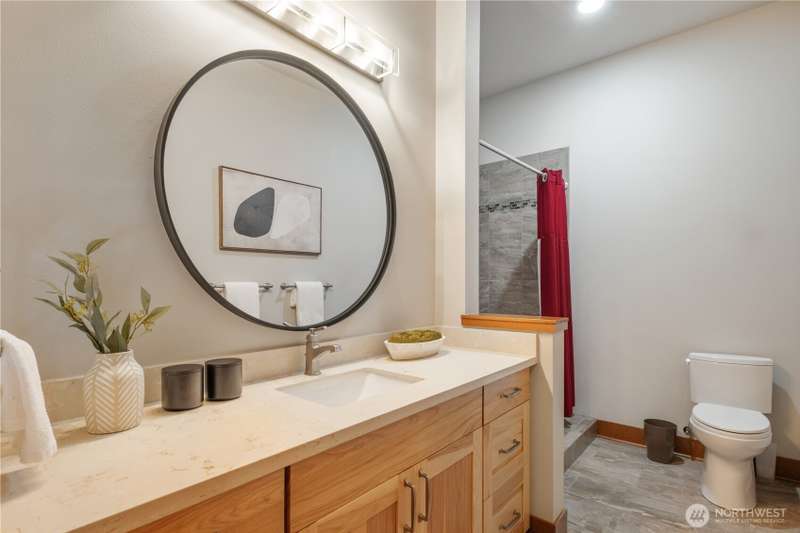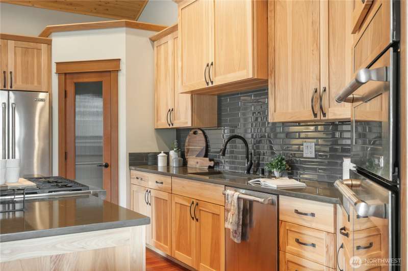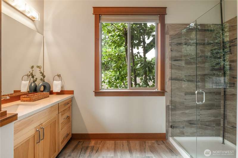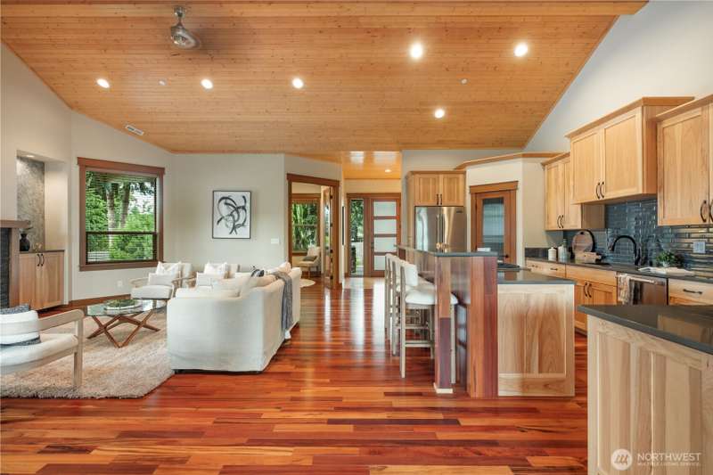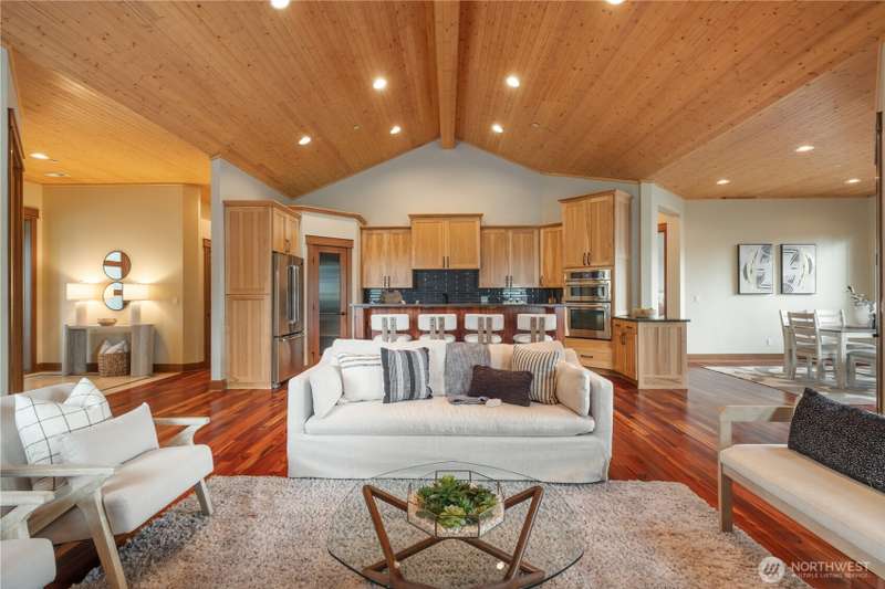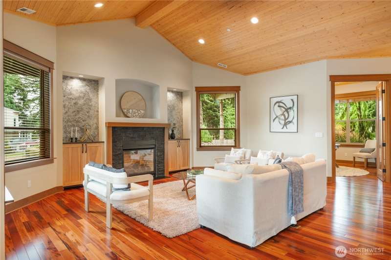 Don’t miss this private lodge style sanctuary! The flat almost ½-acre lot with private drive & gated entry boasts a one-story 2014 custom-built home that is a car collector’s dream! It has an oversized 3-car attached garage + 4-car detached shop w/½ bath & 10’ doors for your RV/boat. The home has a grand covered entry that leads to sizable foyer w/adjacent office, vaulted ceilings & an open great room w/gas fireplace, dining area, & cook’s kitchen. The luxurious primary suite features a spa-style bath. Step outside to the 422+ SF covered patio w/fireplace, built-in BBQ & TV wiring. Fenced yard w/fruit trees and a garden of raised beds- your urban farm to table awaits! Mature landscaping throughout. Sewer connected. Minutes from I-5 and 509.