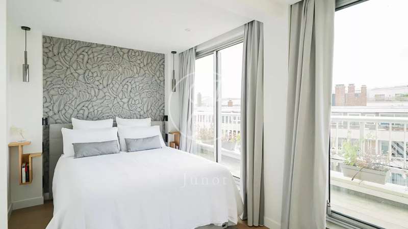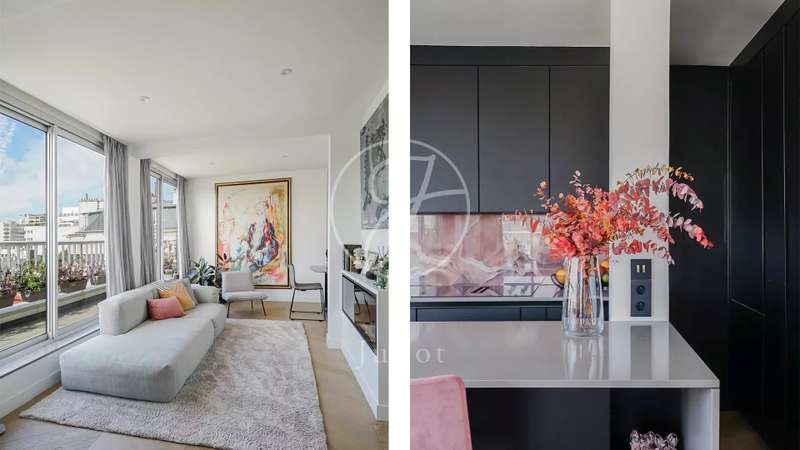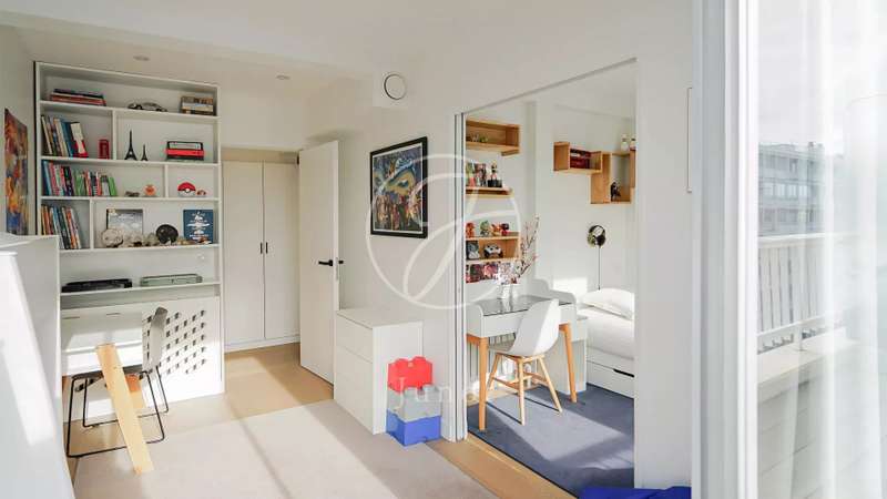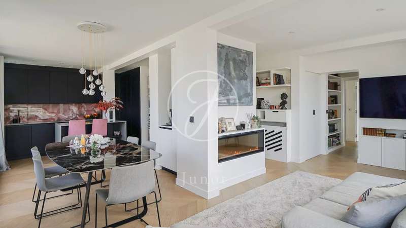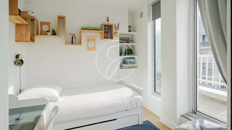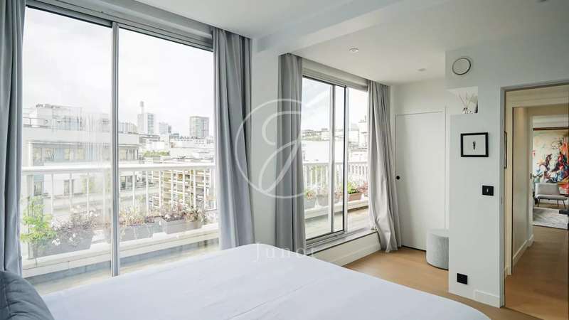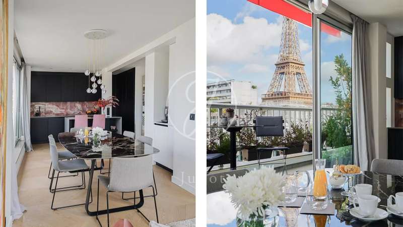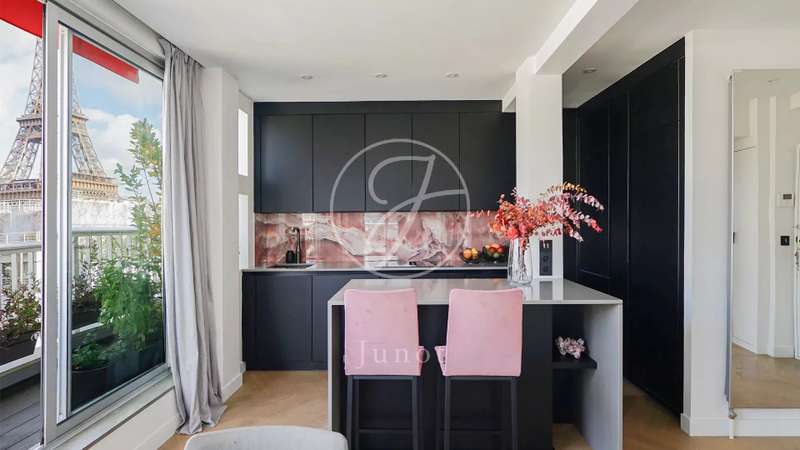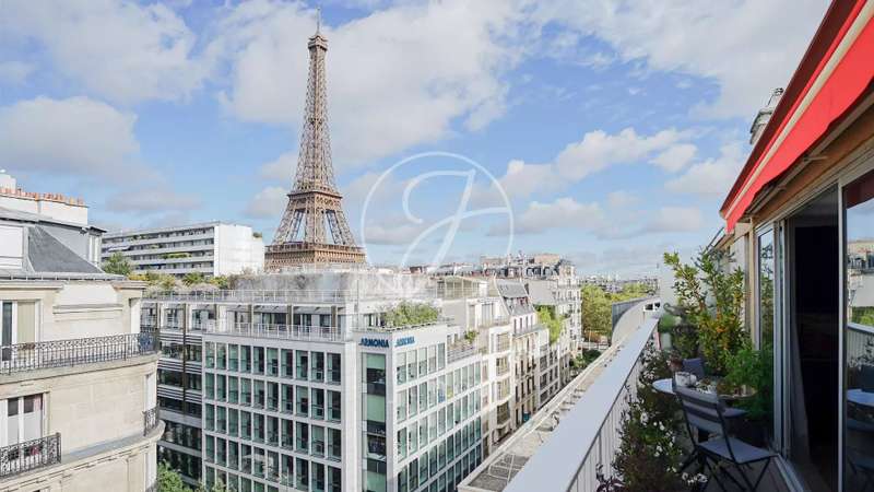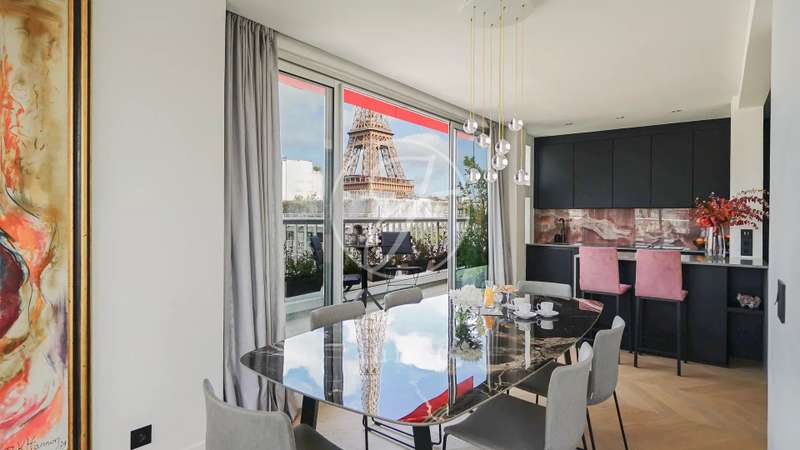 This beautiful, fully renovated apartment is located on the seventh and top floor, accessible by elevator, in a recently built condominium. With a surface area of 86.01sqm Carrez law, it is bathed in light and entirely surrounded by a 29.07sqm balcony. Its compact layout includes a living and dining room with panoramic views of the Eiffel Tower, a semi-open kitchen, two bedrooms, one with en suite bathroom, a shower room with toilet, a dressing room and plenty of storage space. A cellar completes this rare property. This property is ideally located close to the École Bilingue, shops, transport and just two minutes from the Champ de Mars. EXCLUSIVITY.