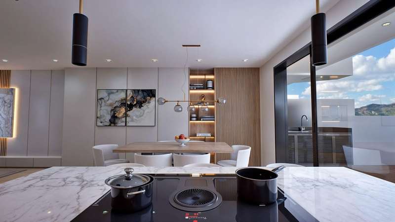 Modern two-bedroom townhouse in a new private condominium called Zion Oasis, with private pool and garden, about 10 minutes from Burgau Beach, for sale in Almádena, Luz, Algarve. This 2-bedroom villa, in a privileged location just a few minutes from the beach, has been thought out in detail to offer convenience, luxury, comfort and privacy to its residents. With two floors and spacious areas, the villa comprises a small garden. Upon entering the house, we have access to the fantastic open-plan living room with dining room and fully-equipped kitchen with modern built-in appliances. There is also access to the terrace with barbecue and private pool, a service bathroom, and the stairs to the upper floor, where the bedrooms are, both with en-suite bathrooms and balconies. This villa is an excellent option for a permanent residence or second home. With stunning beaches nearby, renowned golf courses, quality restaurants, easy access to the EN125 national road and the A22 highway, and Faro International Airport is about an hour away. CHARACTERISTICS: Plot Area: 233 m2 | 2 503 sq ft Area: 140 m2 | 1 507 sq ft Deployment Area: 72 m2 | 775 sq ft Bedrooms: 2 Bathrooms: 3 Energy efficiency: A+ FEATURES: 2 suites Equipped kitchen Balconies Terrace Garden Swimming pool
