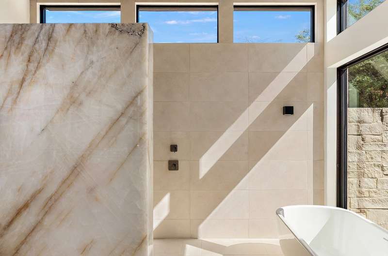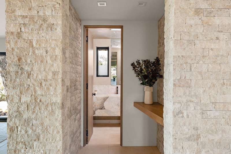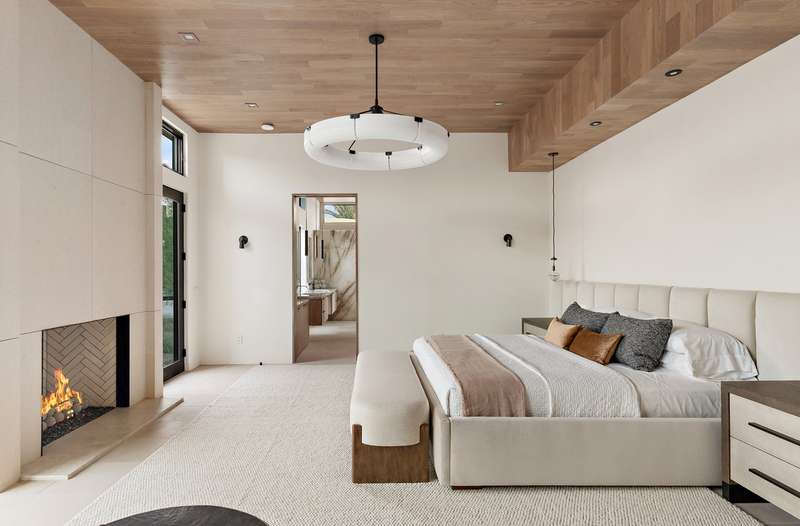 The owner's suite exudes a tranquil ambiance, highlighted by two private Zen gardens and a striking limestone fireplace. Blending elegance with functionality, it offers dual walk-in closets with custom Walnut floor to ceiling cabinetry and stone countertops, along with the convenience of a full-size washer and dryer.