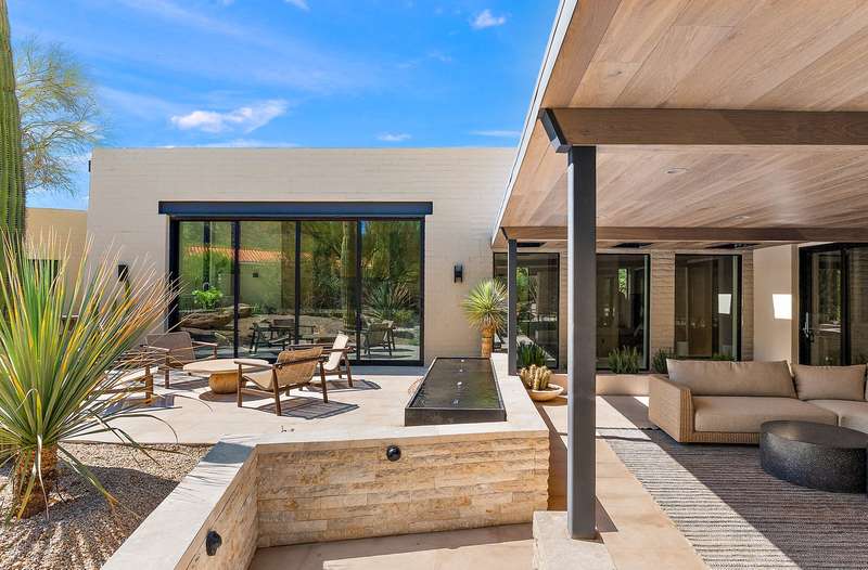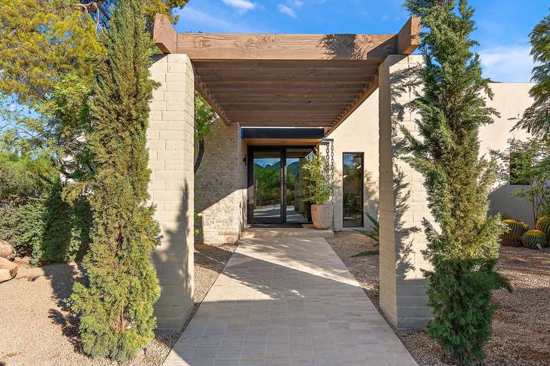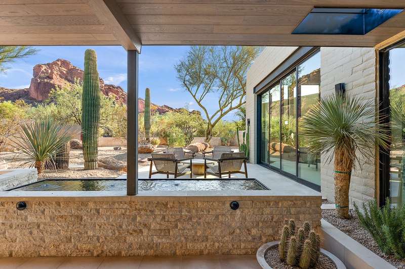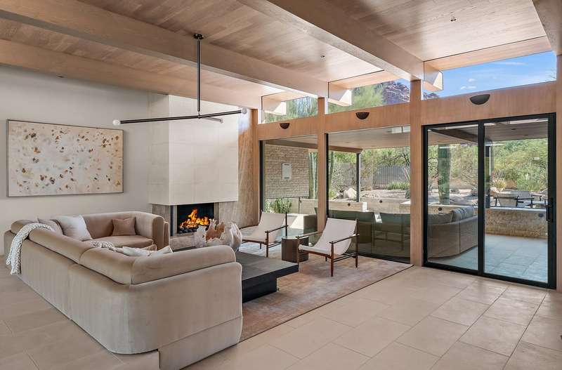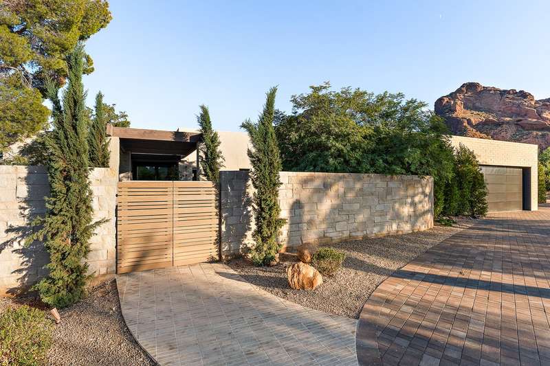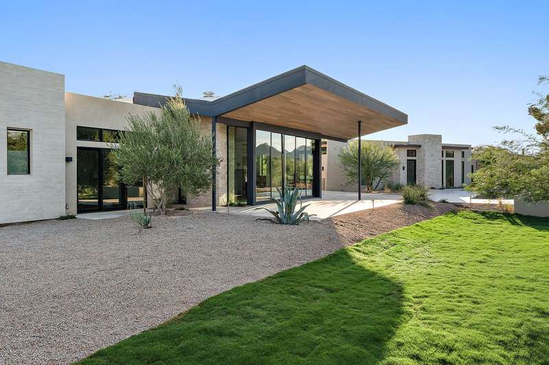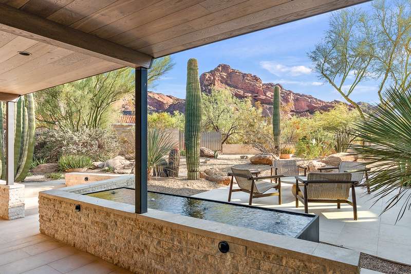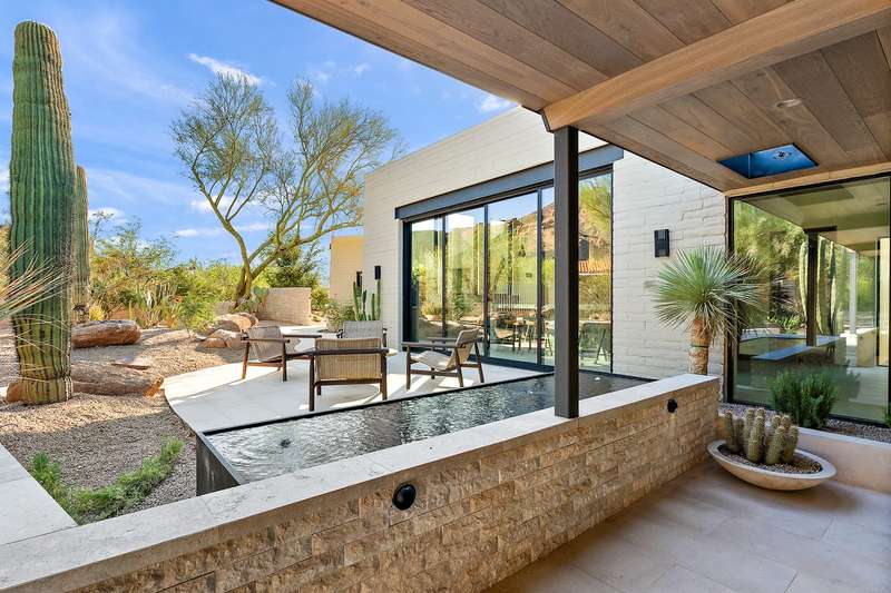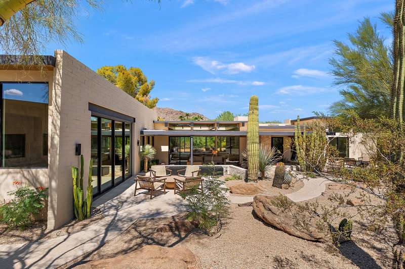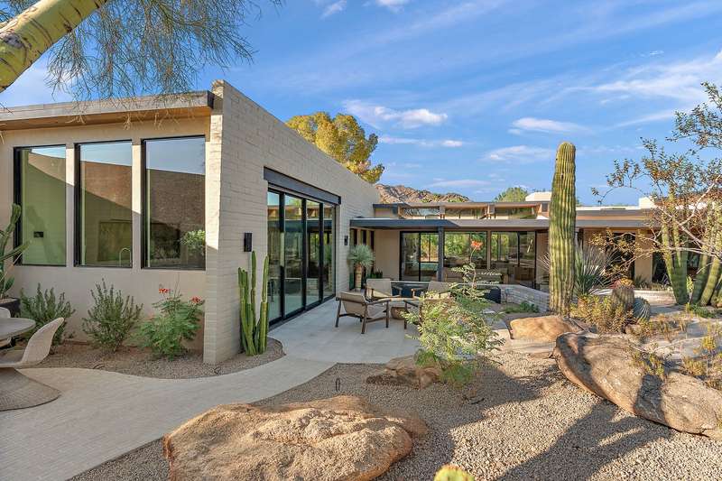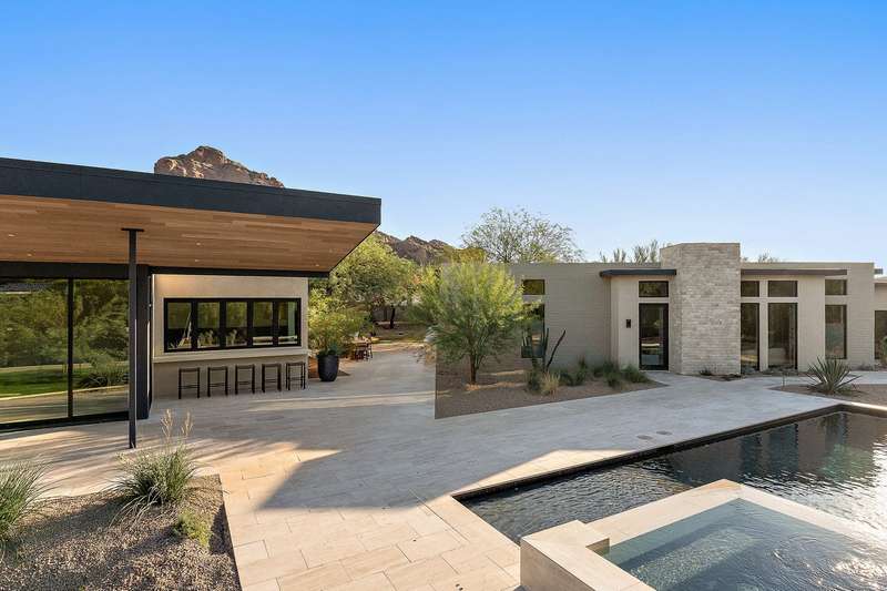 Just completed is a unique, sophisticated new-build by world renowned interior designer Erinn V, in collaboration with Erik Peterson/PHX Architecture. The estate represents a rare fusion of Arizona mid-century architecture, design heritage, & contemporary luxury in Paradise Valley's most desired location, with majestic views of Camelback, Mummy & Phoenix Mountain Preserve. The 1-acre estate includes 6985 sq ft of living space across the main & guest house with walls of glass capturing majestic mountain views & skylights flooding the interiors with natural light. Exceptional workmanship & top-quality materials include honed, oversized limestone flooring, bleached white oak ceilings, custom walnut millwork, Roman clay finishes, custom stonework & natural imported stone countertops. Enjoy the outdoors with lush landscaping, water fountains, and abundant seating areas that create a resort-like setting, while the 40' x 18' zero-edge pool and spa provide a centerpiece for leisure and entertaining.
