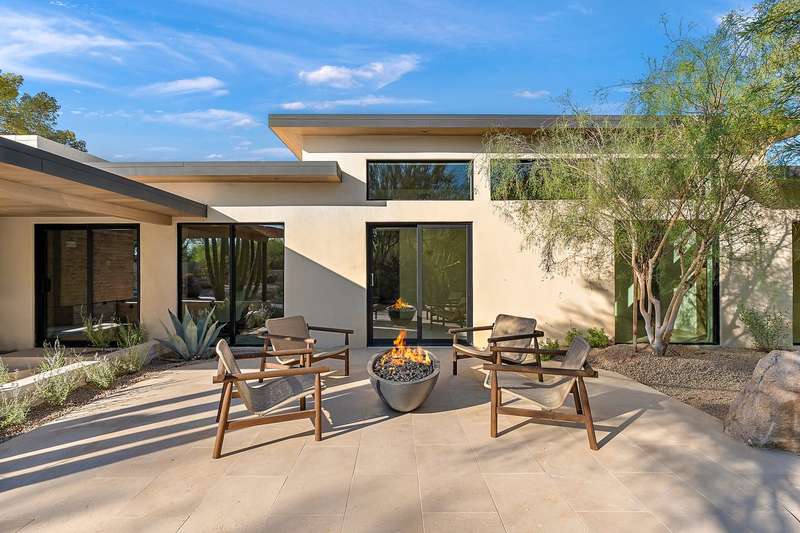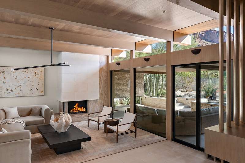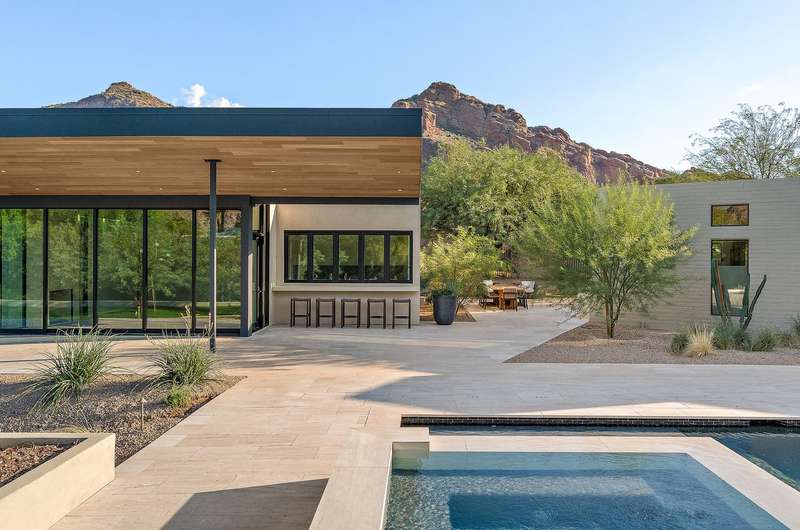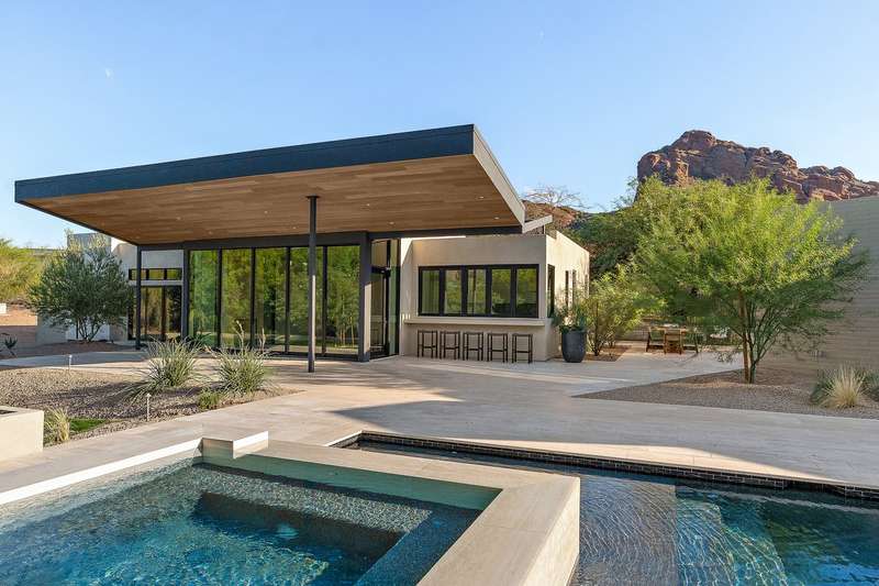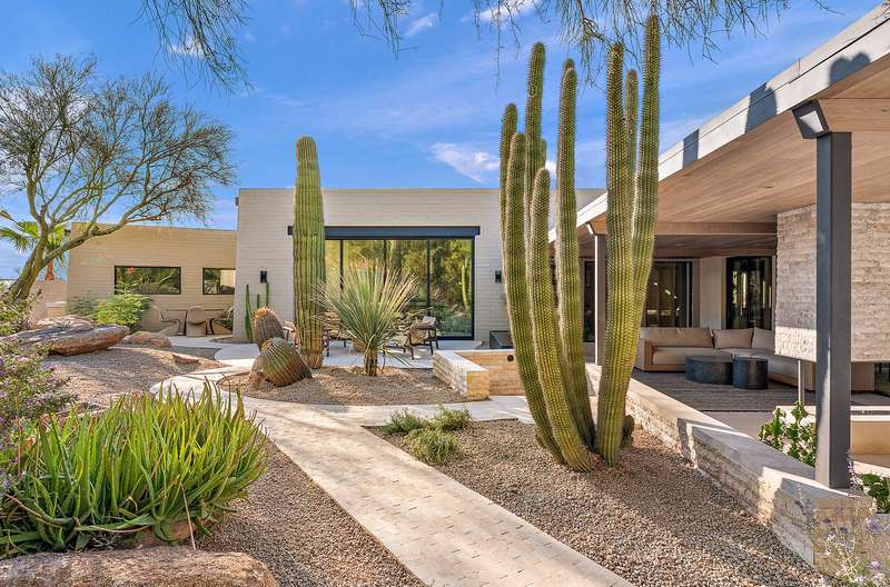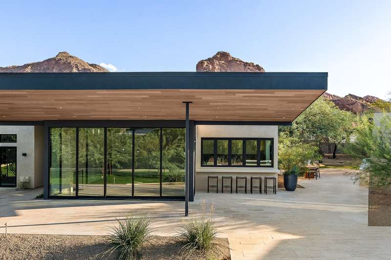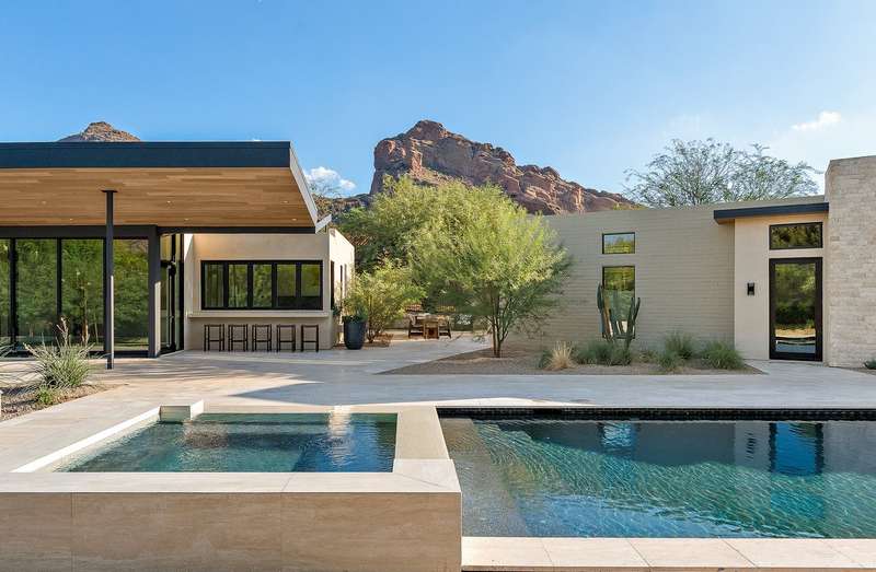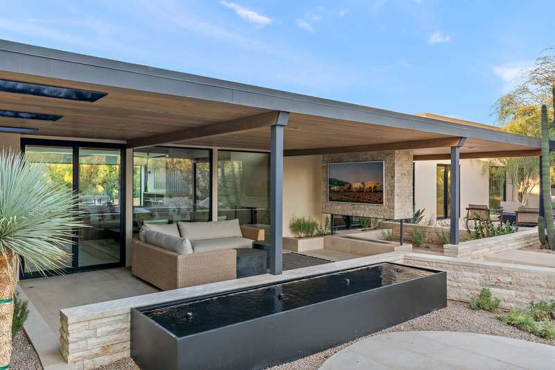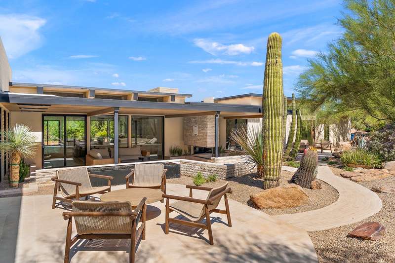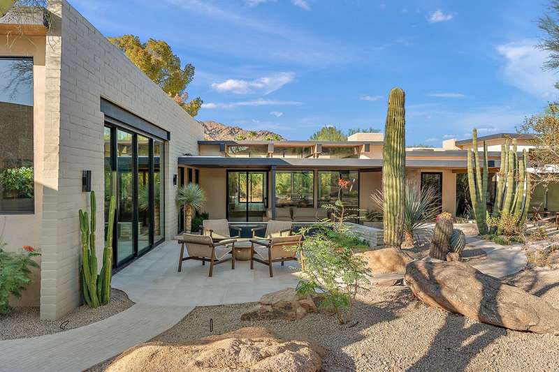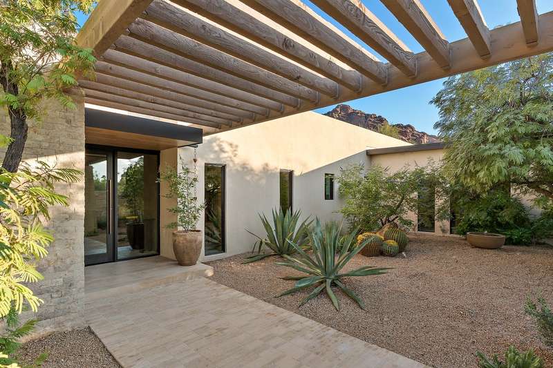 Just completed is a unique, sophisticated new-build by world renowned interior designer Erinn V, in collaboration with Erik Peterson/PHX Architecture. The estate represents a rare fusion of Arizona mid-century architecture, design heritage, & contemporary luxury in Paradise Valley's most desired location, with majestic views of Camelback, Mummy & Phoenix Mountain Preserve. The 1-acre estate includes 6985 sq ft of living space across the main & guest house with walls of glass capturing majestic mountain views & skylights flooding the interiors with natural light. Exceptional workmanship & top-quality materials include honed, oversized limestone flooring, bleached white oak ceilings, custom walnut millwork, Roman clay finishes, custom stonework & natural imported stone countertops. Enjoy the outdoors with lush landscaping, water fountains, and abundant seating areas that create a resort-like setting, while the 40' x 18' zero-edge pool and spa provide a centerpiece for leisure and entertaining.