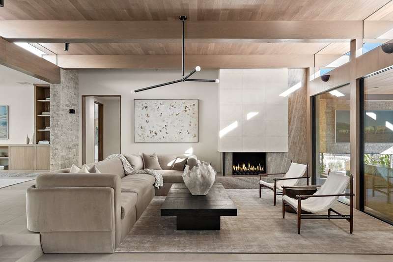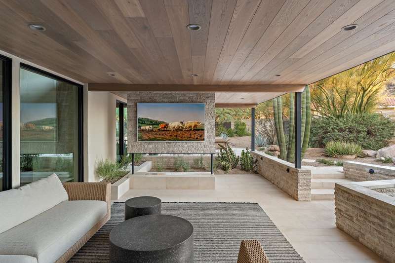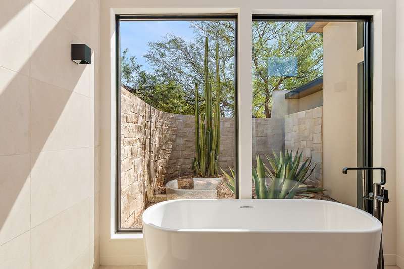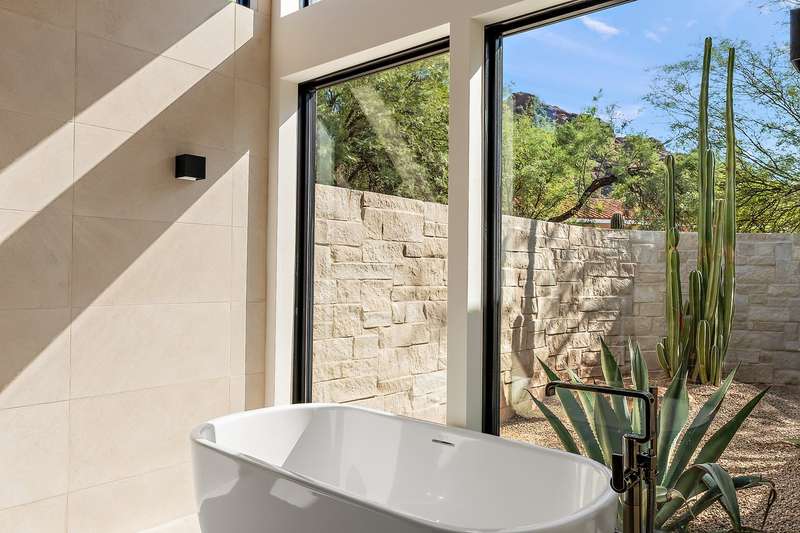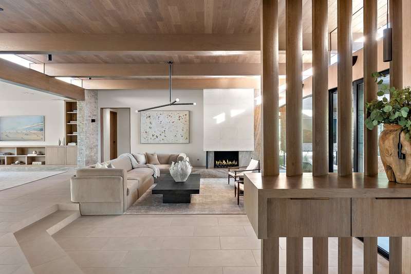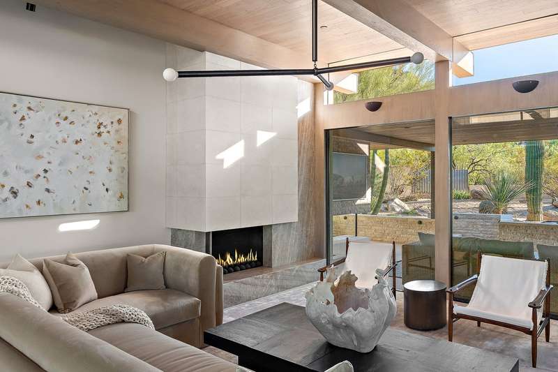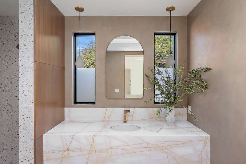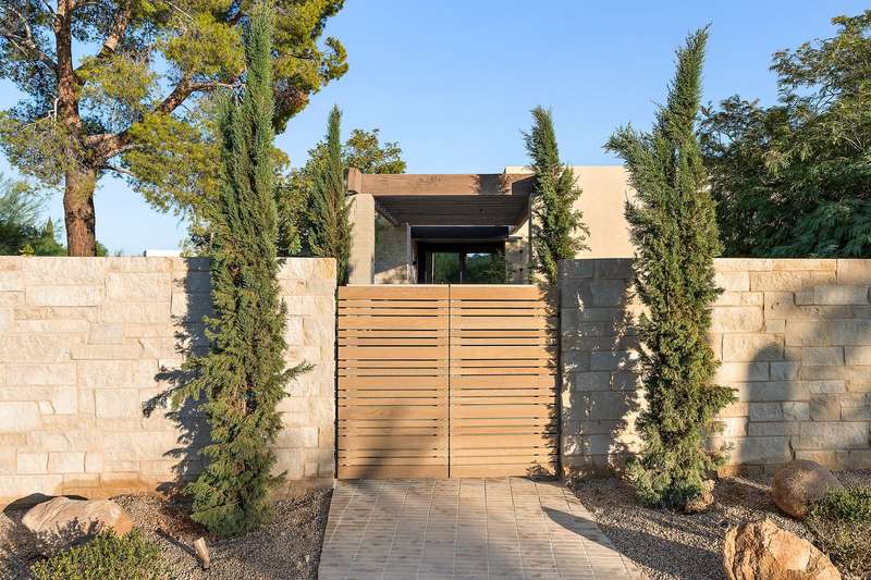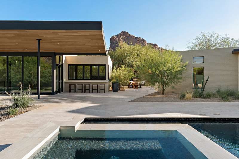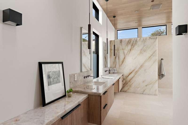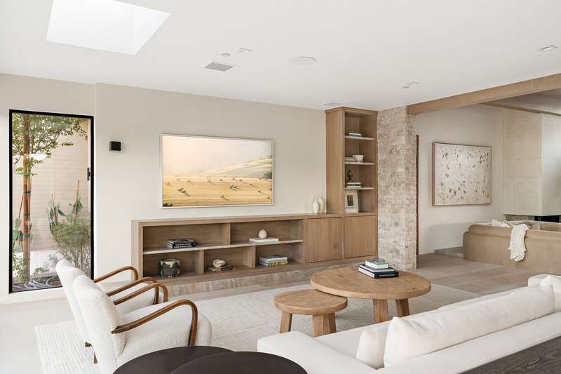 Just completed is a unique, sophisticated new-build by world renowned interior designer Erinn V, in collaboration with Erik Peterson/PHX Architecture. The estate represents a rare fusion of Arizona mid-century architecture, design heritage, & contemporary luxury in Paradise Valley's most desired location, with majestic views of Camelback, Mummy & Phoenix Mountain Preserve. The 1-acre estate includes 6985 sq ft of living space across the main & guest house with walls of glass capturing majestic mountain views & skylights flooding the interiors with natural light. Exceptional workmanship & top-quality materials include honed, oversized limestone flooring, bleached white oak ceilings, custom walnut millwork, Roman clay finishes, custom stonework & natural imported stone countertops. Enjoy the outdoors with lush landscaping, water fountains, and abundant seating areas that create a resort-like setting, while the 40' x 18' zero-edge pool and spa provide a centerpiece for leisure and entertaining.
