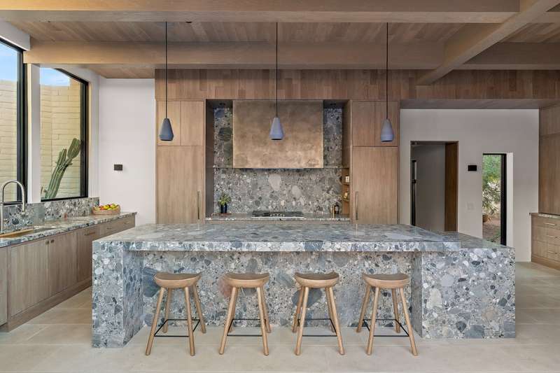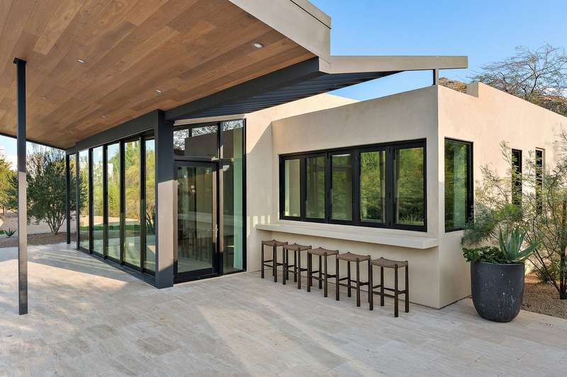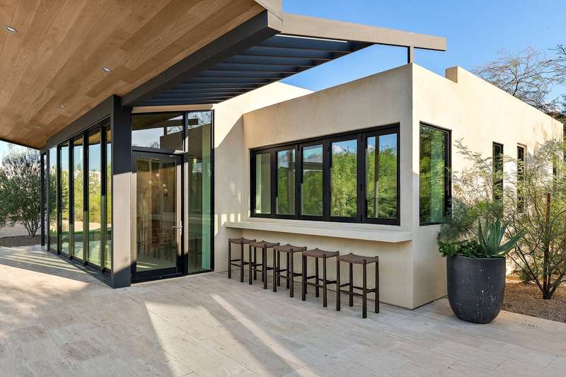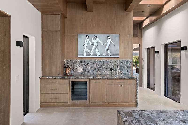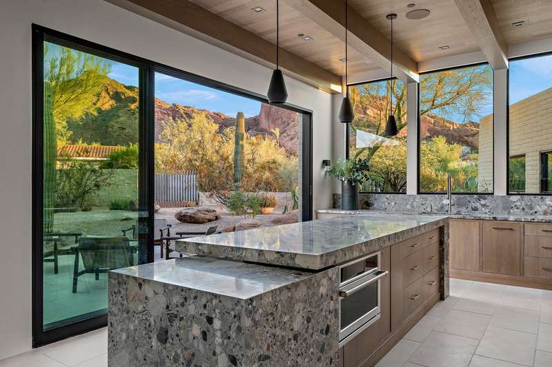 The main house features an impressive Chef's kitchen with walls of glass showcasing up-close views of iconic Camelback Mountain. Designed for both beauty and functionality, the kitchen is equipped with Monogram appliances, custom hand-finished walnut cabinets with white bronze pulls, butler's pantry and stone island clad in Ceppo Breccia slabs from Italy. Oversized sliding doors open the kitchen to a patio with fire features, a water feature and outdoor TV surrounded by beautiful lush desert landscaping.