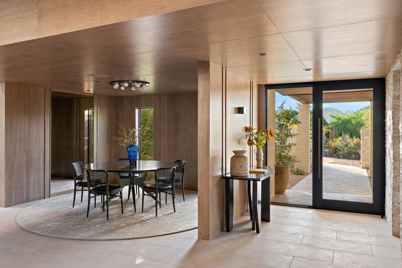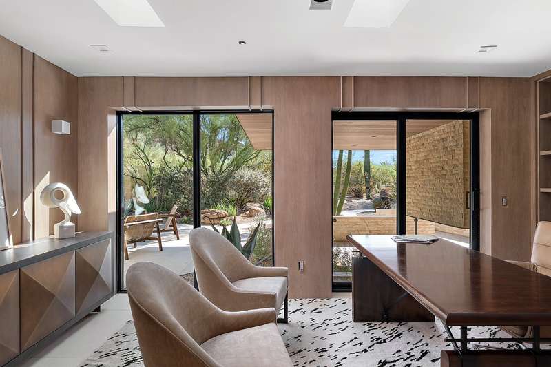 The private office makes a bold statement with bleached walnut millwork, built-in shelving, and expansive windows that frame breathtaking views of Camelback Mountain.